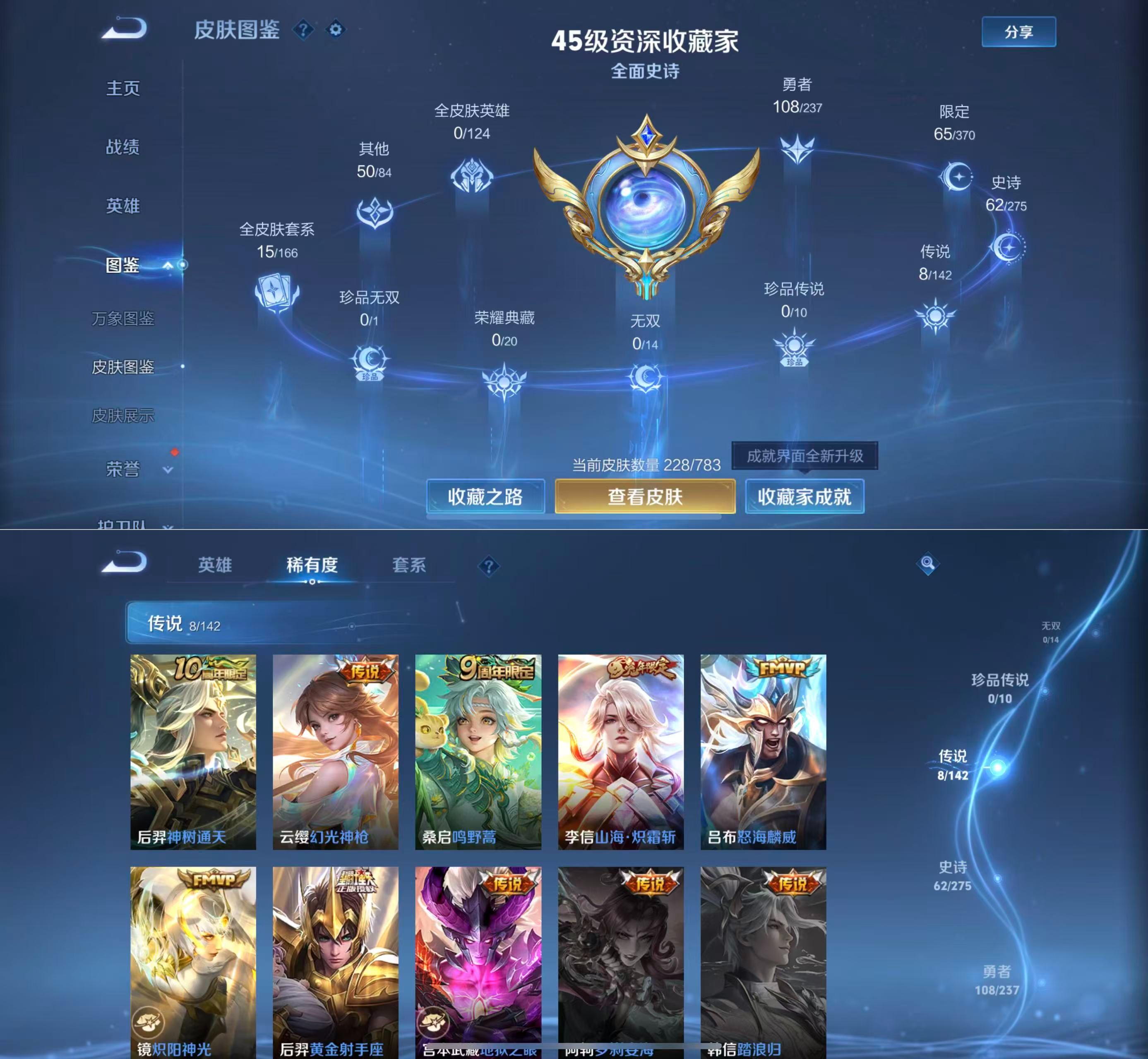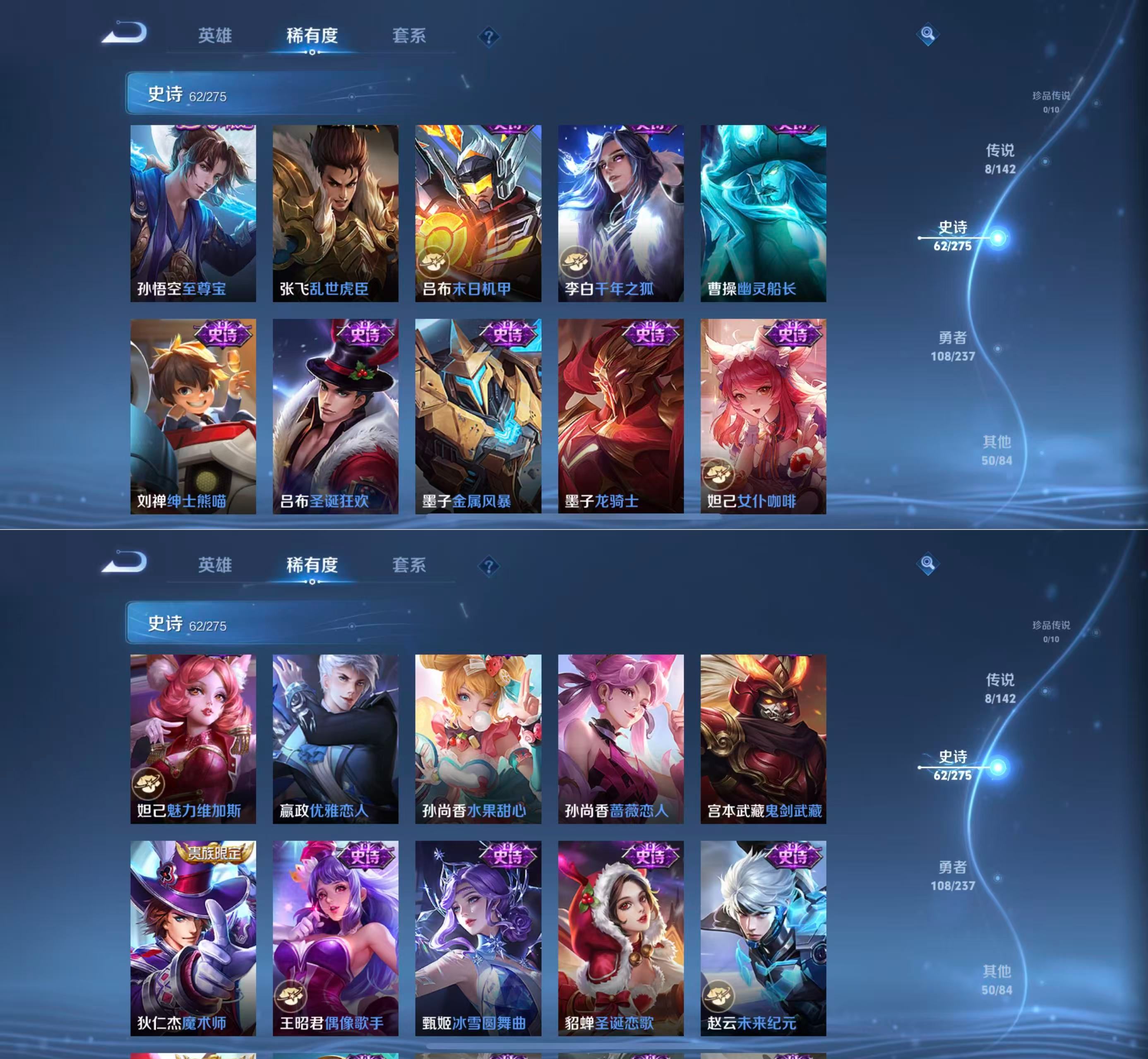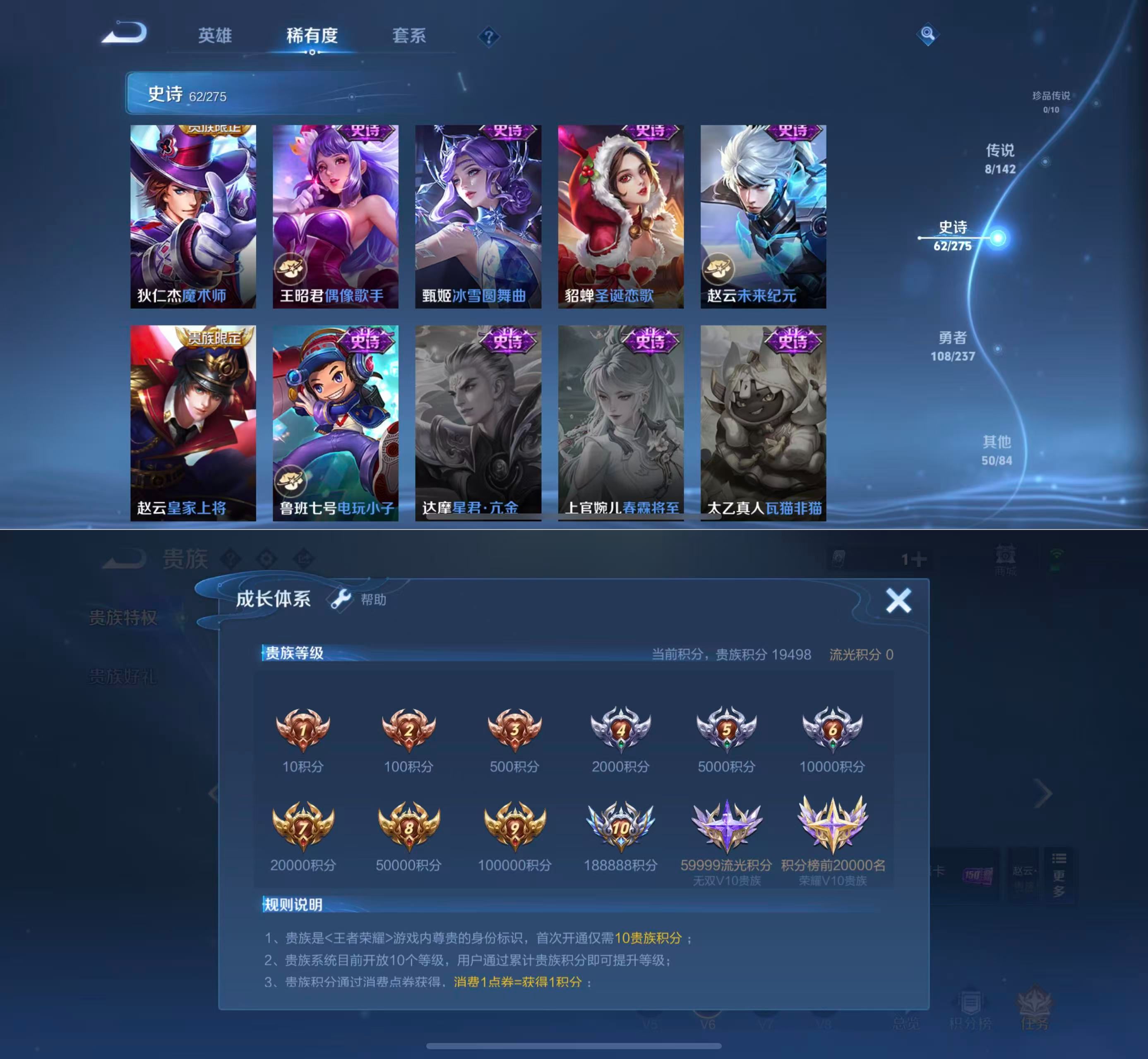 贵族等级:v6皮肤数:228传说品质8 情人节限定2 生肖限定2 英雄数:126
