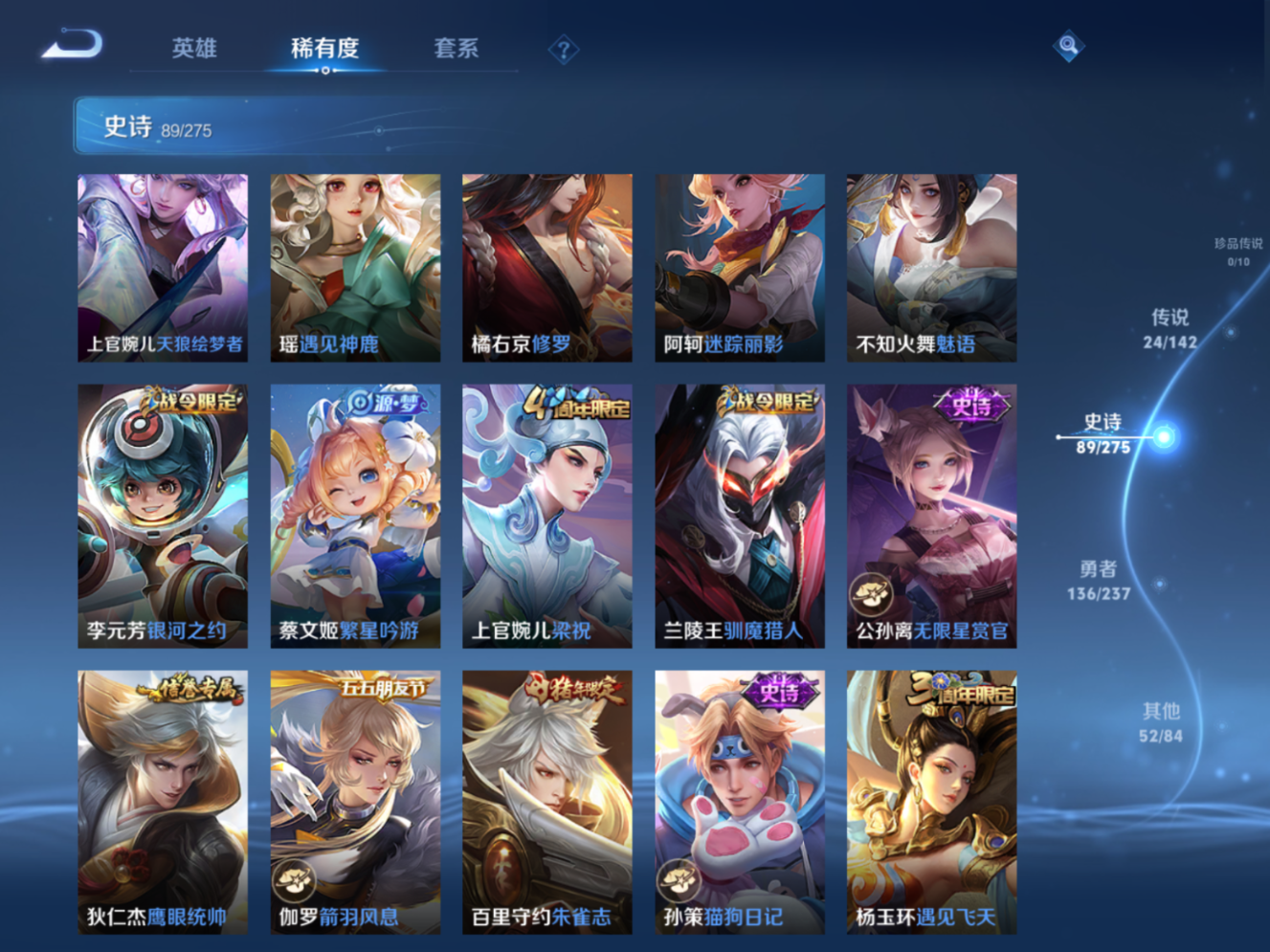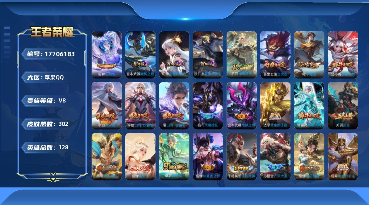 贵族等级:v8皮肤数:302传说品质24 生肖限定9 情人节限定2 荣耀典藏1 英雄数:128