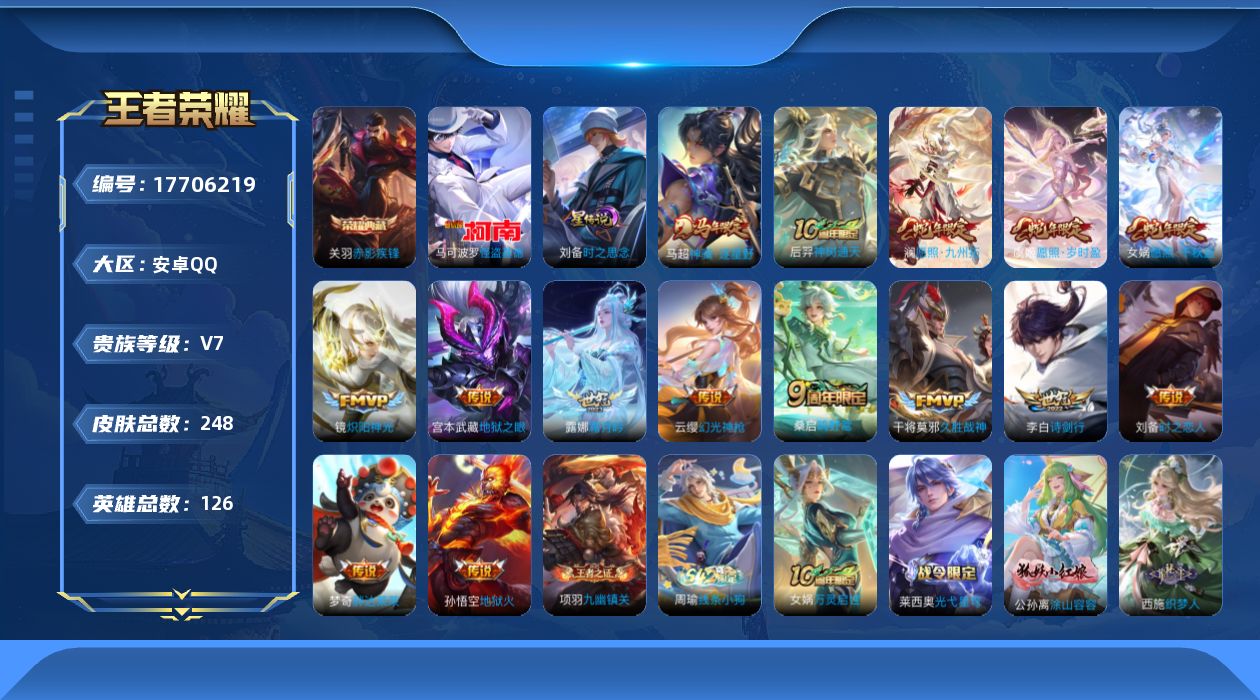 贵族等级:v7皮肤数:248传说品质15 荣耀典藏1 生肖限定4 情人节限定1 珍品传说1 英雄数:126