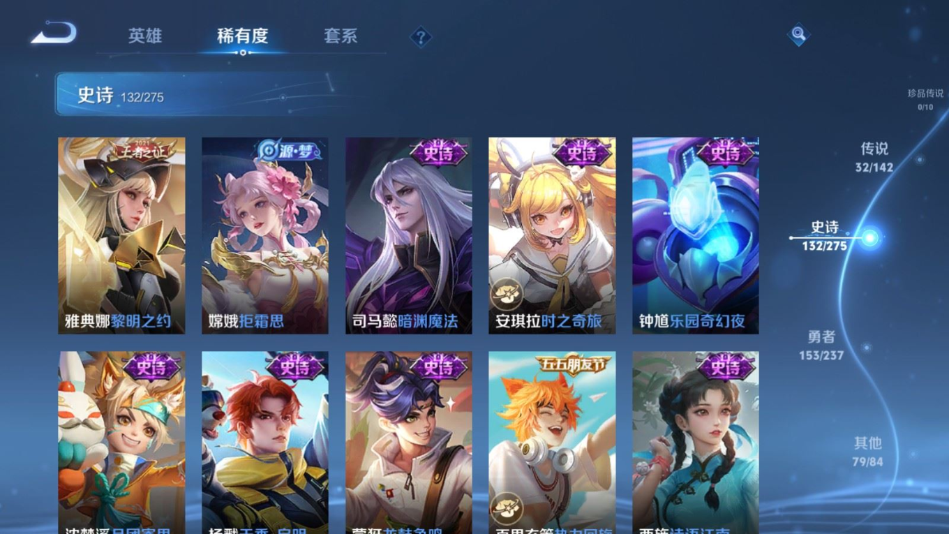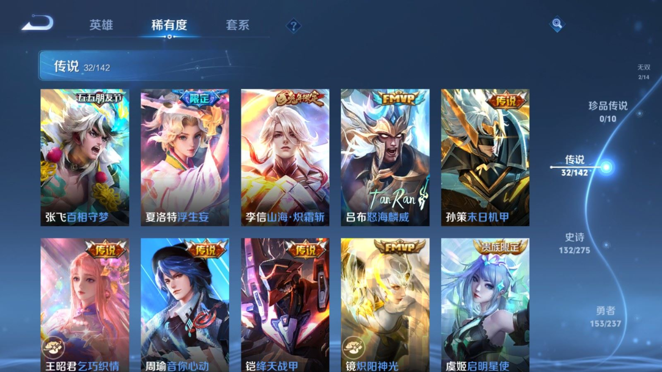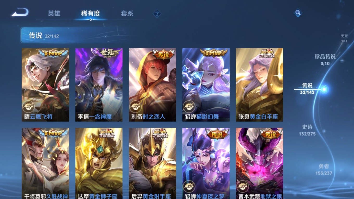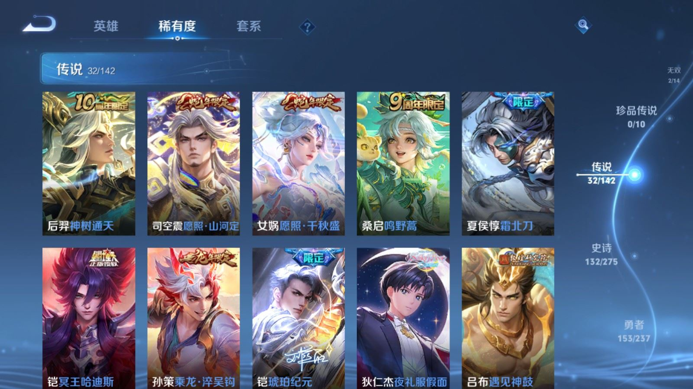 传说品质_后羿_黄金射手座传说品质_后羿_神树通天传说品质_司空震_愿照·山河定传说品质_吕布_遇见神鼓传说品质_吕布_天魔缭乱传说品质_吕布_怒海麟威传说品质_干将莫邪_久胜战神传说品质_宫本武藏_地狱之眼传说品质_周瑜_音你心动传说品质_镜_炽阳神光传说品质_貂蝉_猫影幻舞传说品质_貂蝉_仲夏夜之梦传说品质_李信_一念神魔传说品质_李信_山海·炽霜斩传说品质_夏侯惇_霜北刀传说品质_桑启_鸣野蒿传说品质_刘备_时之恋人传说品质_张良_黄金白羊座传说品质_女娲_愿照·千秋盛传说品质_张飞_百相守梦传说品质_夏洛特_浮生妄传说品质_曜_云鹰飞将传说品质_孙策_末日机甲传说品质_孙策_乘龙·淬吴钩传说品质_狄仁杰_超时空战士传说品质_狄仁杰_夜礼服假面传说品质_达摩_黄金狮子座传说品质_铠_绛天战甲传说品质_铠_琥珀纪元传说品质_铠_冥王哈迪斯传说品质_虞姬_启明星使传说品质_王昭君_乞巧织情