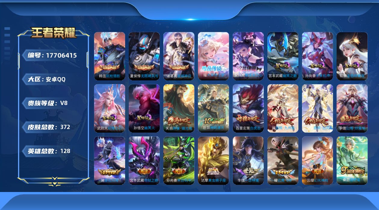 贵族等级:v8皮肤数:372生肖限定6 传说品质24 荣耀典藏3 情人节限定1 珍品传说2 英雄数:128