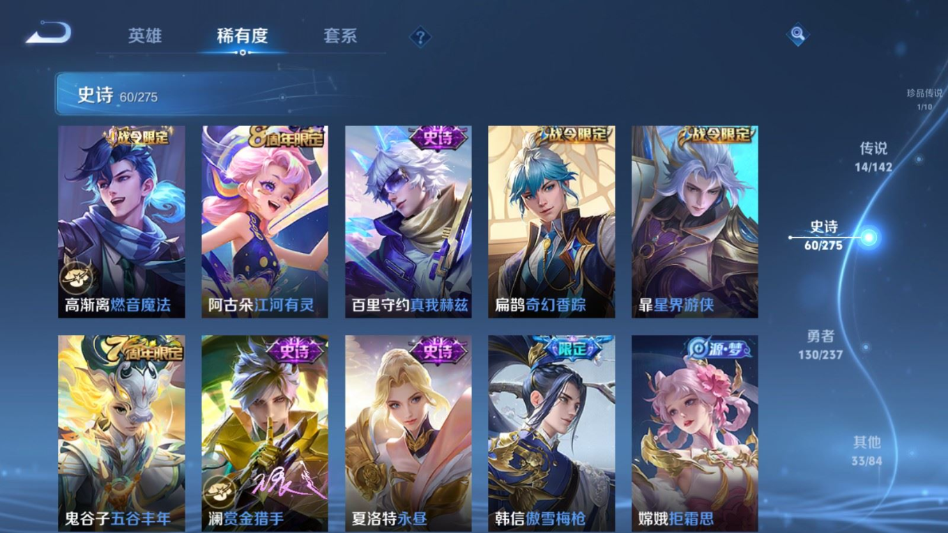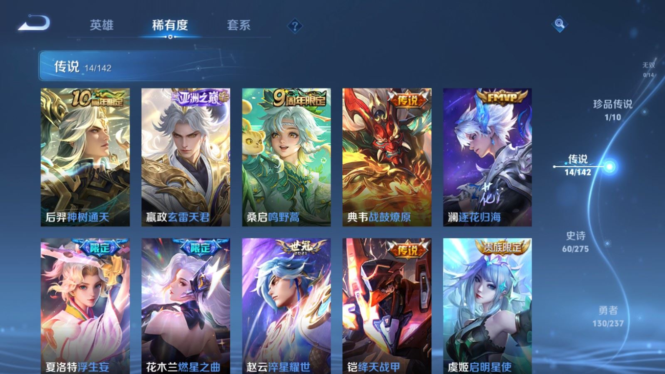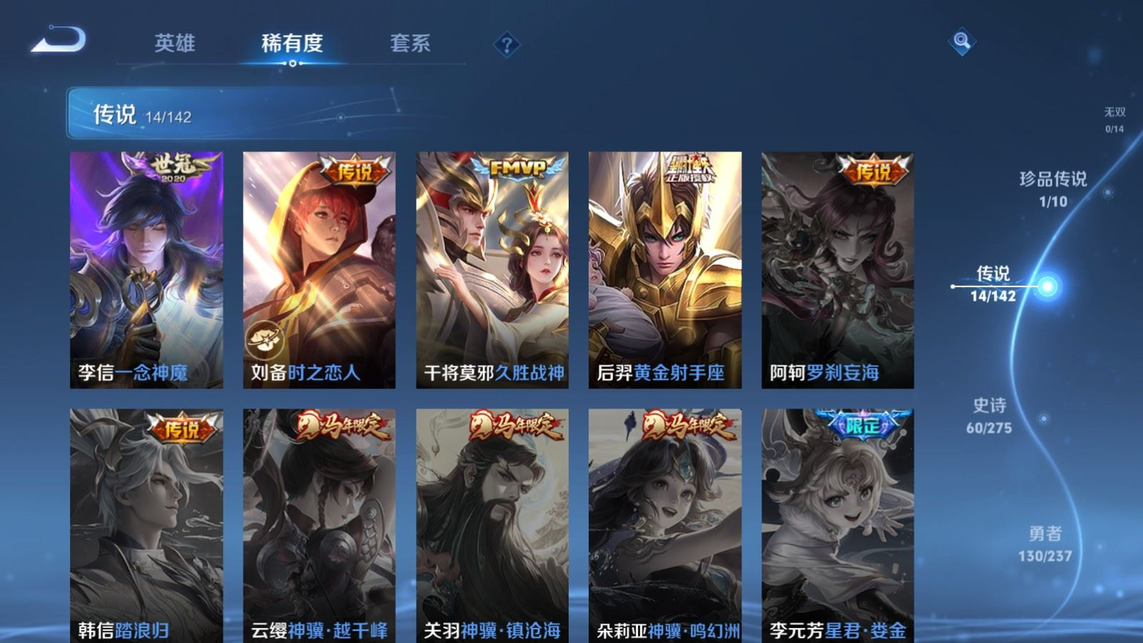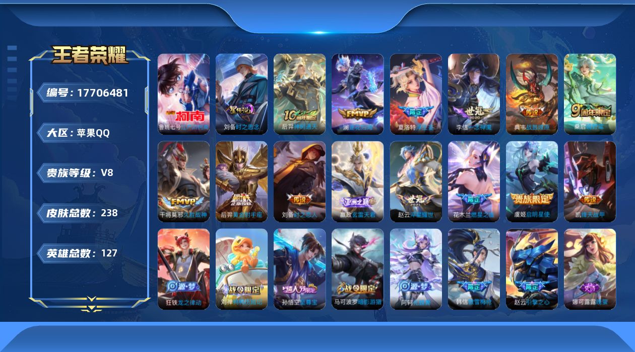 贵族等级:v8皮肤数:238传说品质14 情人节限定1 珍品传说1 英雄数:127