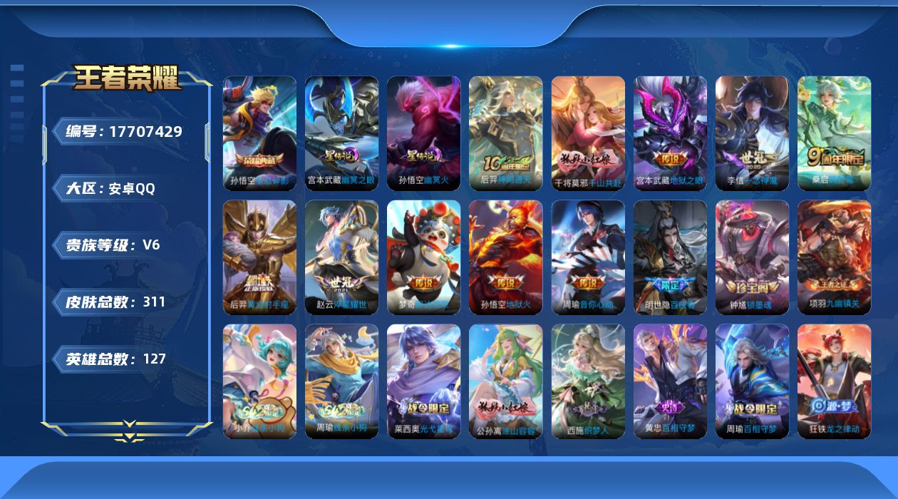 贵族等级:v6皮肤数:311传说品质10 情人节限定2 荣耀典藏1 英雄数:127