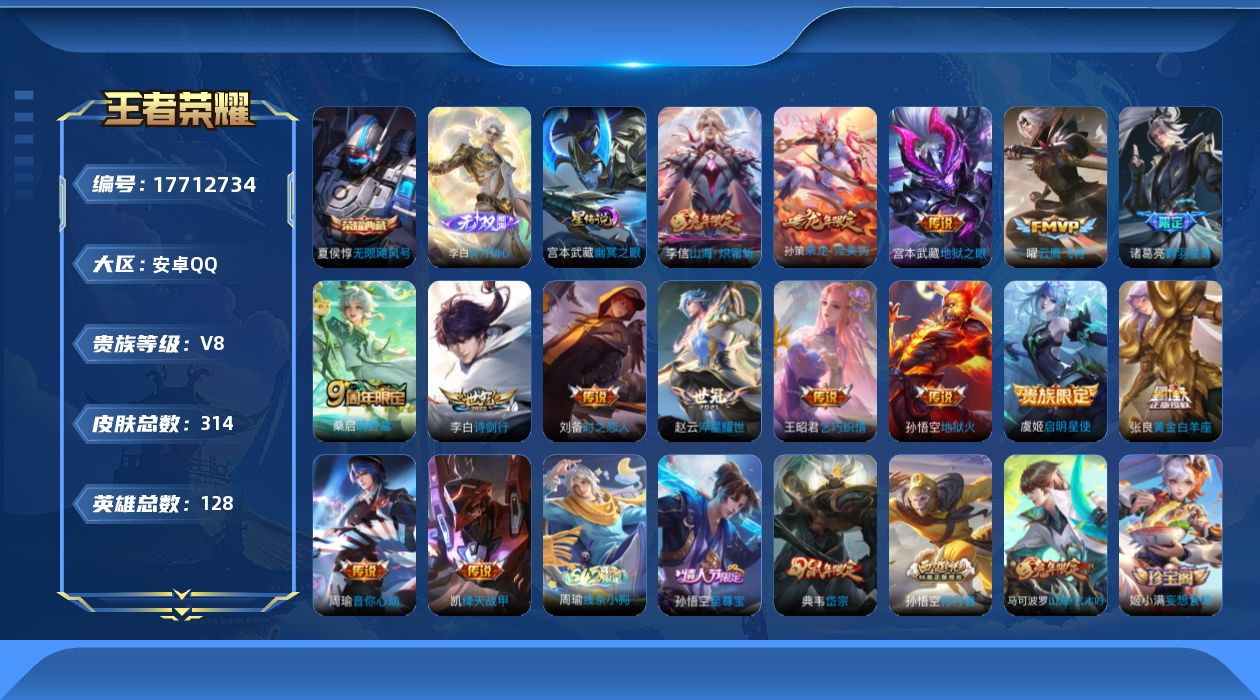 贵族等级:v8皮肤数:314生肖限定6 传说品质15 情人节限定1 荣耀典藏1 无双1 英雄数:128