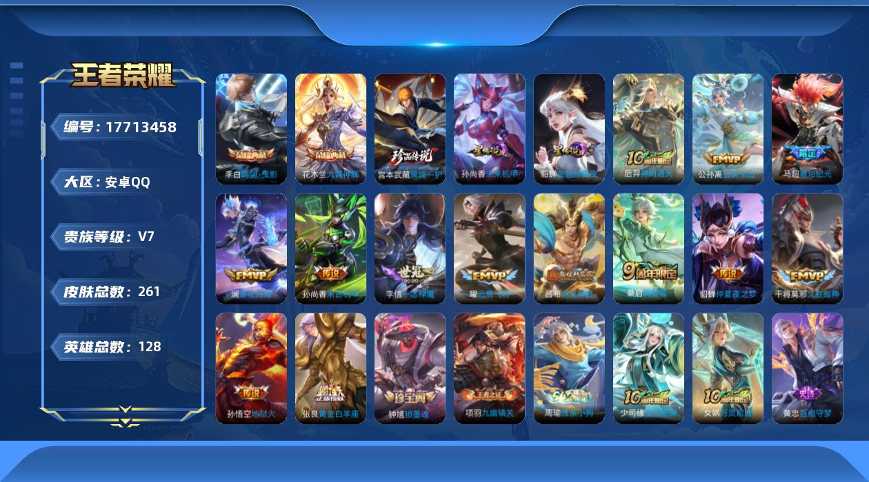 贵族等级:v7皮肤数:261传说品质13 生肖限定1 情人节限定1 珍品传说1 荣耀典藏2 英雄数:128