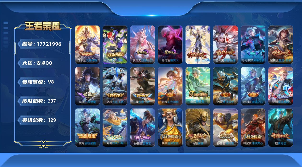 贵族等级:v8皮肤数:337传说品质13 生肖限定4 情人节限定1 荣耀典藏1 珍品传说1 英雄数:129