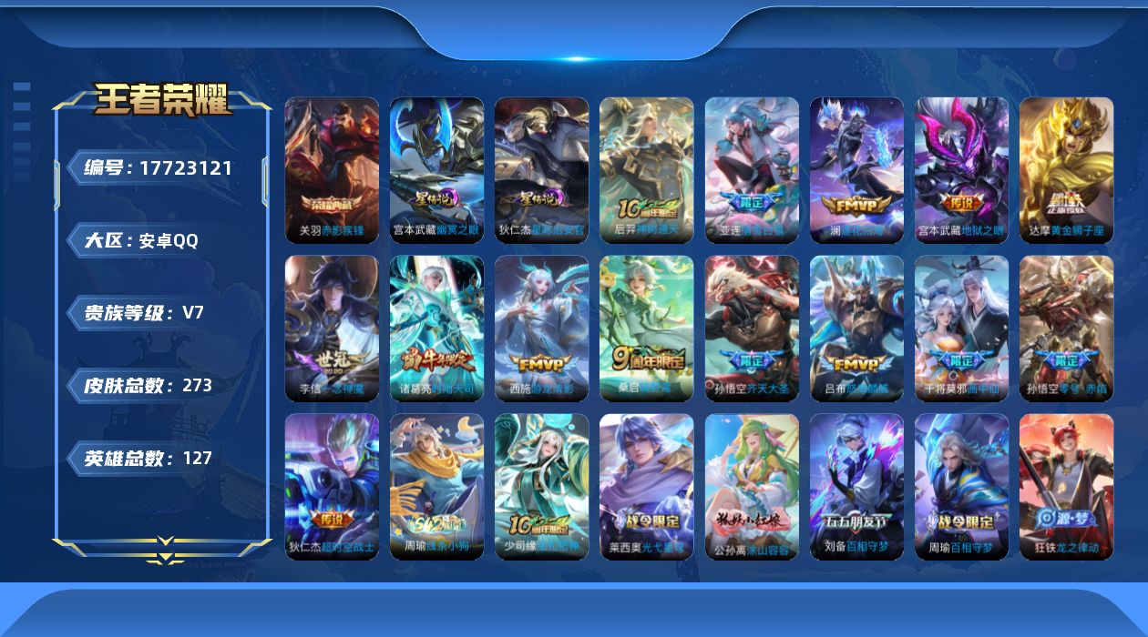 贵族等级:v7皮肤数:273传说品质14 荣耀典藏1 生肖限定2 情人节限定1 英雄数:127