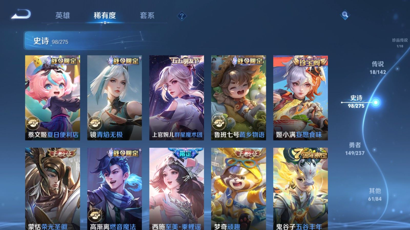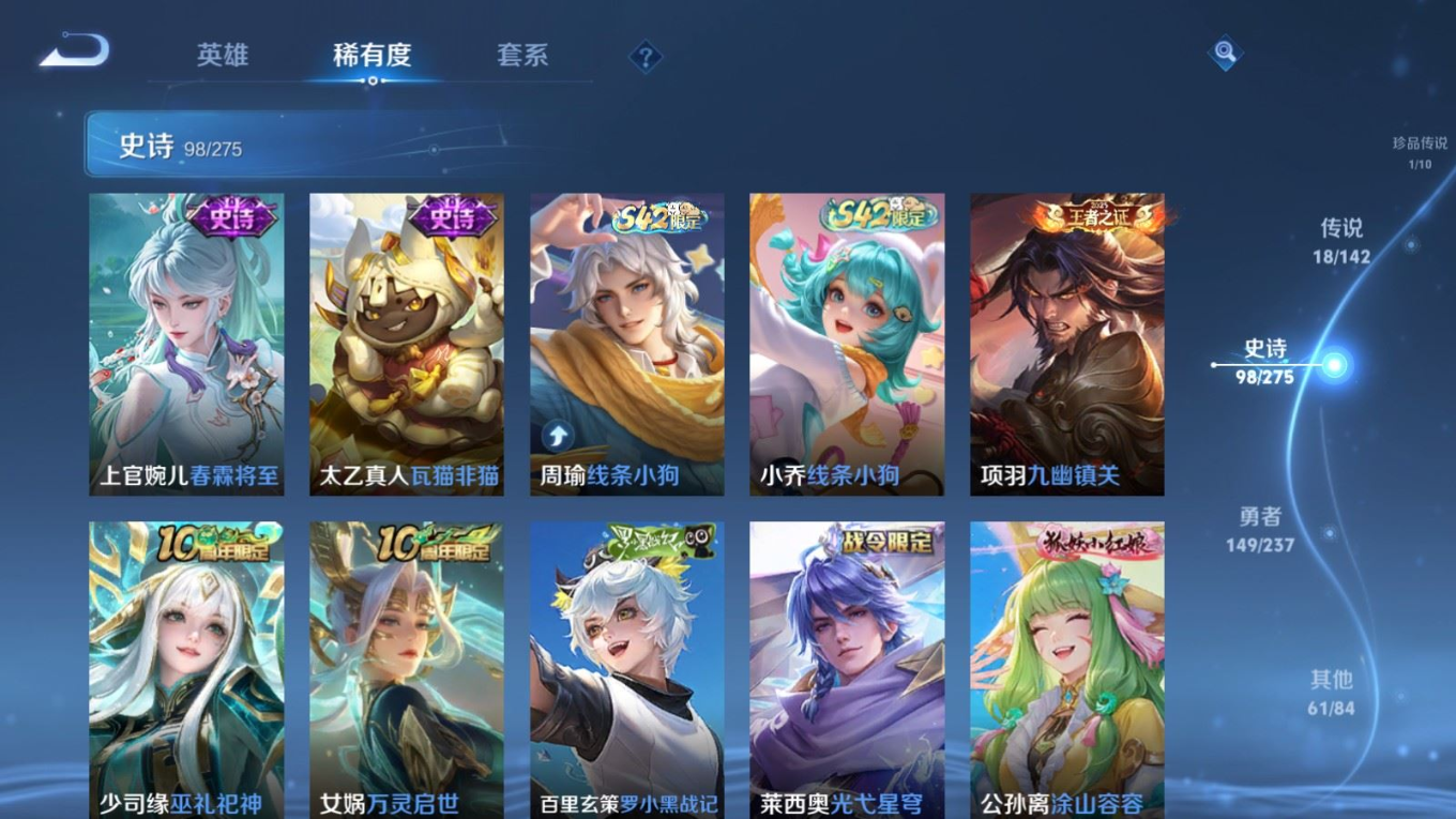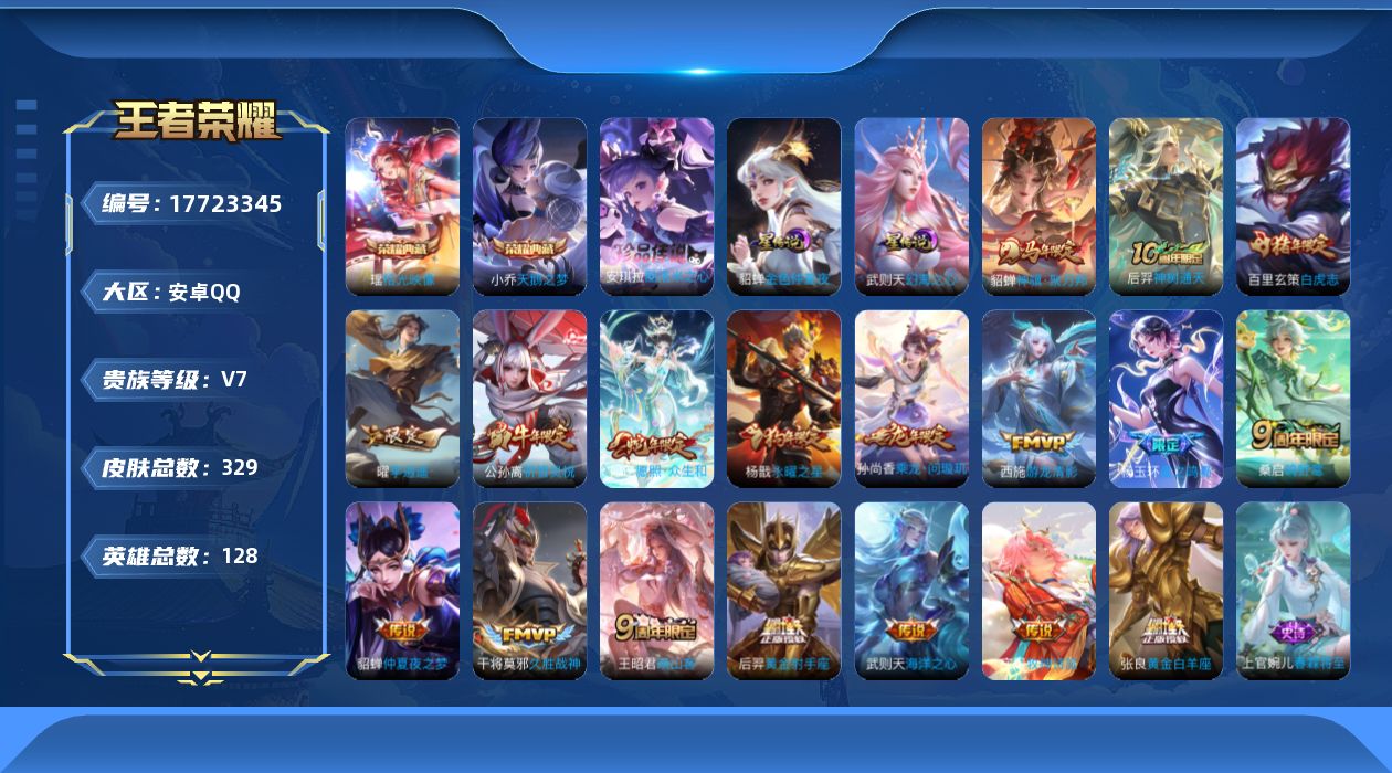 贵族等级:v7皮肤数:329传说品质18 生肖限定6 荣耀典藏2 珍品传说1 英雄数:128
