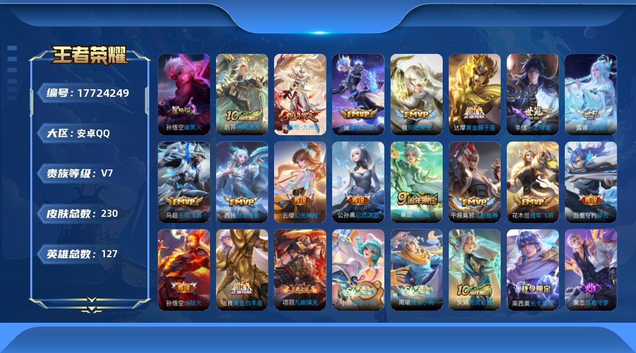 贵族等级:v7皮肤数:230传说品质17 生肖限定1 英雄数:127