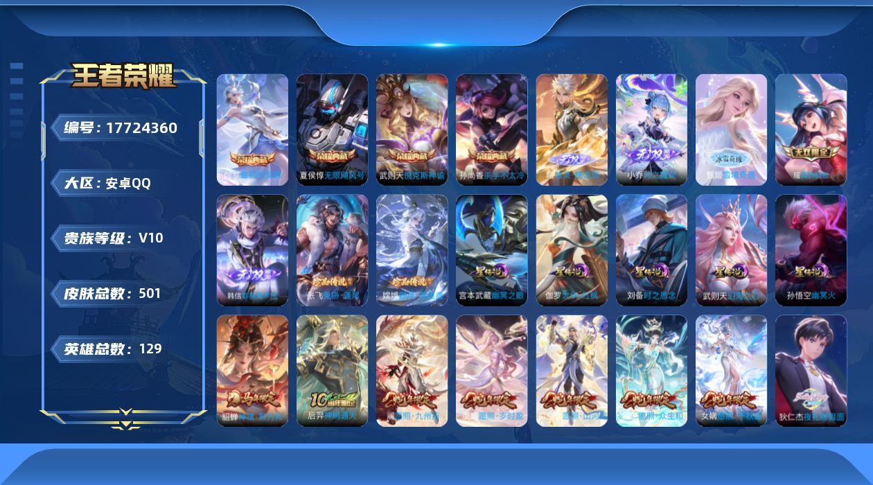 贵族等级:v10皮肤数:501传说品质60 生肖限定18 情人节限定2 荣耀典藏4 无双5 珍品传说2 英雄数:129