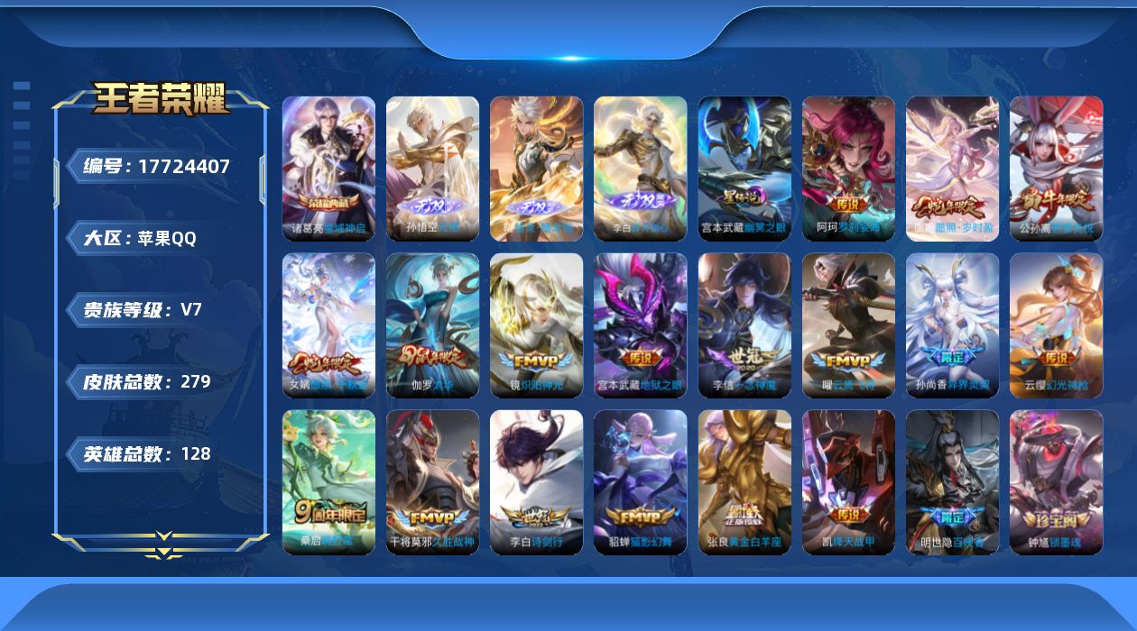 贵族等级:v7皮肤数:279情人节限定5 荣耀典藏1 无双3 传说品质17 生肖限定5 英雄数:128