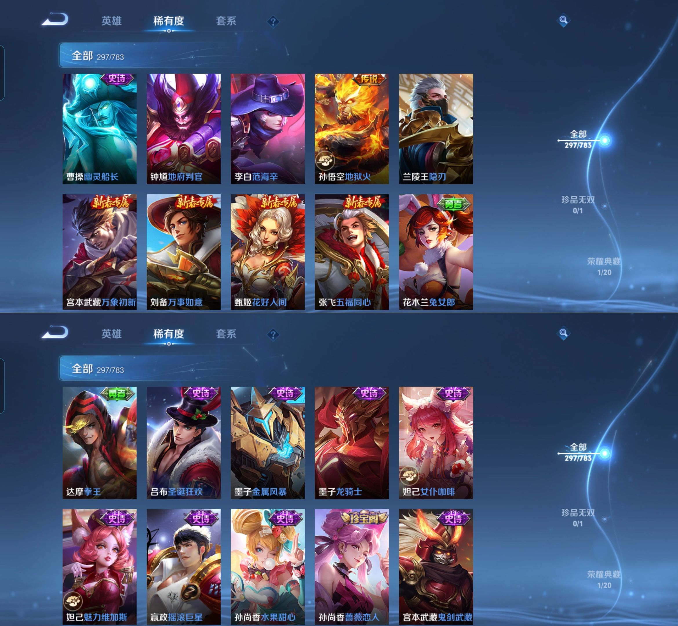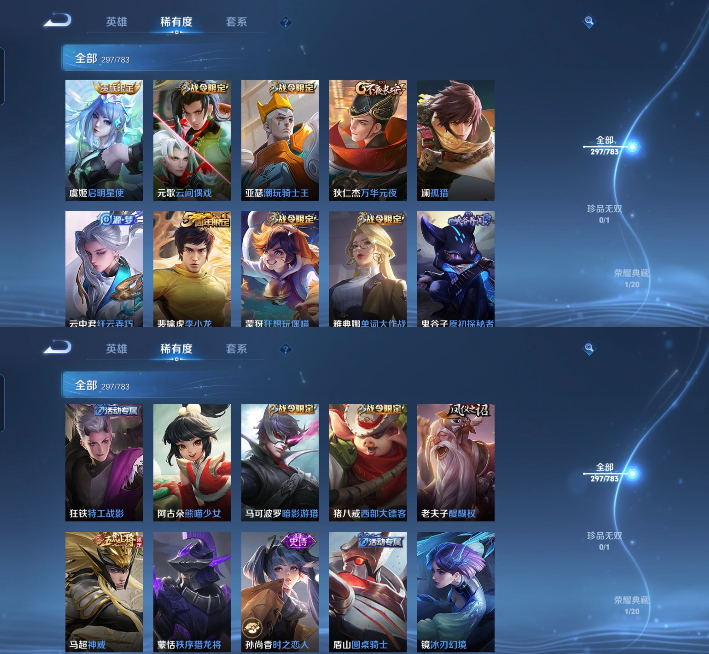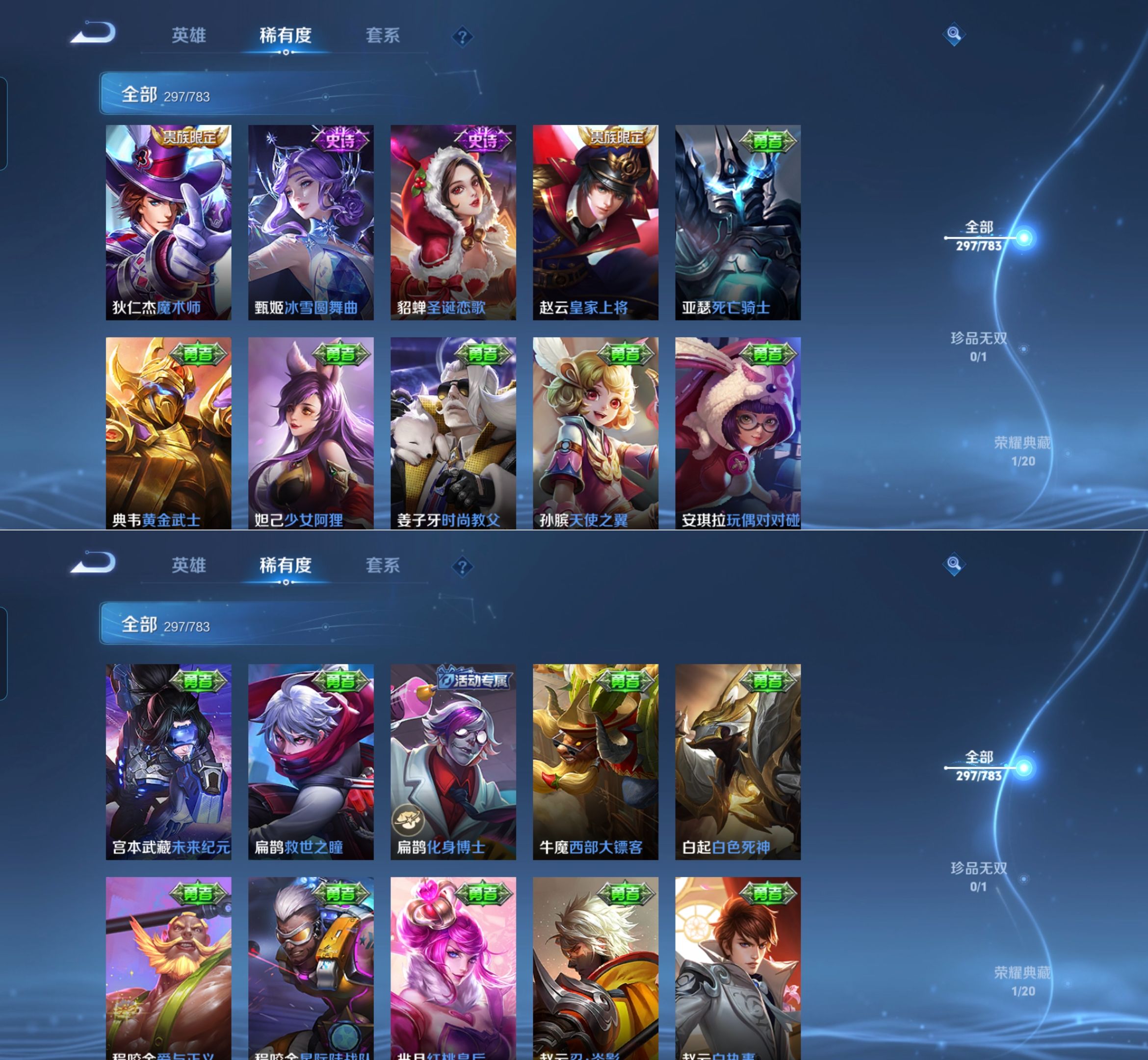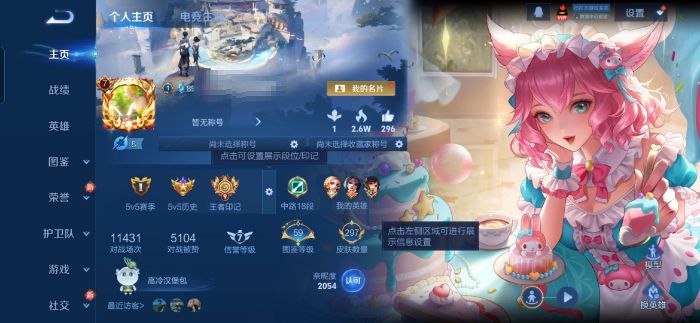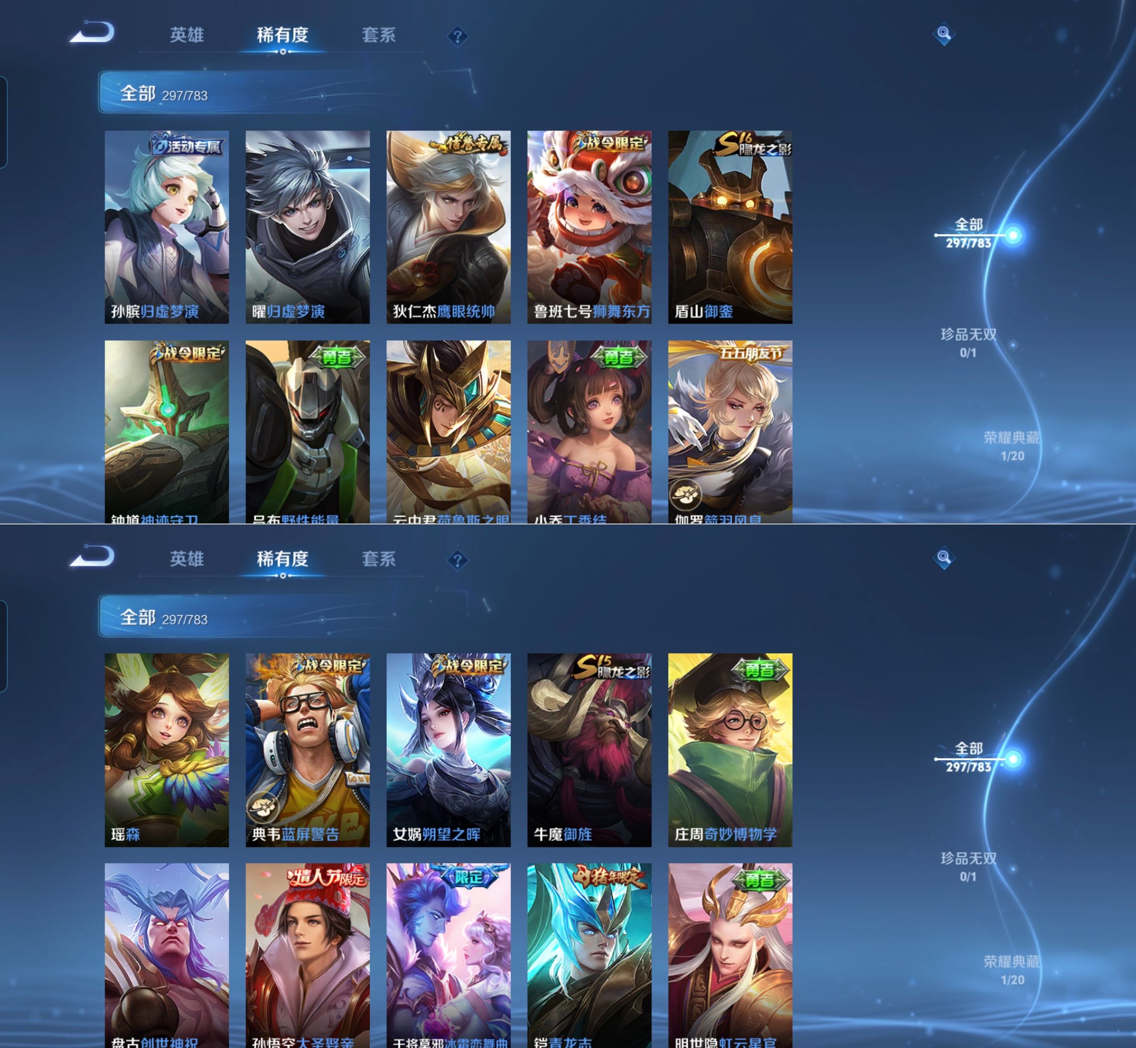 贵族等级:v8皮肤数:297情人节限定2 传说品质7 荣耀典藏1 生肖限定1 英雄数:127