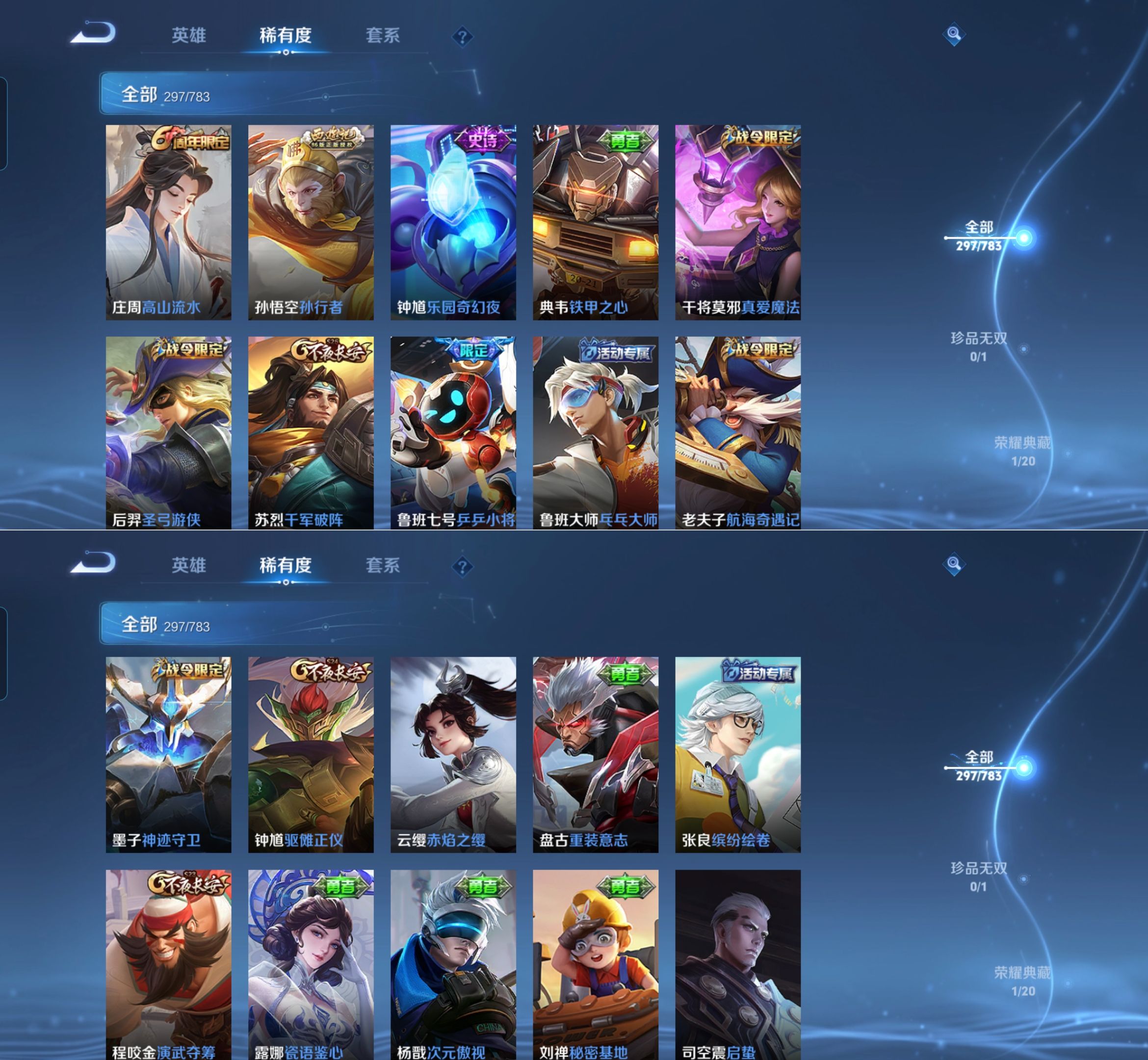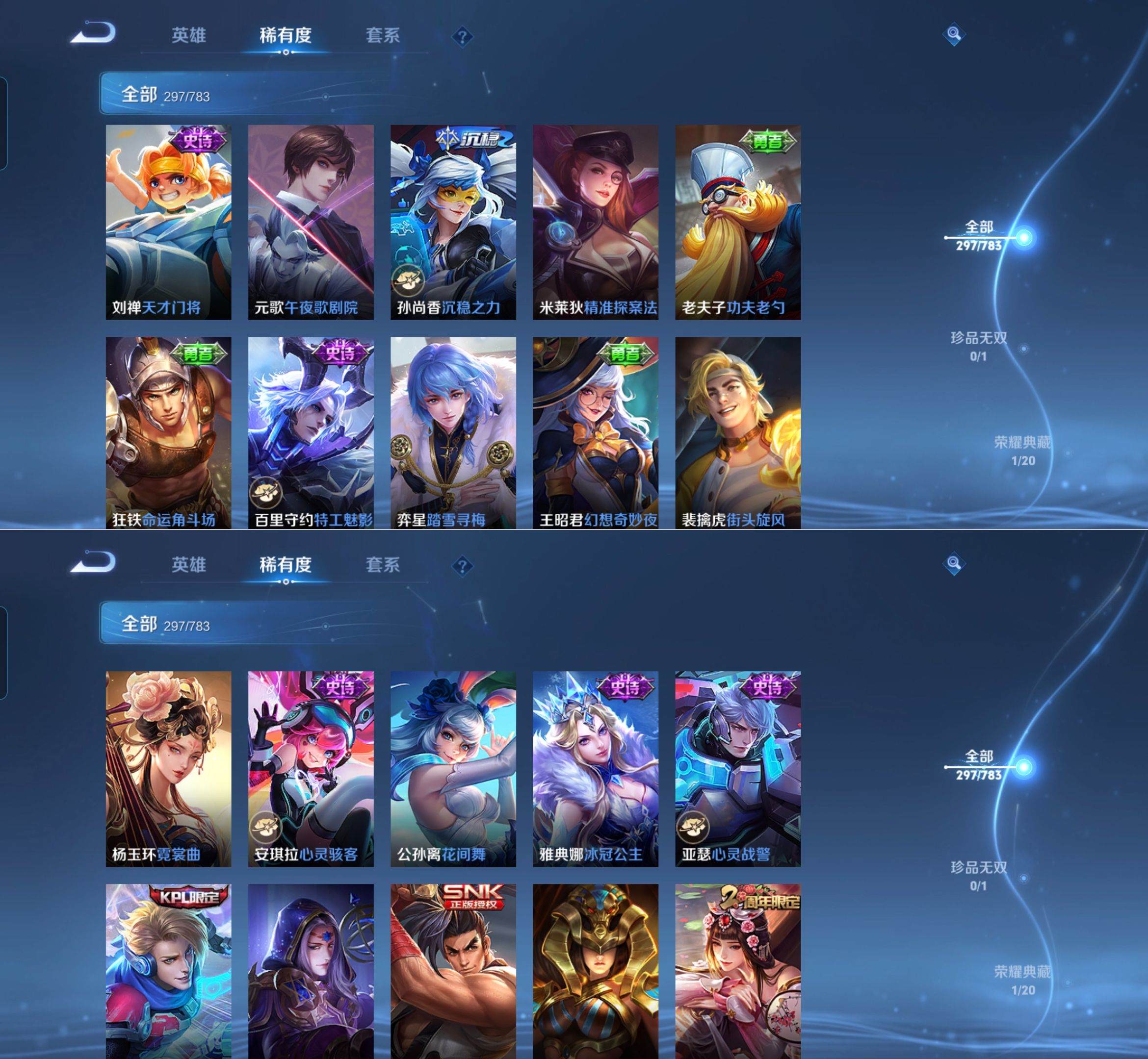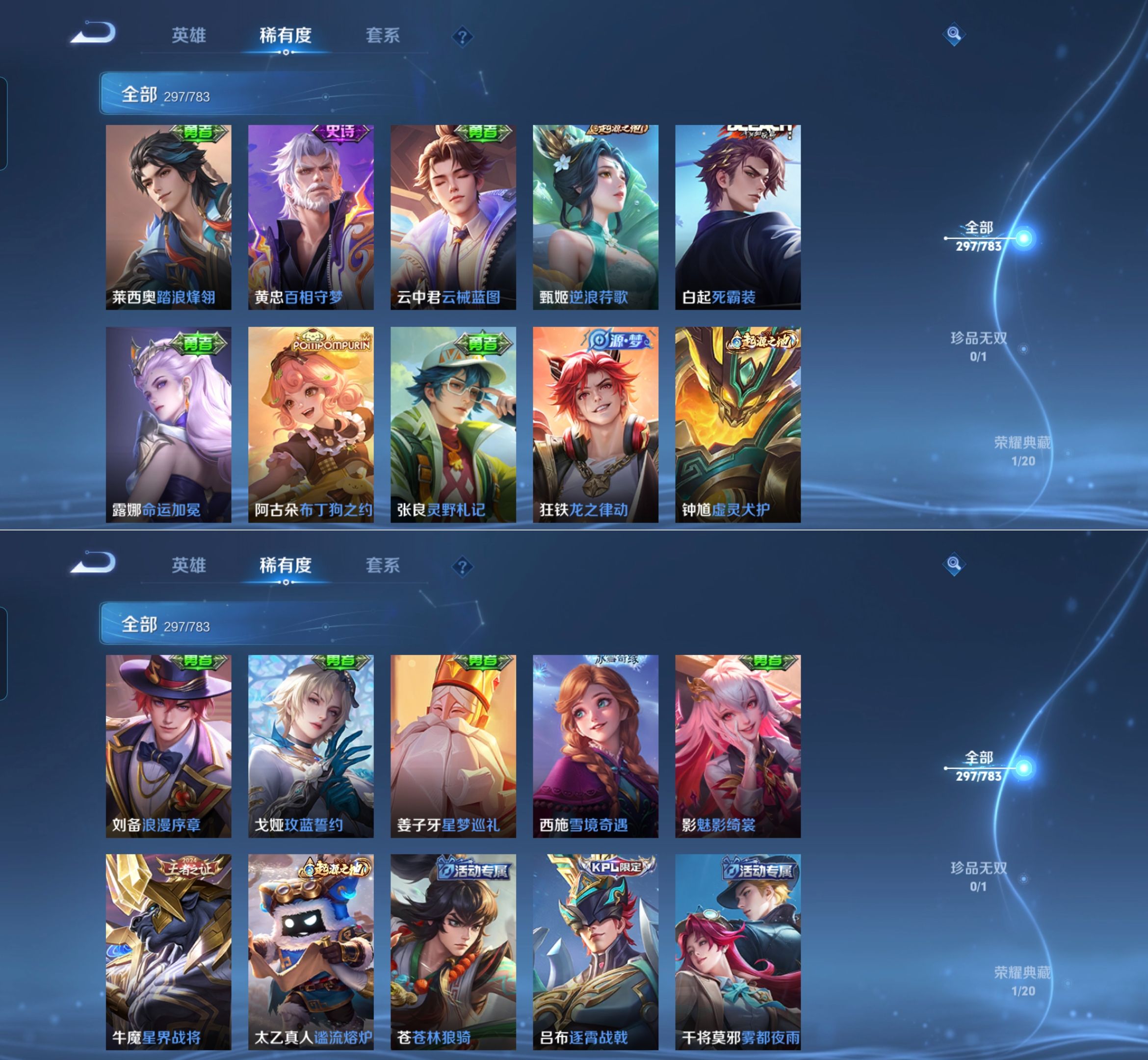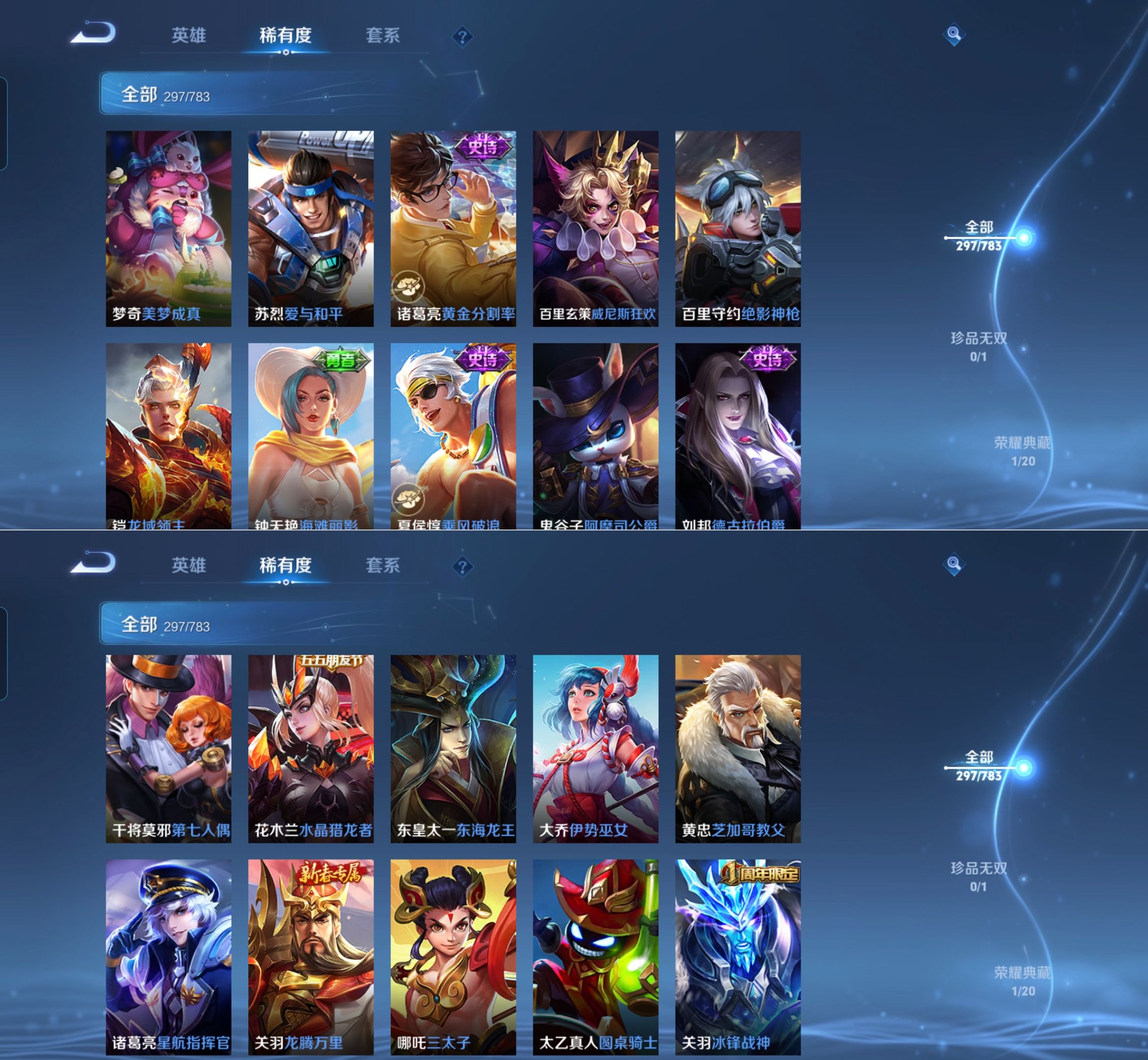 贵族等级:v8皮肤数:297情人节限定2 传说品质7 荣耀典藏1 生肖限定1 英雄数:127