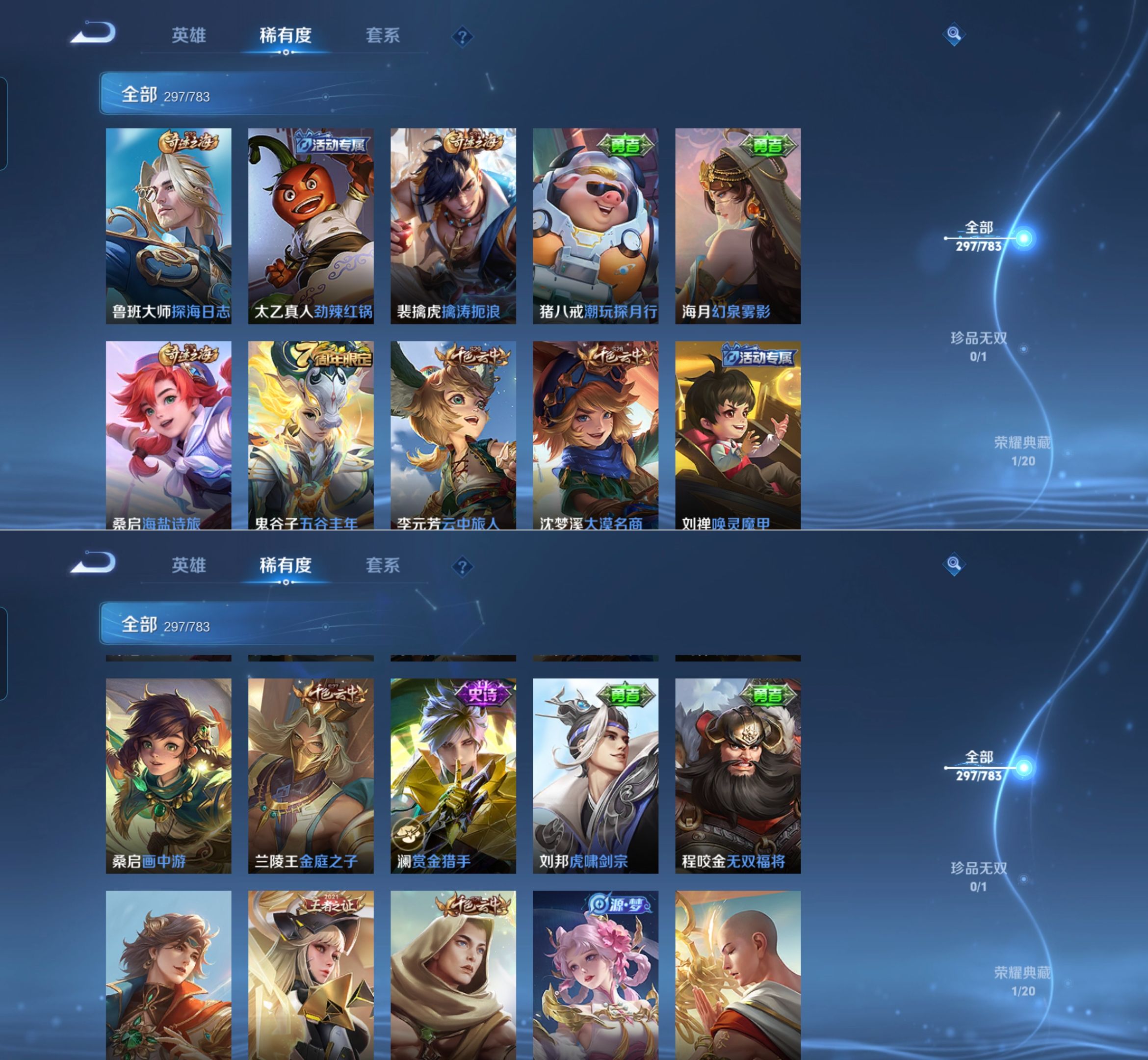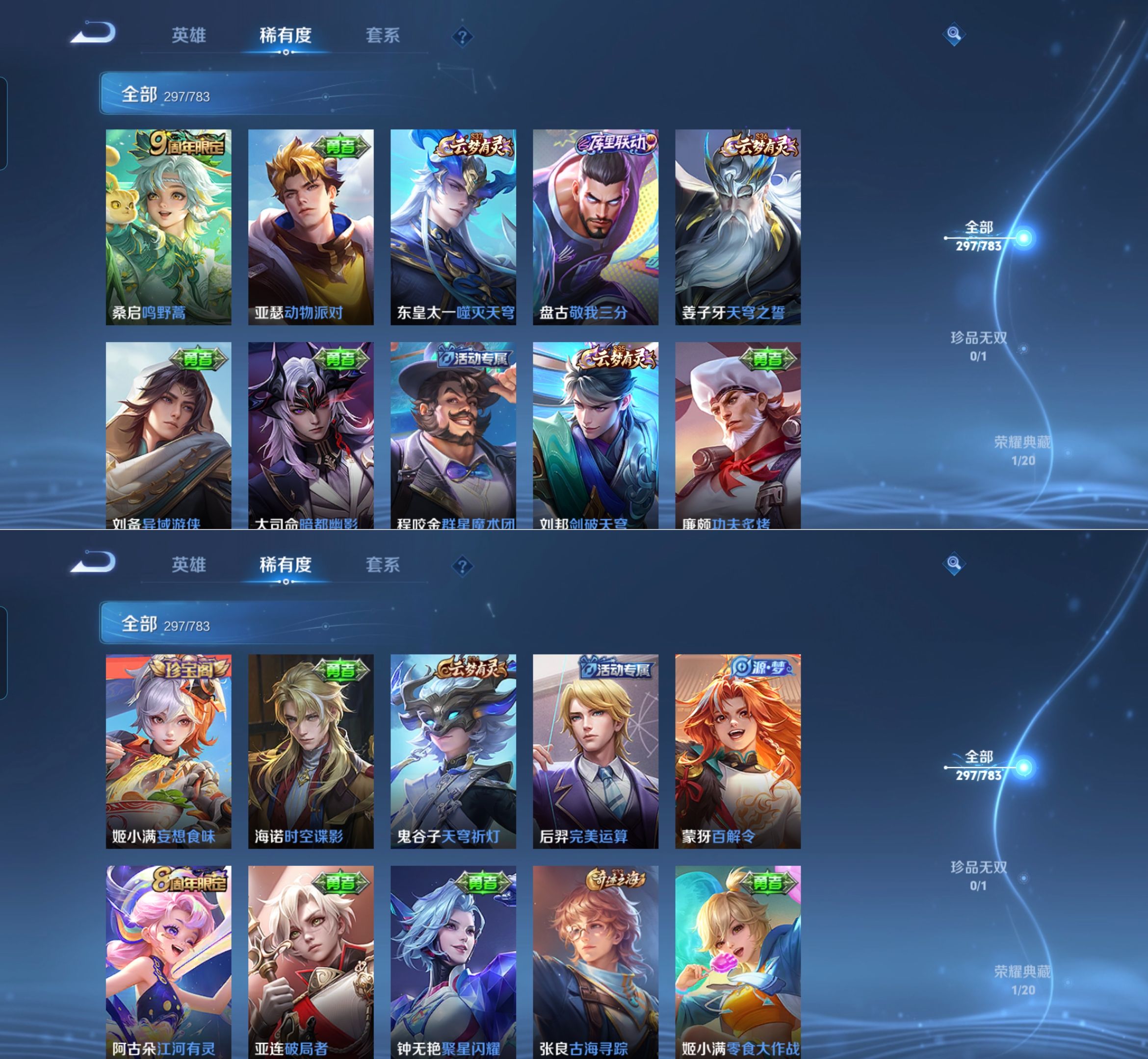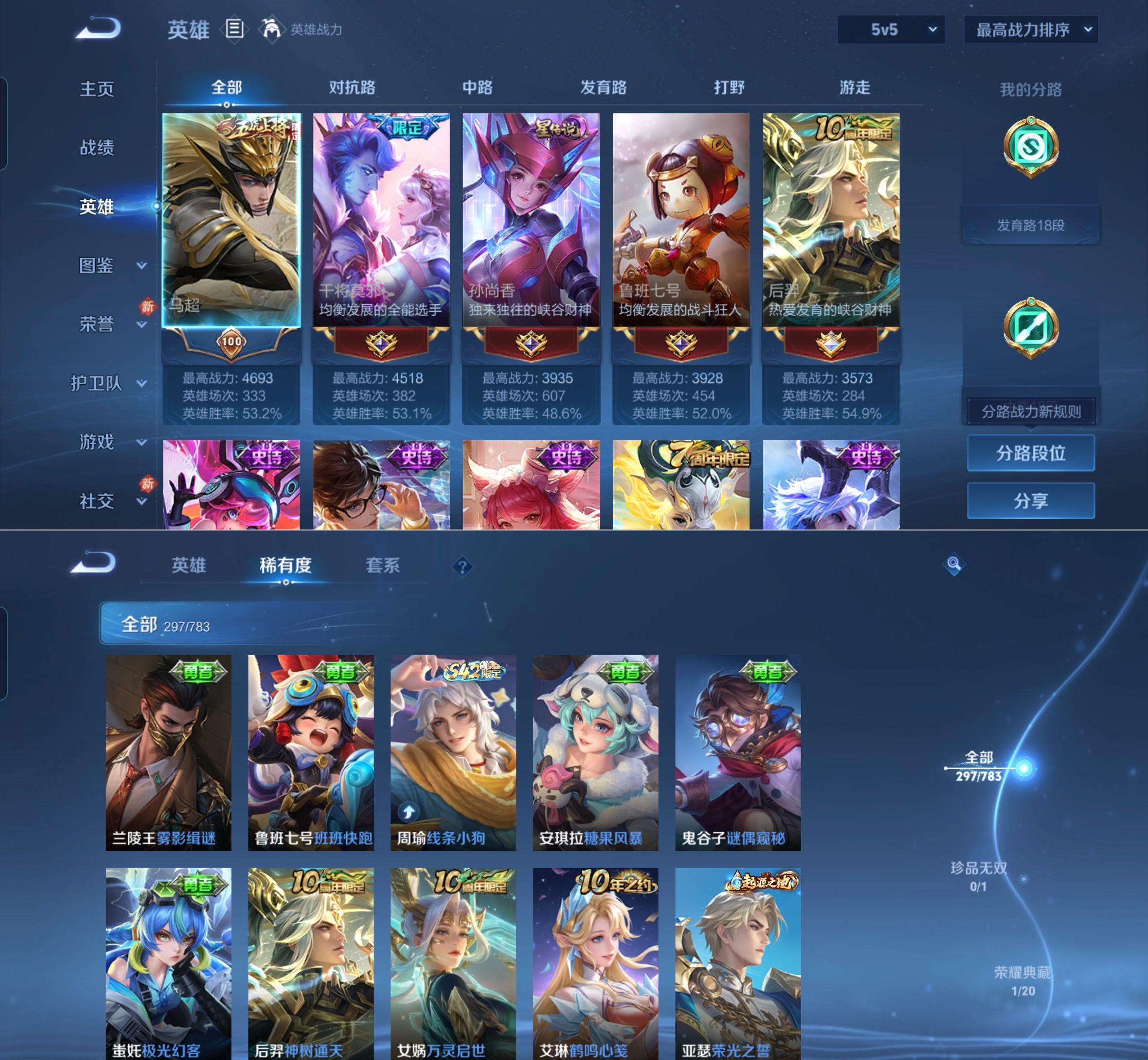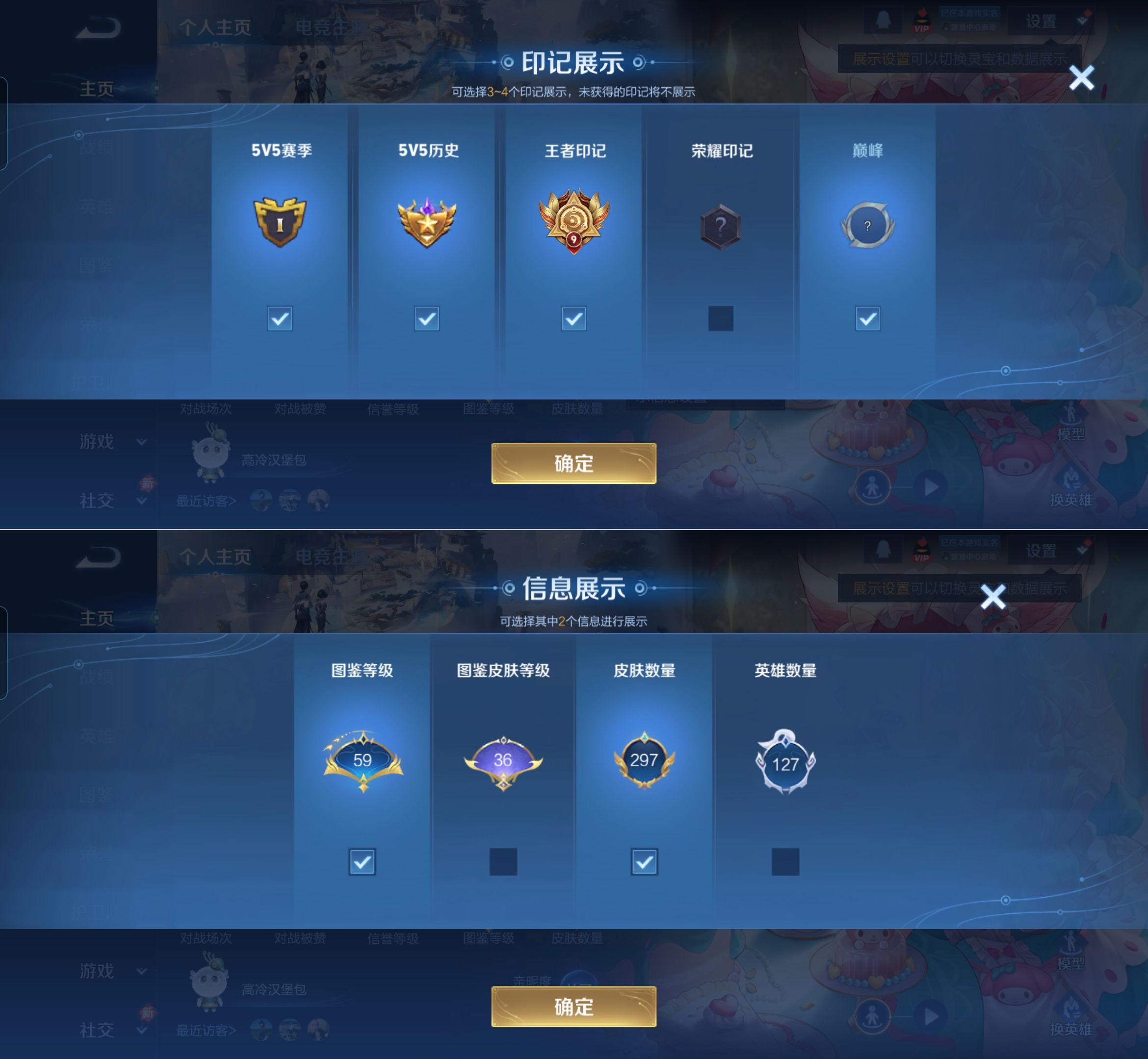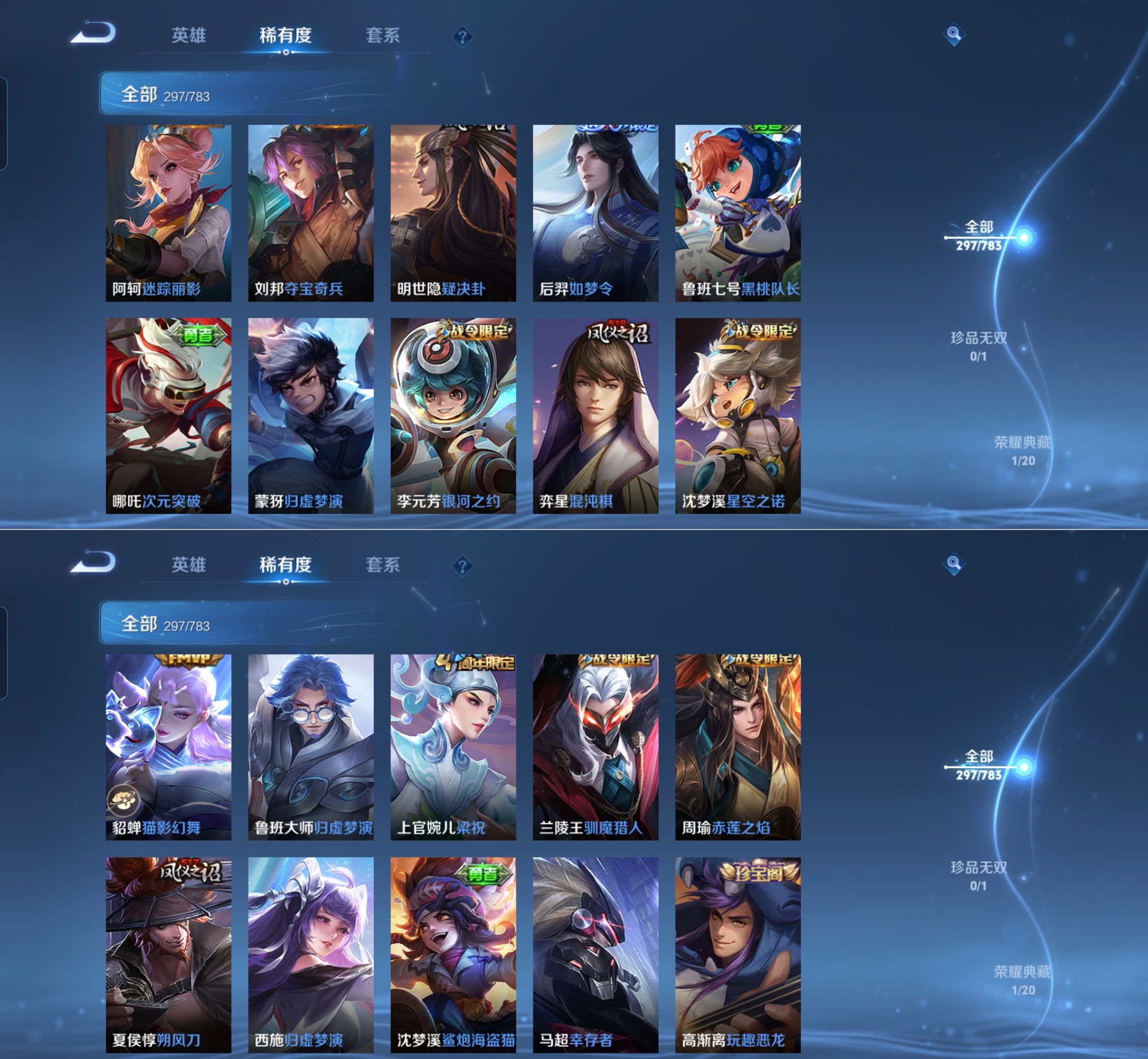 贵族等级:v8皮肤数:297情人节限定2 传说品质7 荣耀典藏1 生肖限定1 英雄数:127