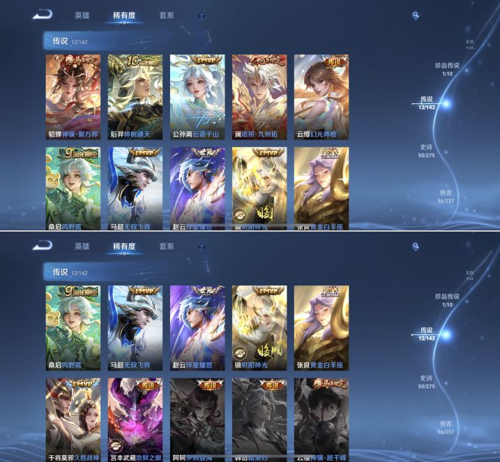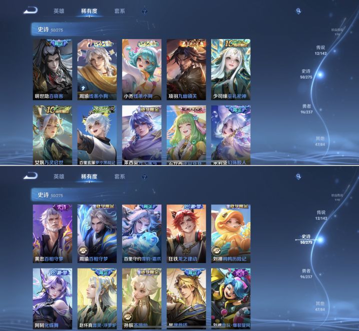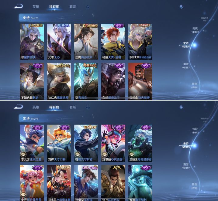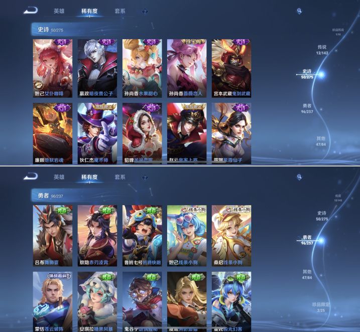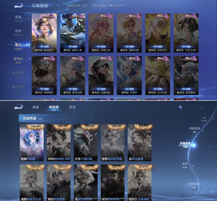 贵族等级:v7皮肤数:208传说品质12 生肖限定3 情人节限定1 荣耀典藏1 珍品传说1 无双1 英雄数:128