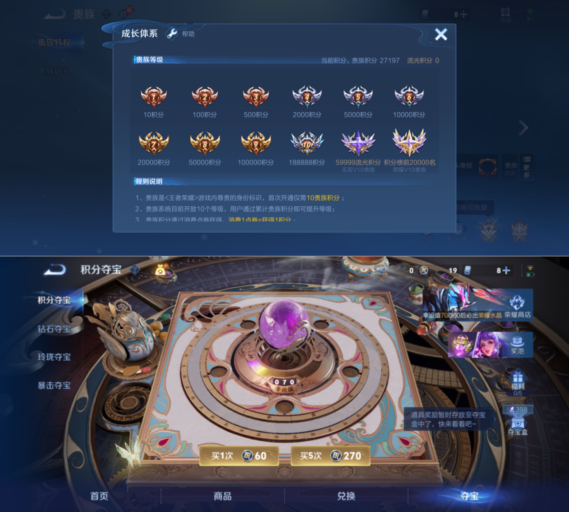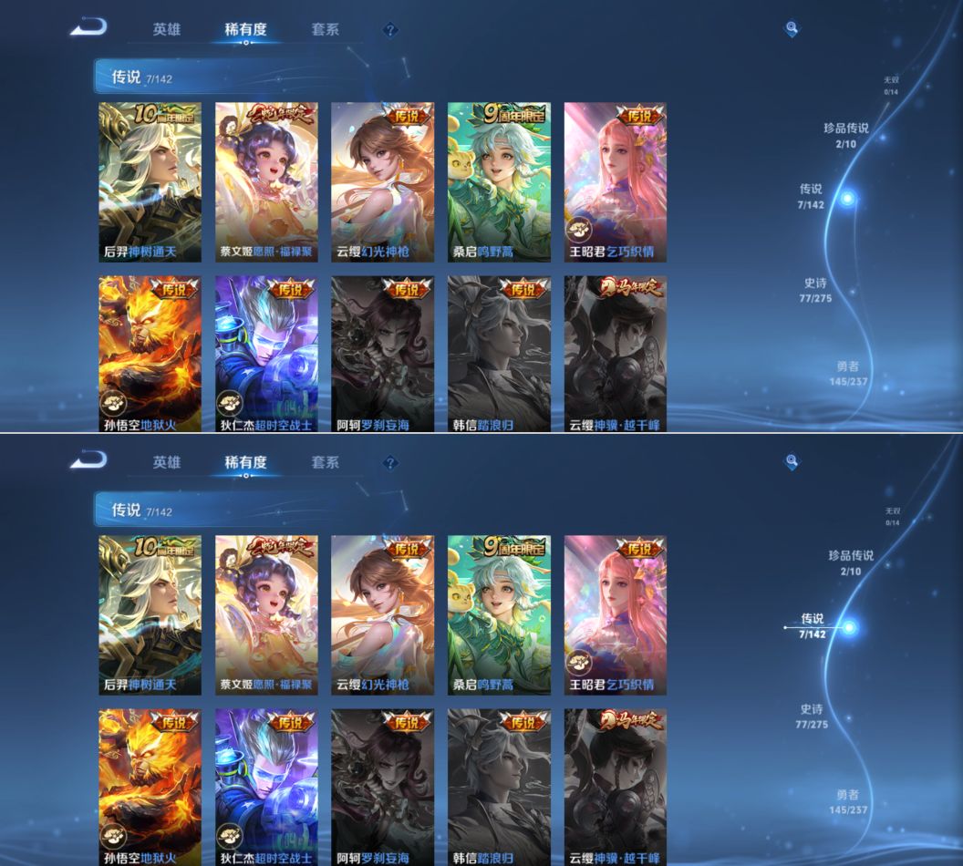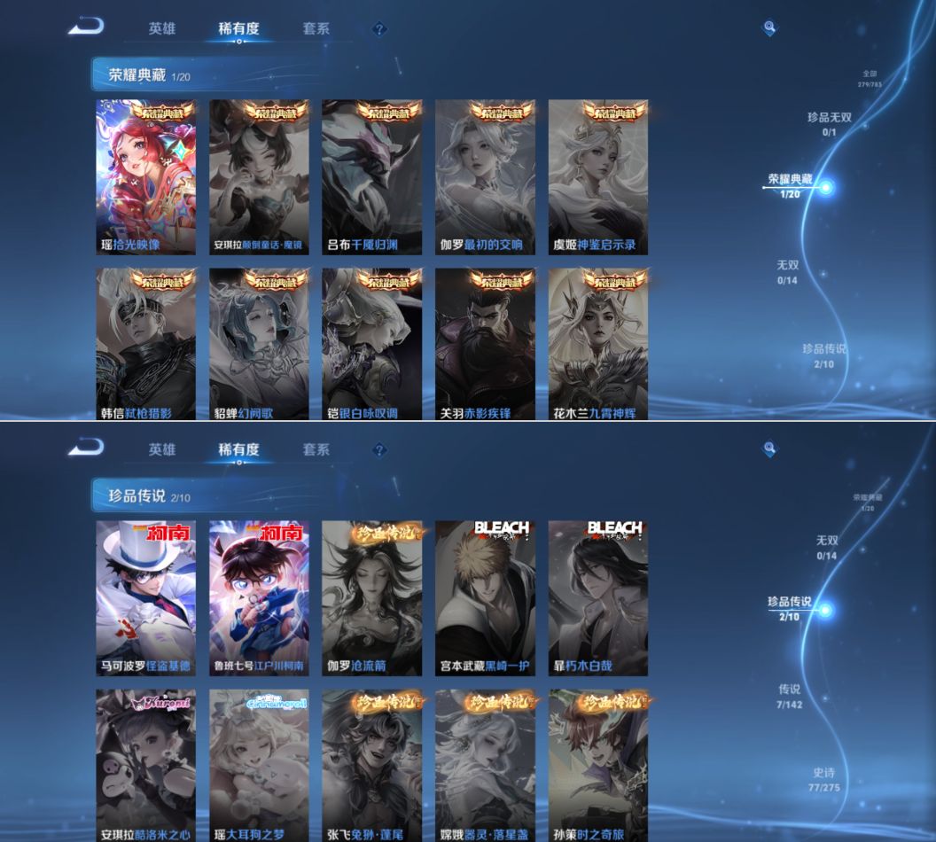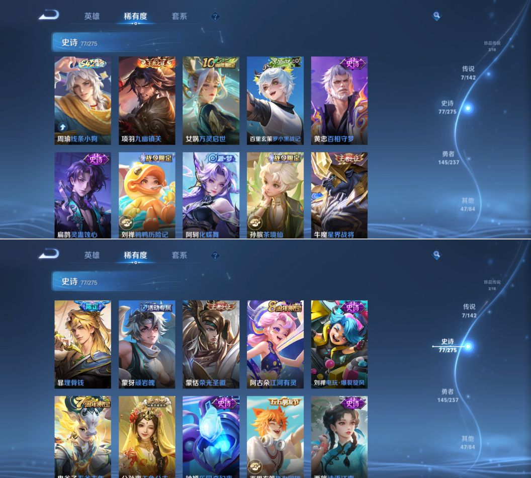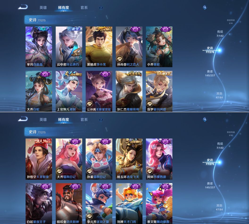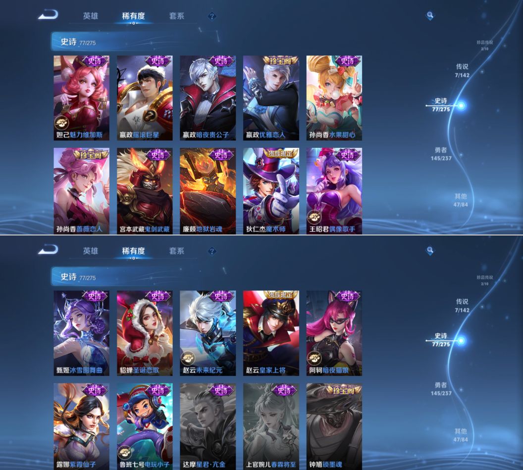 贵族等级:v7皮肤数:279传说品质7 情人节限定1 珍品传说2 荣耀典藏1 生肖限定1 英雄数:128
