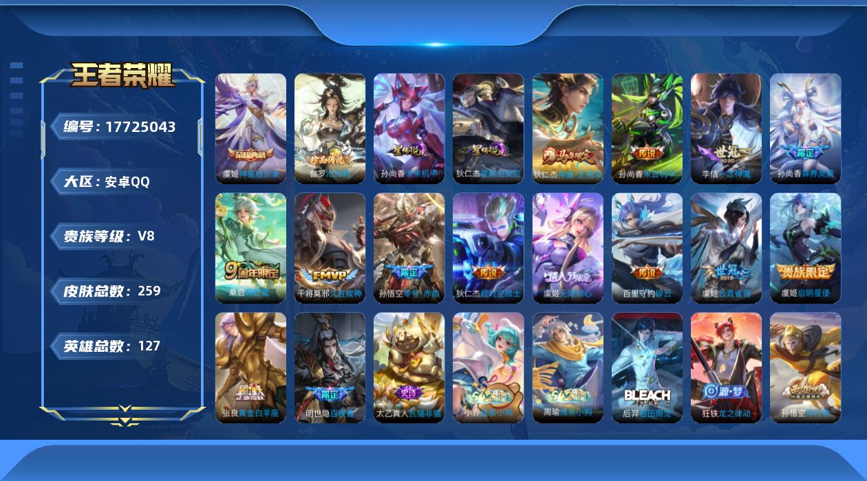 贵族等级:v8皮肤数:259生肖限定4 传说品质13 情人节限定3 珍品传说1 荣耀典藏1 英雄数:127