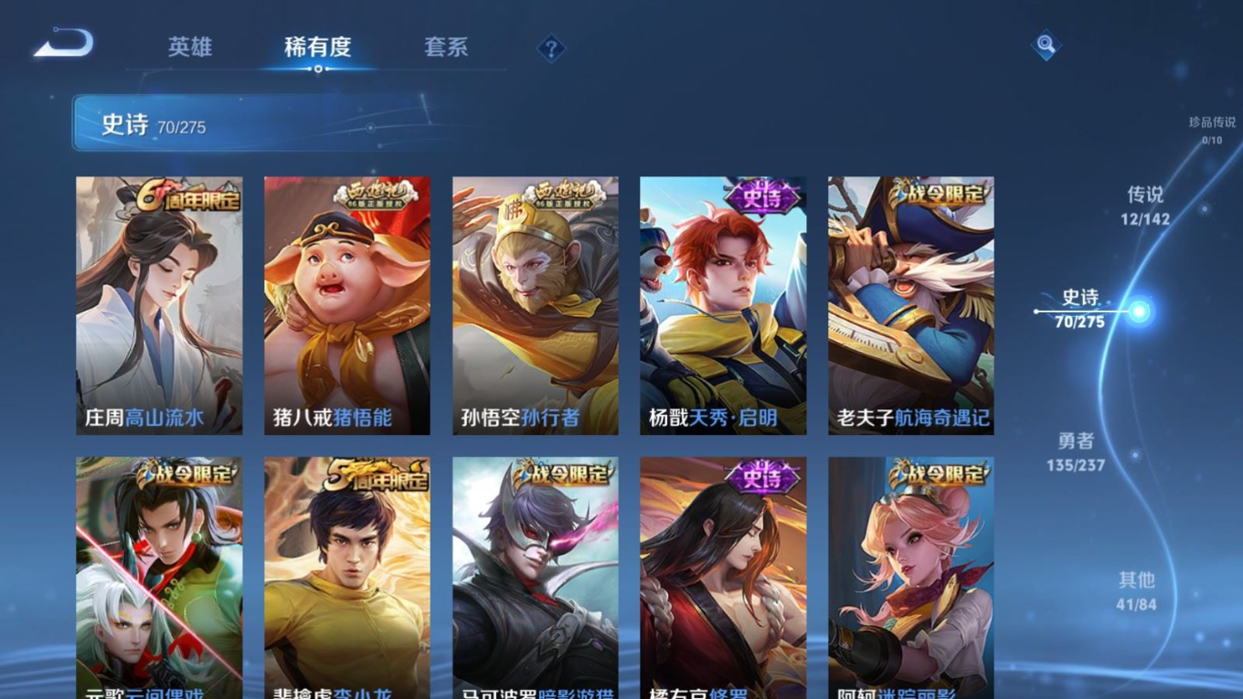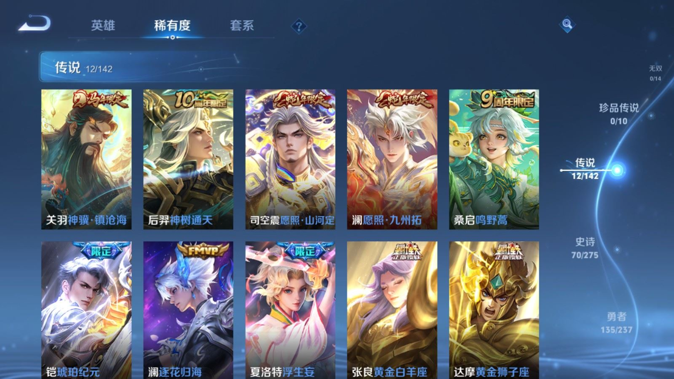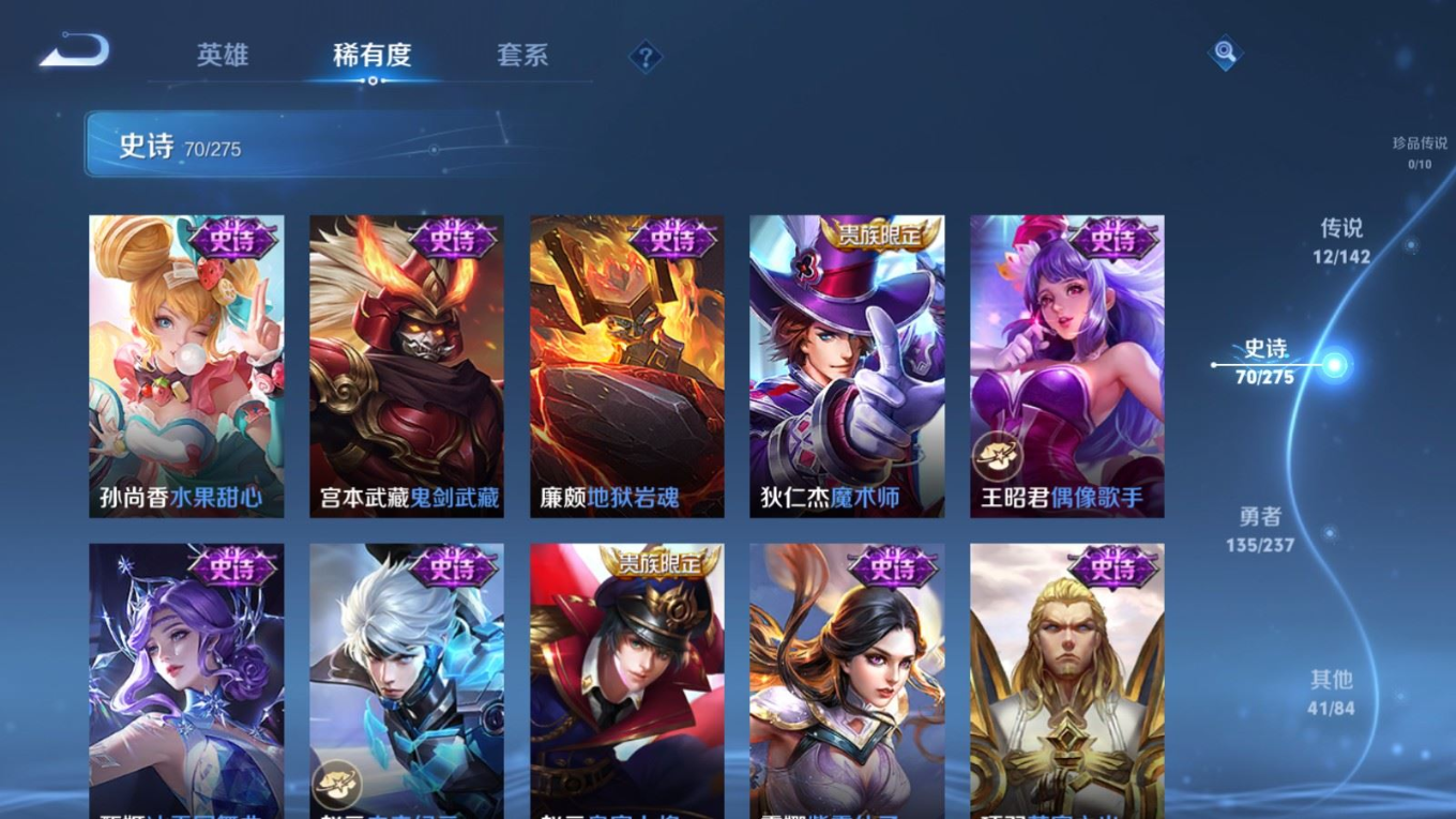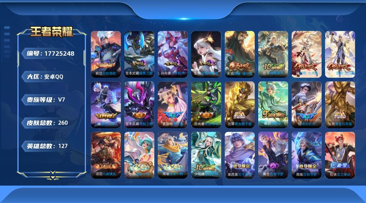 贵族等级:v7皮肤数:260传说品质12 生肖限定3 情人节限定2 荣耀典藏1 英雄数:127
