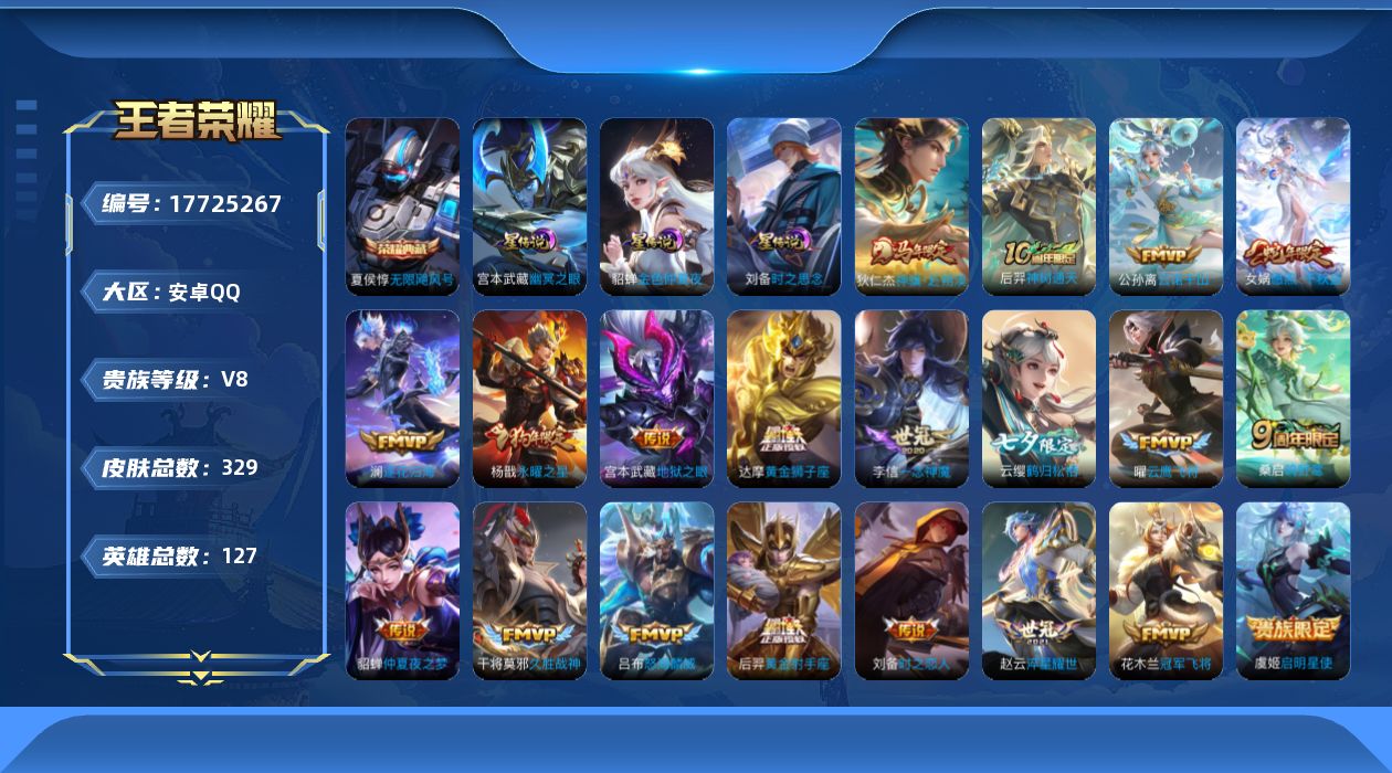 贵族等级:v8皮肤数:329生肖限定7 传说品质21 情人节限定1 荣耀典藏1 英雄数:127