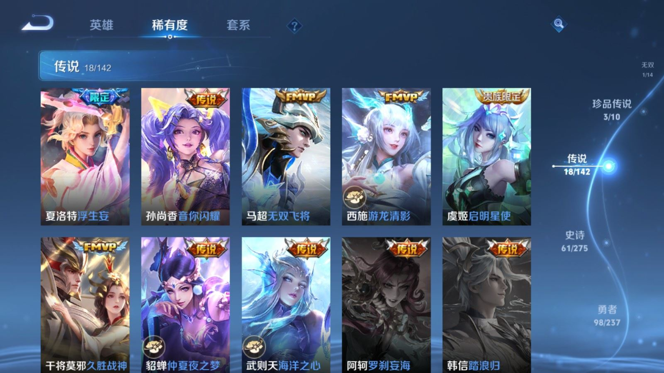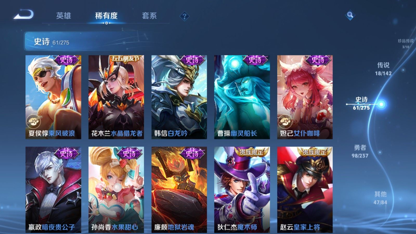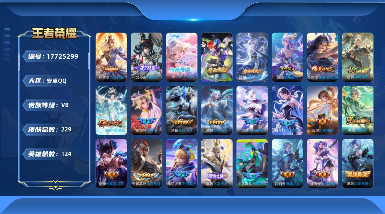 贵族等级:v8皮肤数:229传说品质18 荣耀典藏1 生肖限定5 珍品传说3 无双1 英雄数:124
