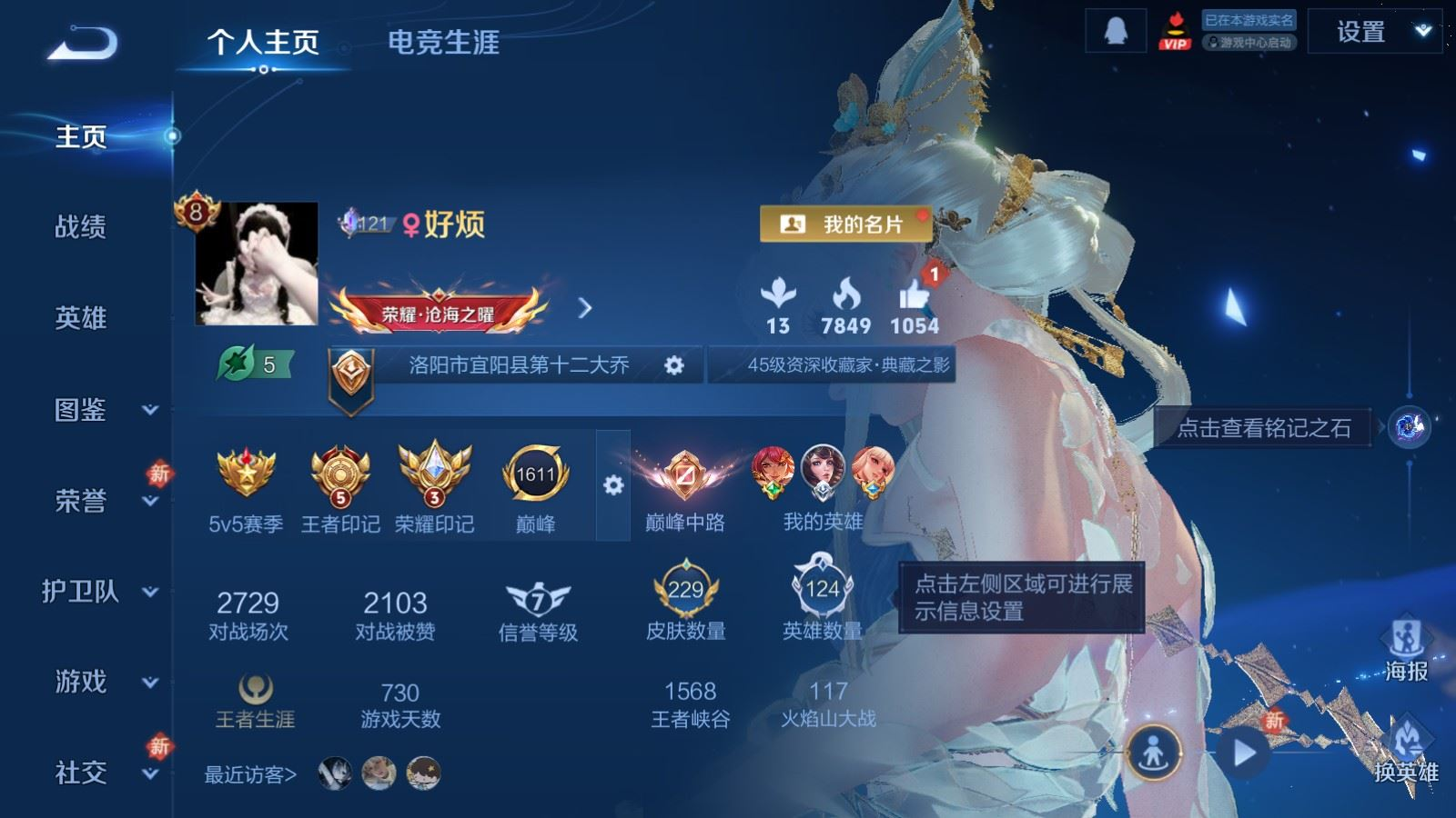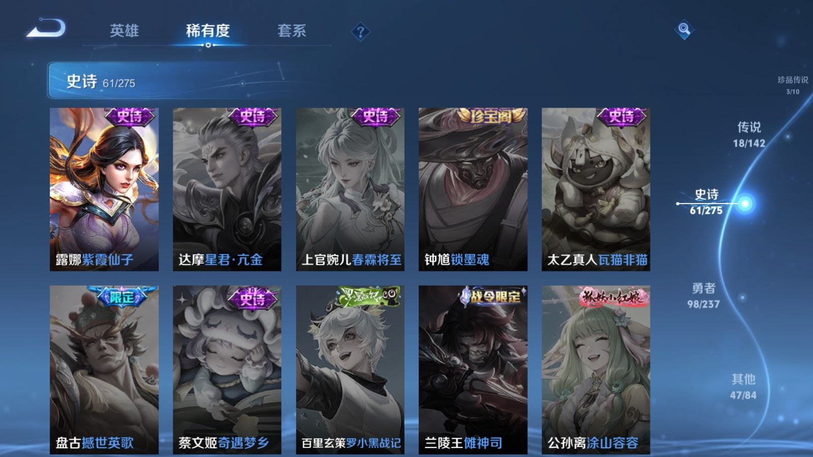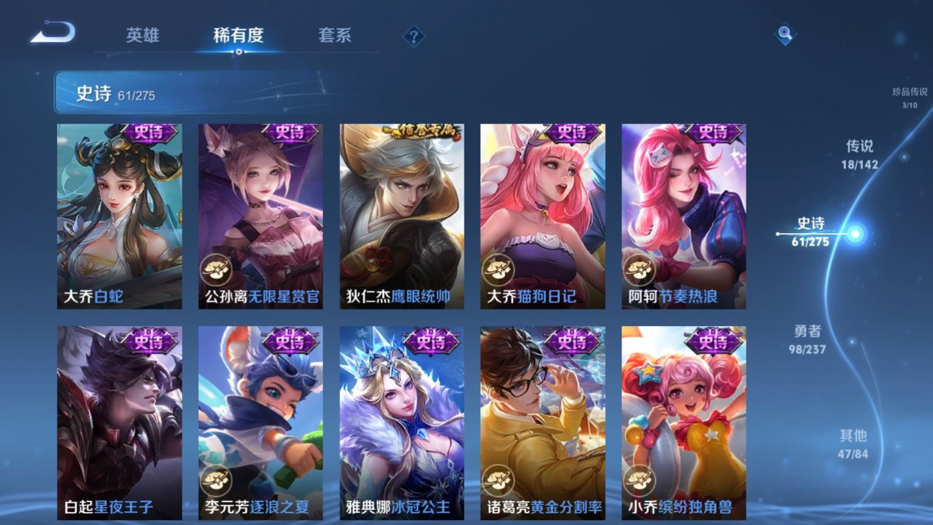 贵族等级:v8皮肤数:229传说品质18 荣耀典藏1 生肖限定5 珍品传说3 无双1 英雄数:124