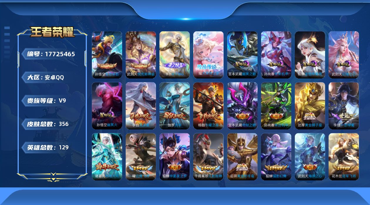 贵族等级:v9皮肤数:356生肖限定10 传说品质21 情人节限定3 荣耀典藏2 无双1 珍品传说1 英雄数:129