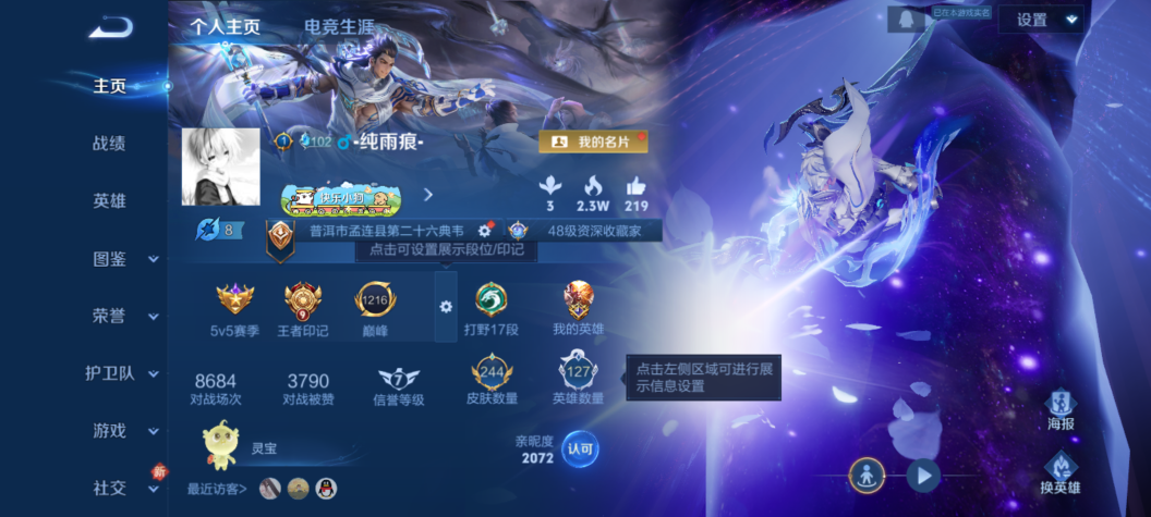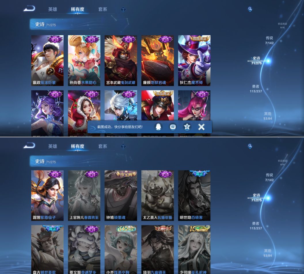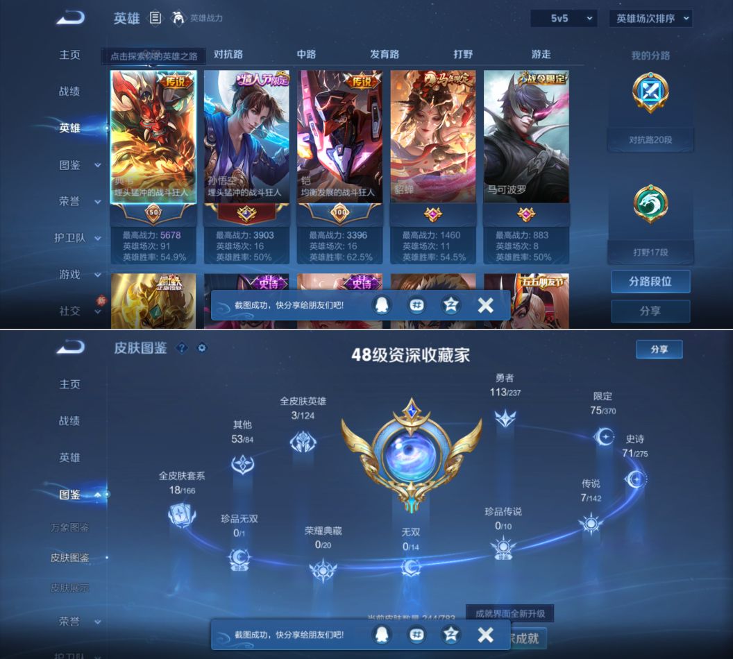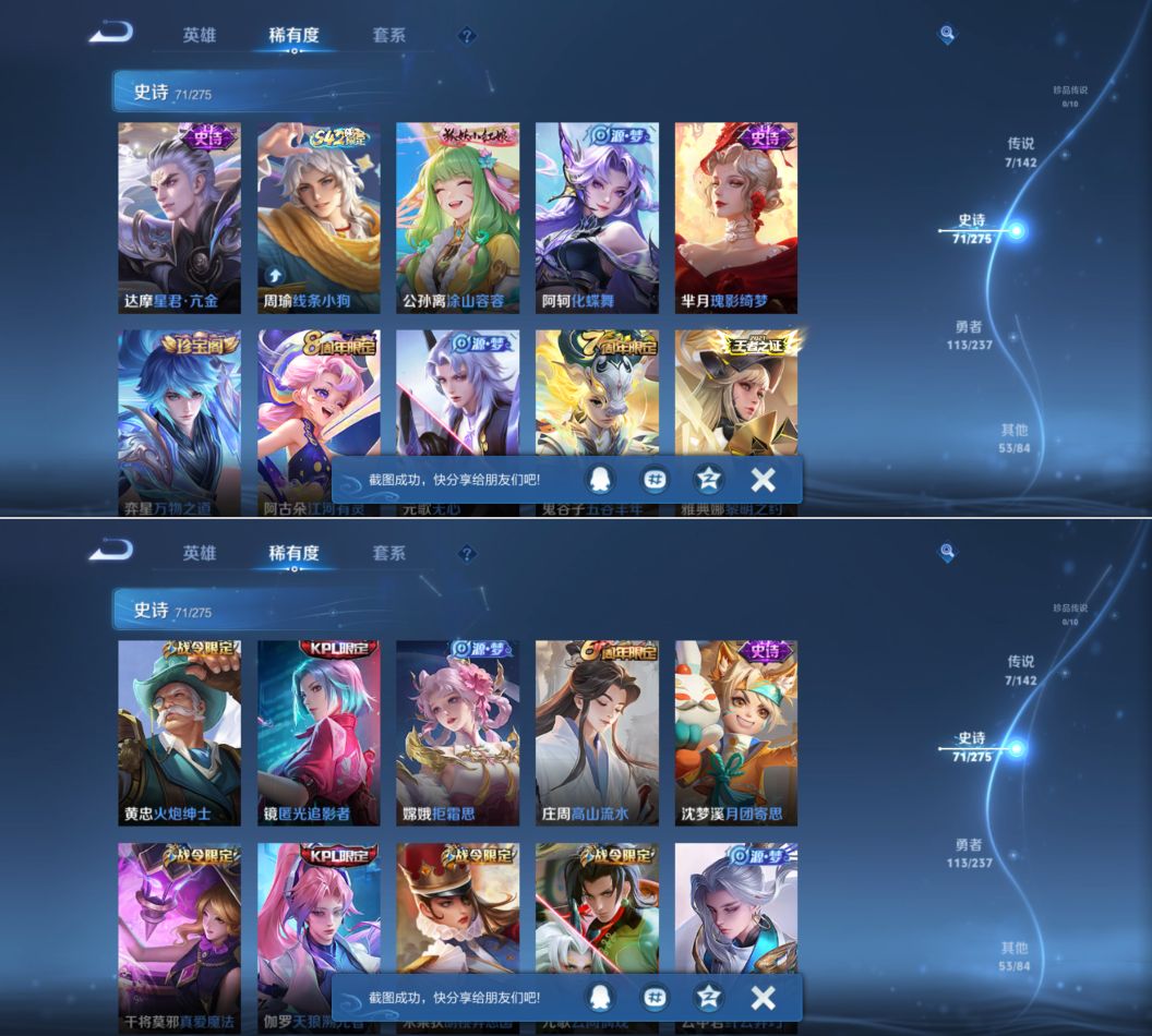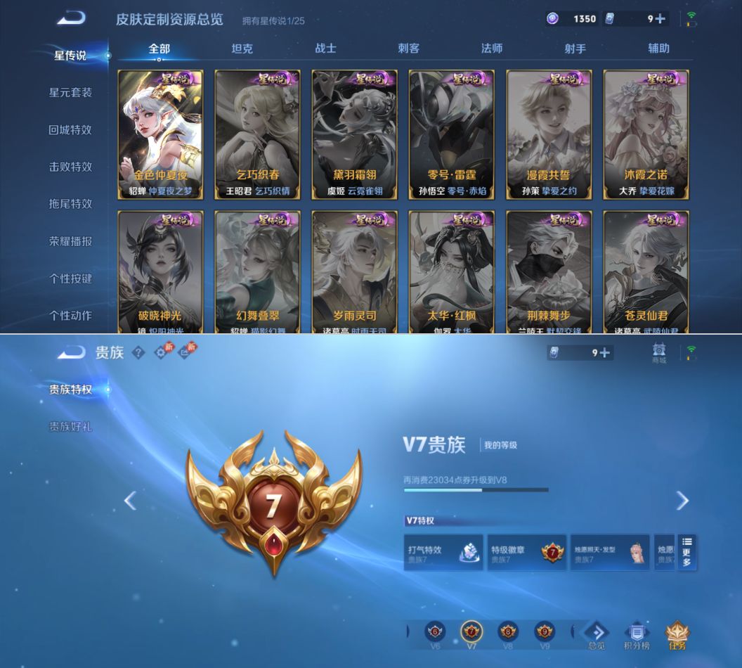 贵族等级:v7皮肤数:244传说品质7 情人节限定2 生肖限定1 英雄数:127