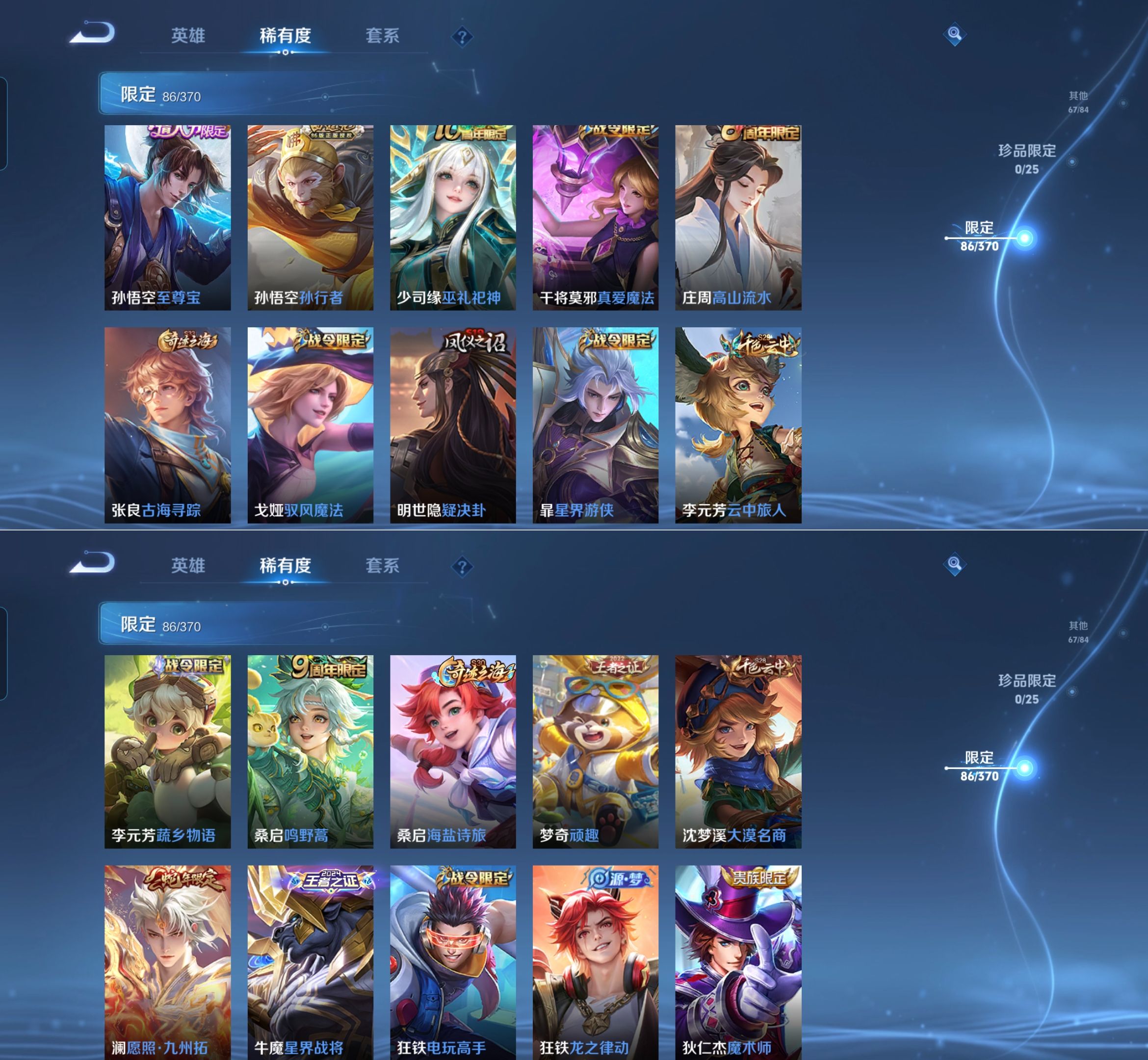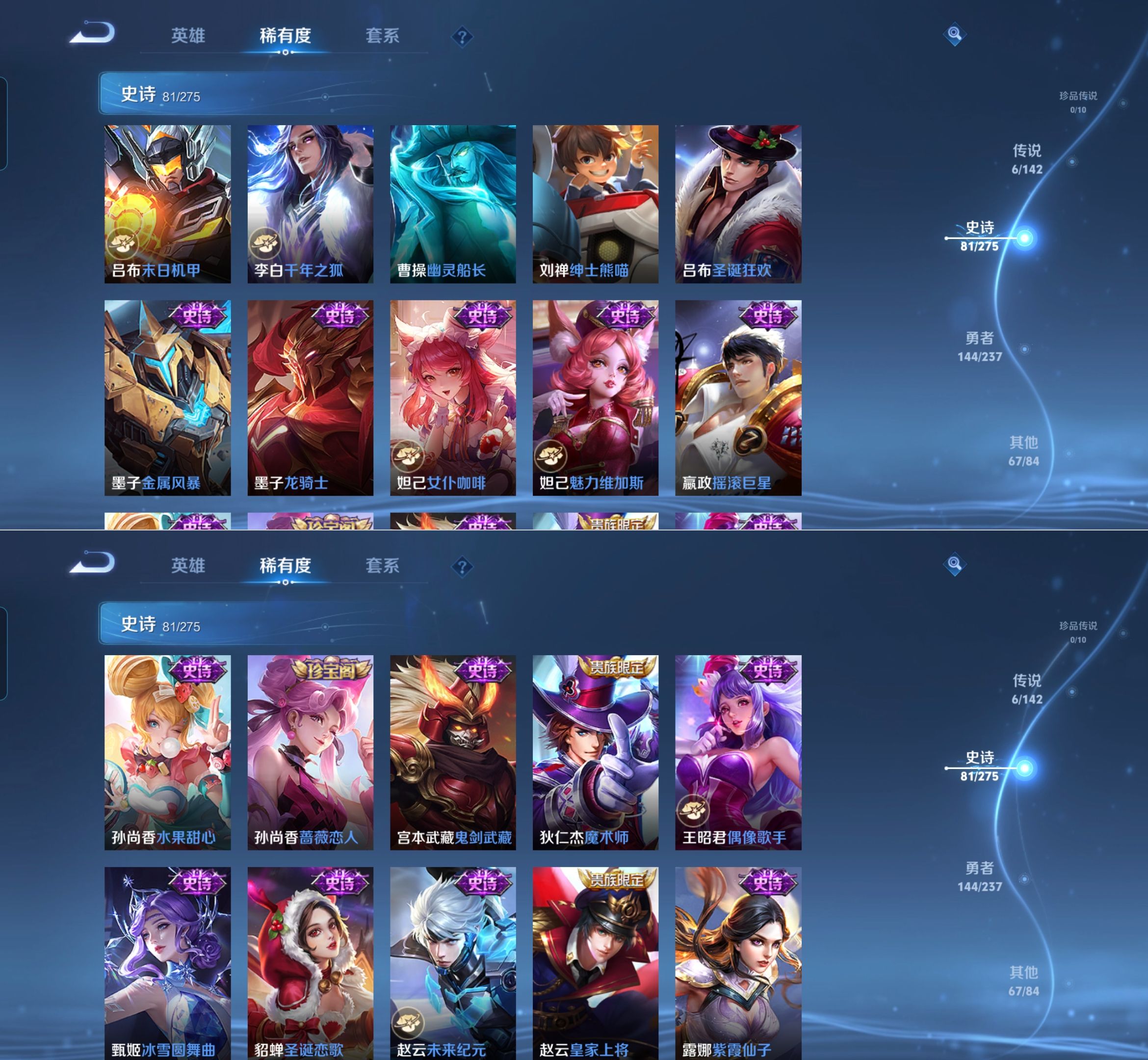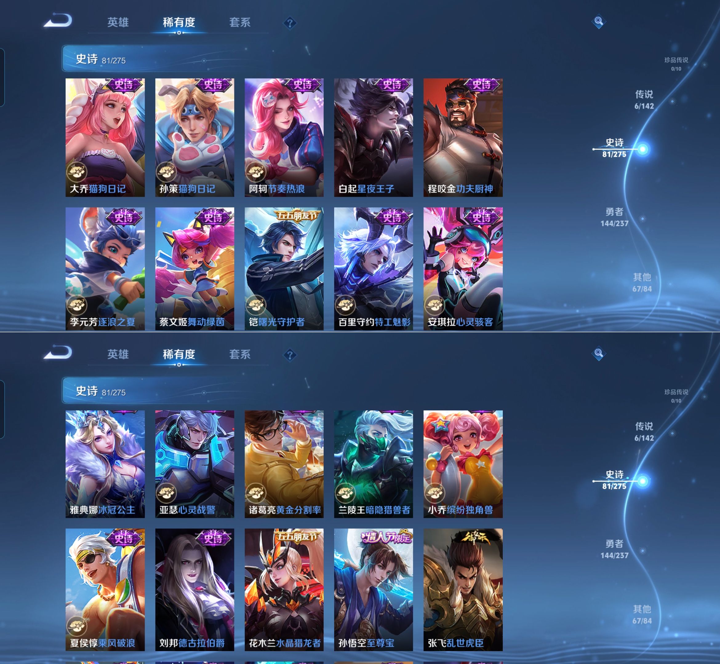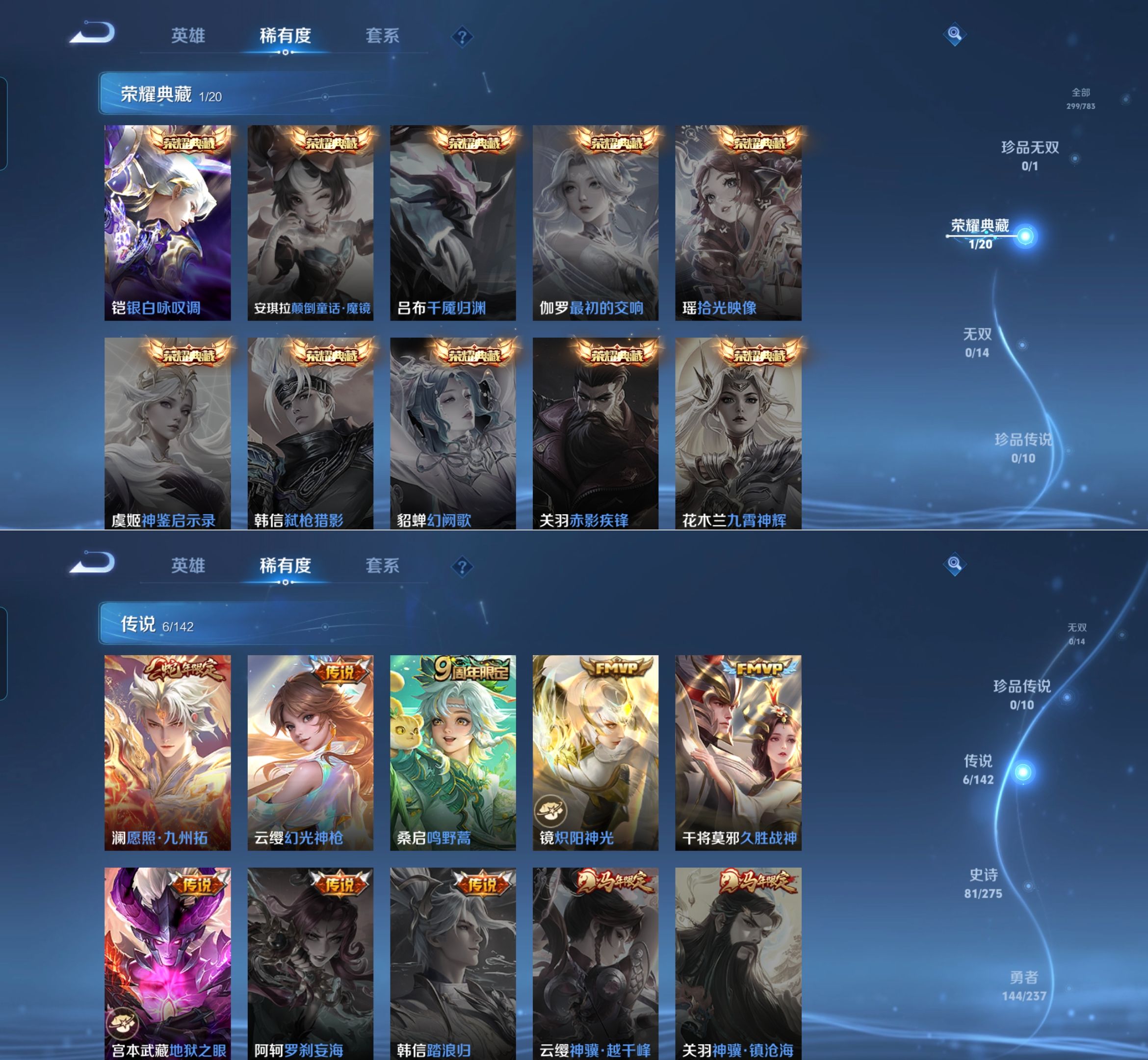 贵族等级:v6皮肤数:299传说品质6 生肖限定3 情人节限定1 荣耀典藏1 英雄数:126