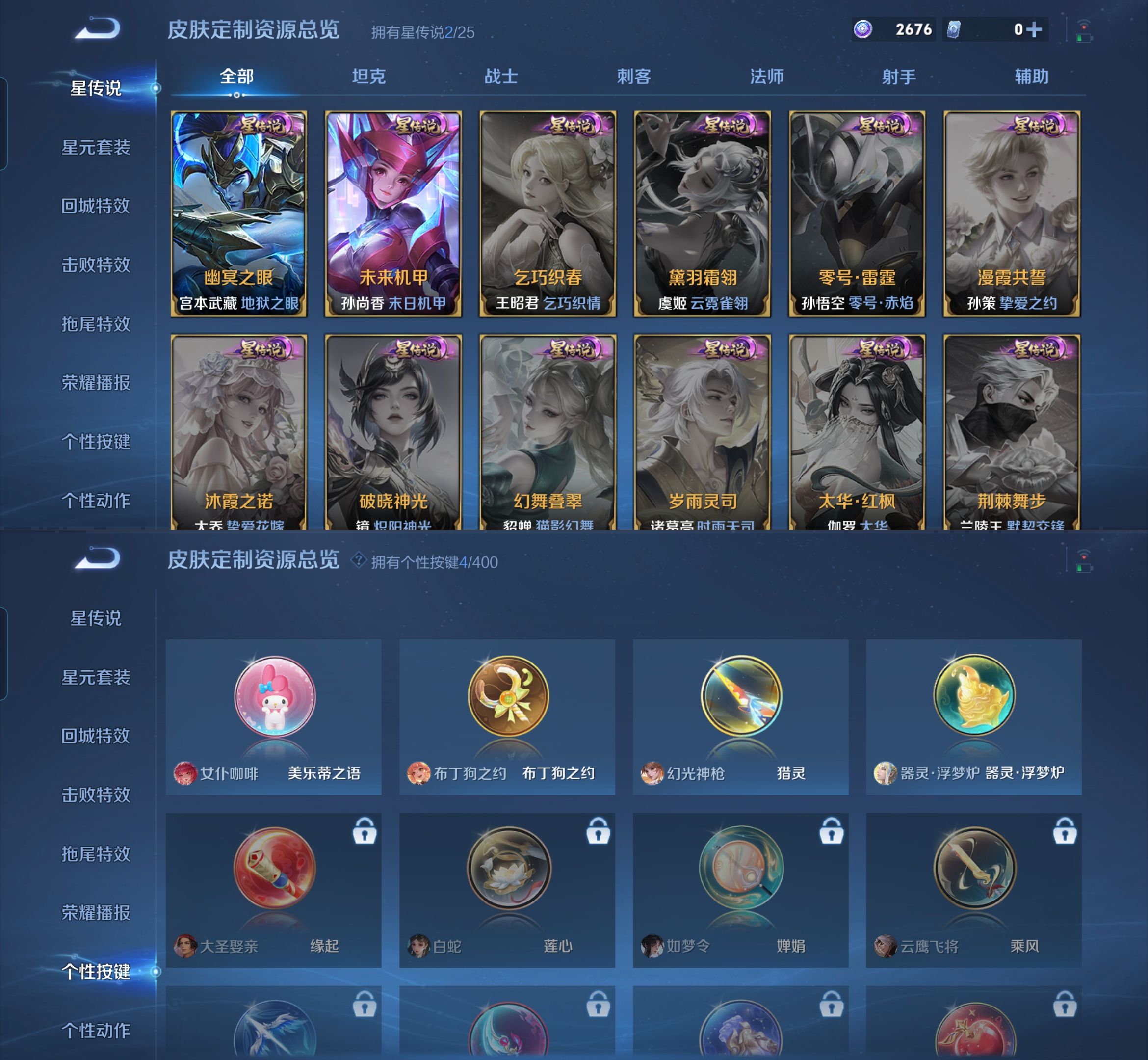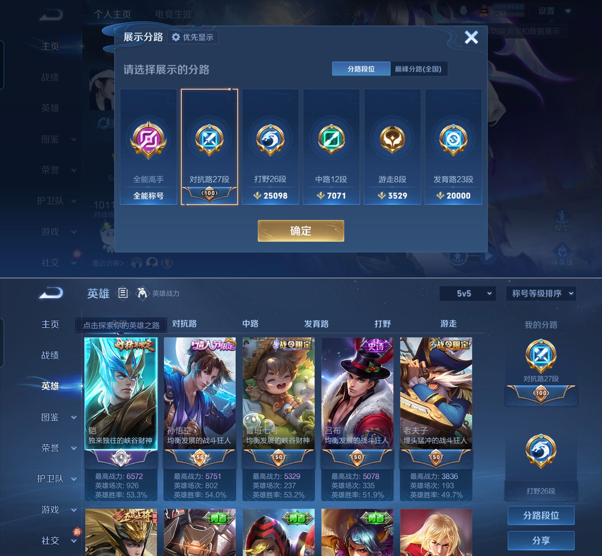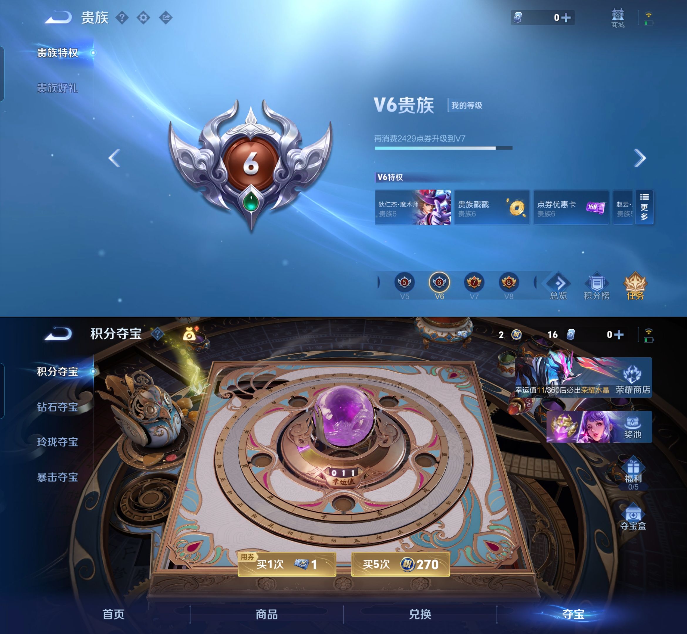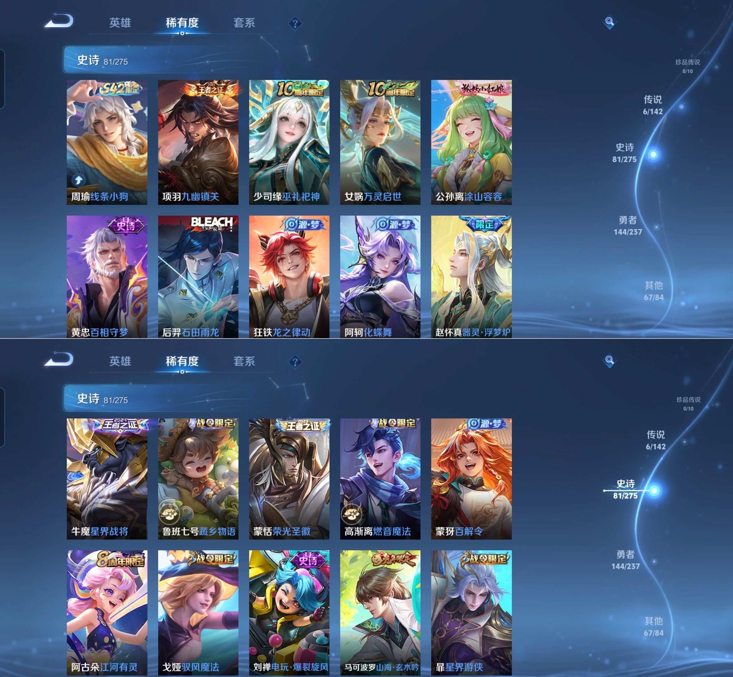 贵族等级:v6皮肤数:299传说品质6 生肖限定3 情人节限定1 荣耀典藏1 英雄数:126
