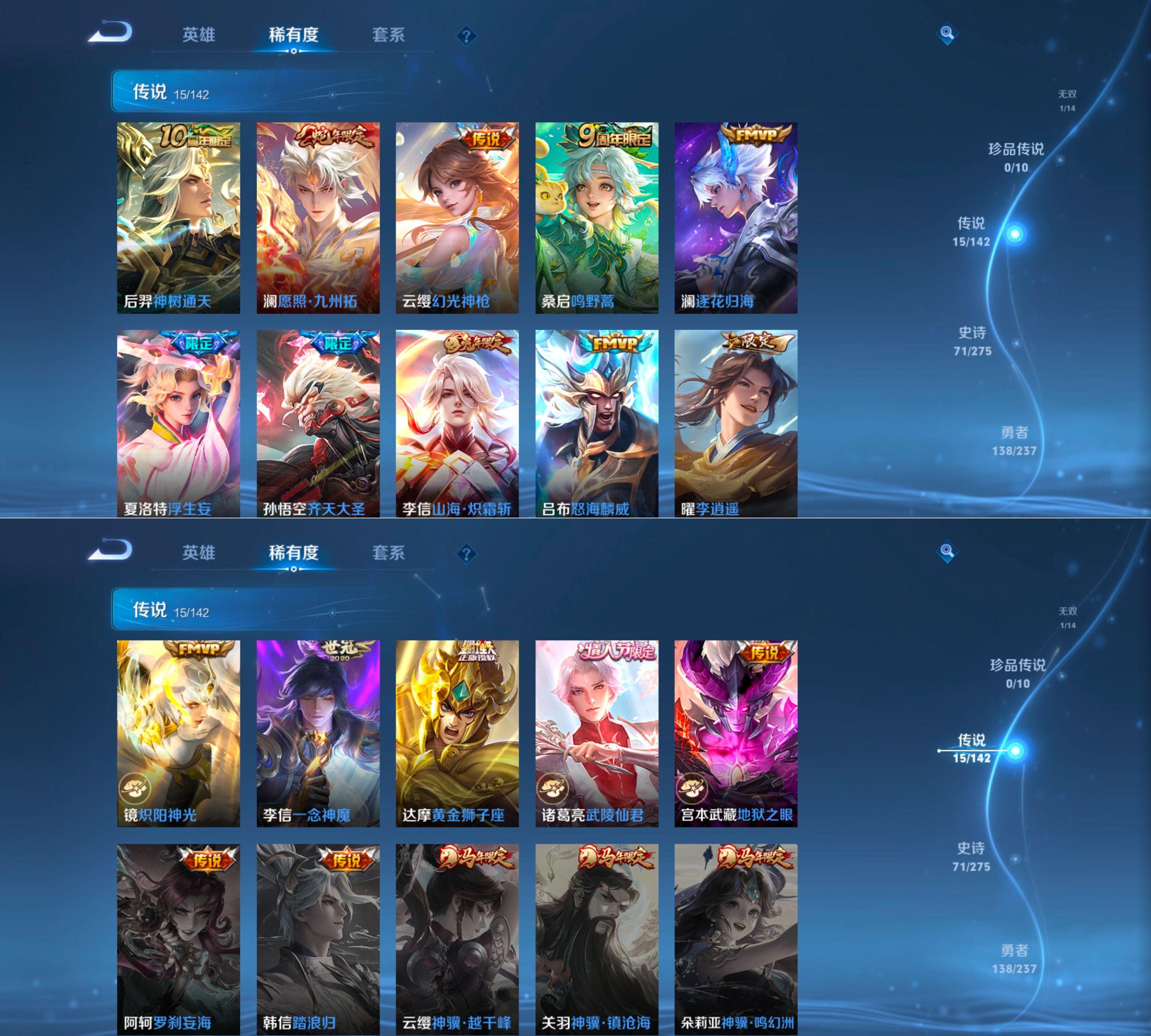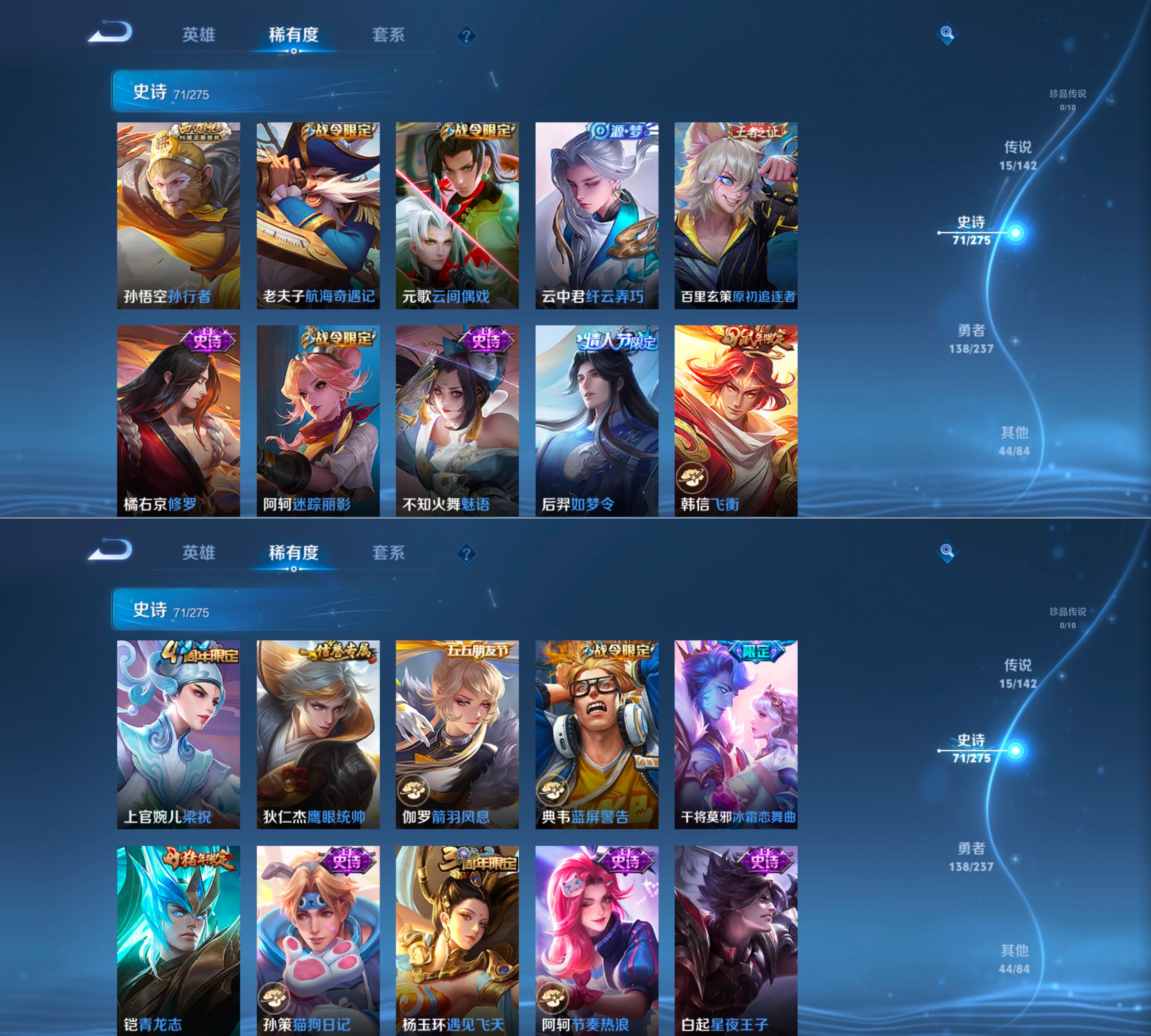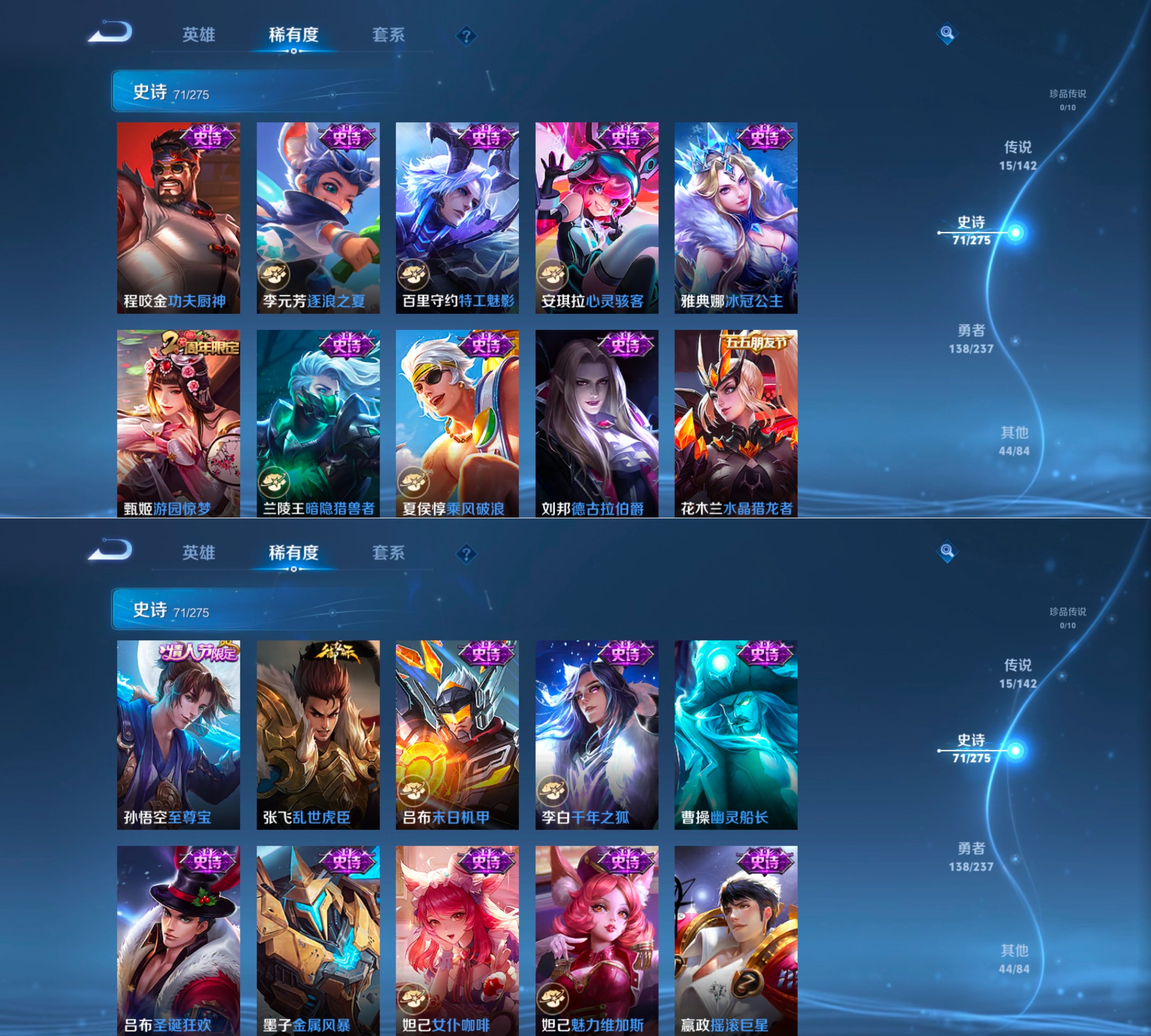贵族等级:v7皮肤数:270情人节限定3 传说品质15 生肖限定4 无双1 英雄数:128