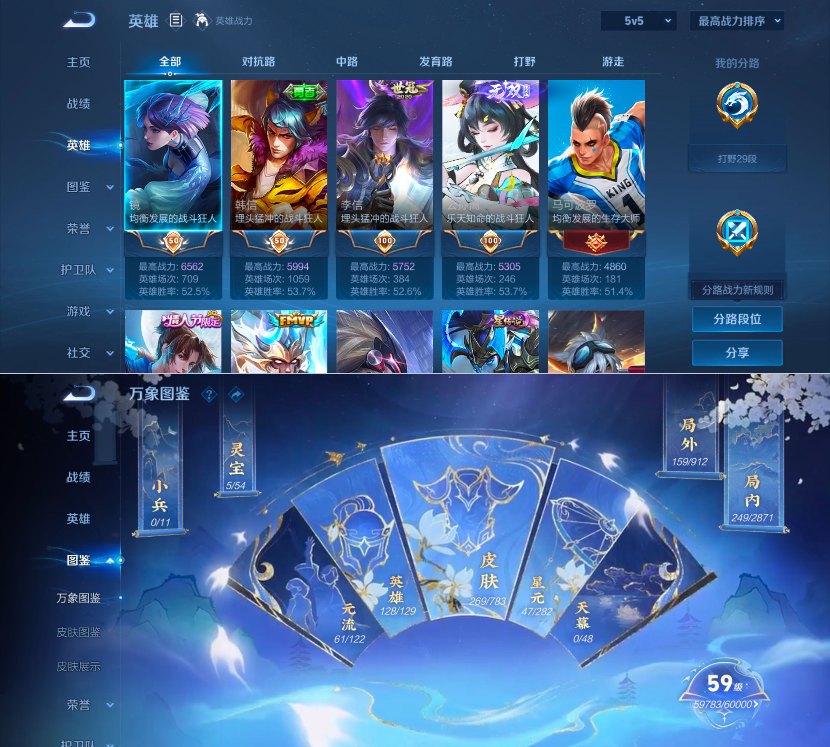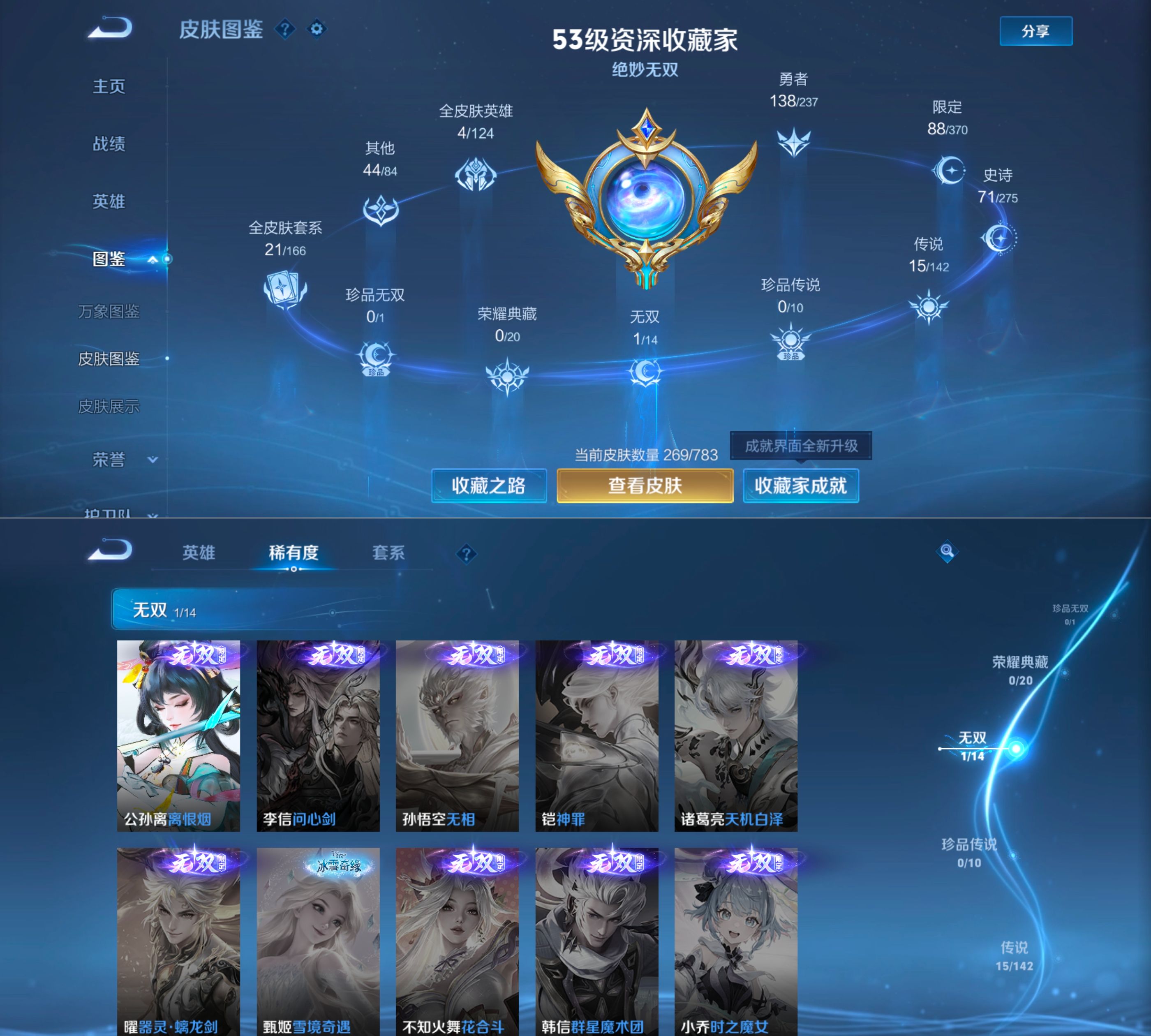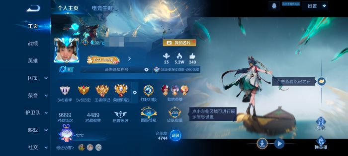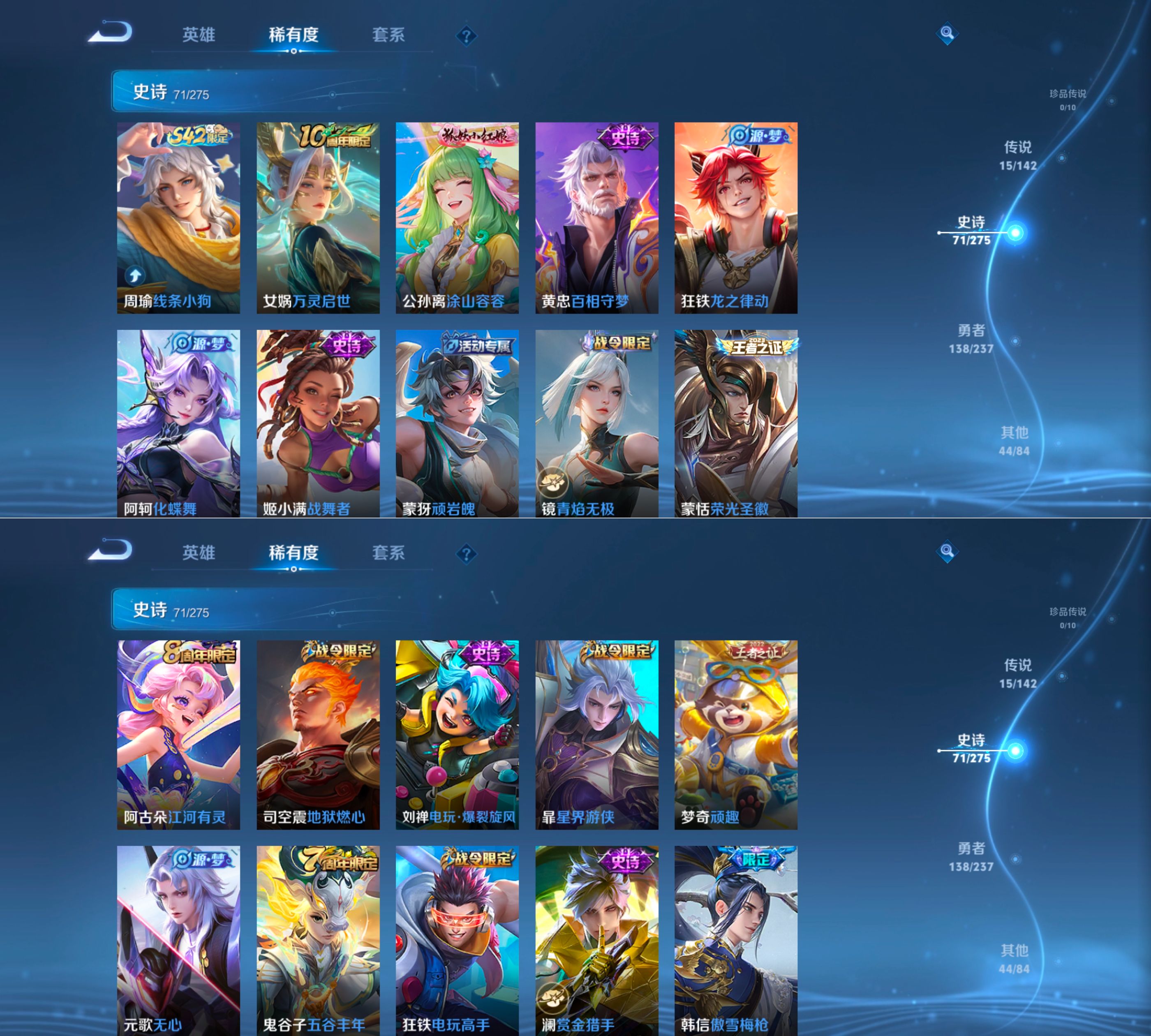 贵族等级:v7皮肤数:270情人节限定3 传说品质15 生肖限定4 无双1 英雄数:128