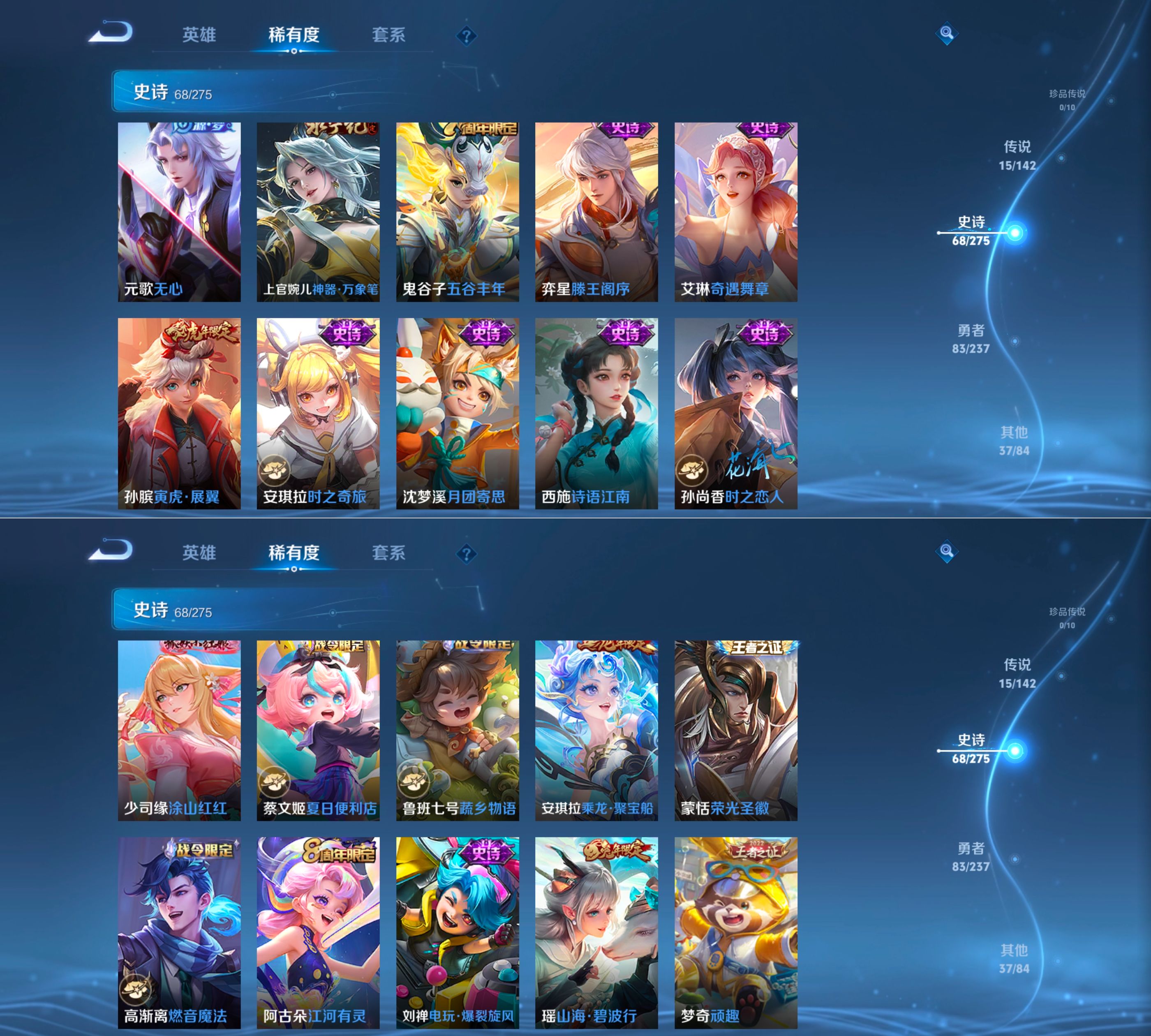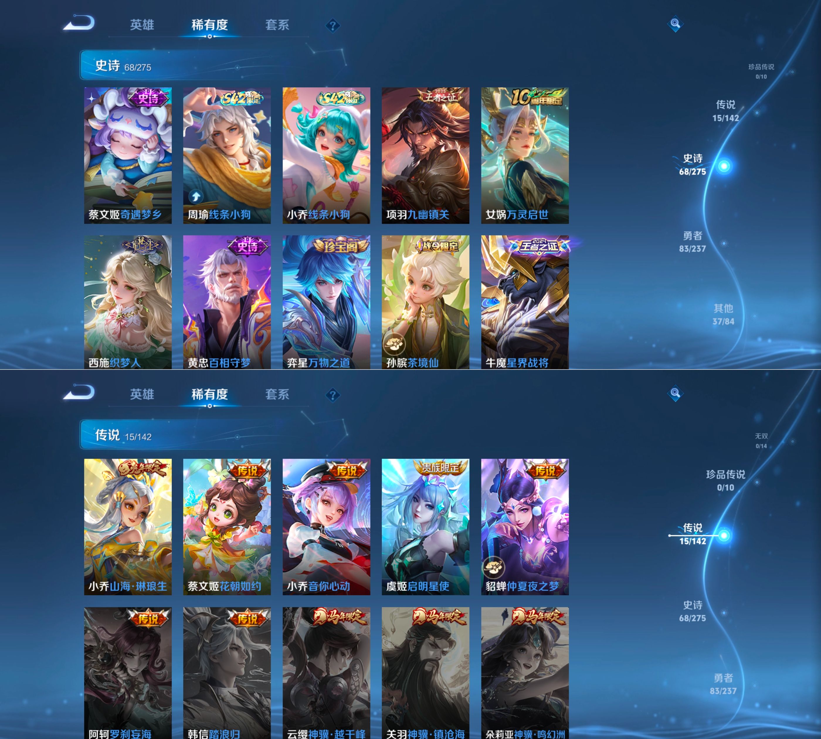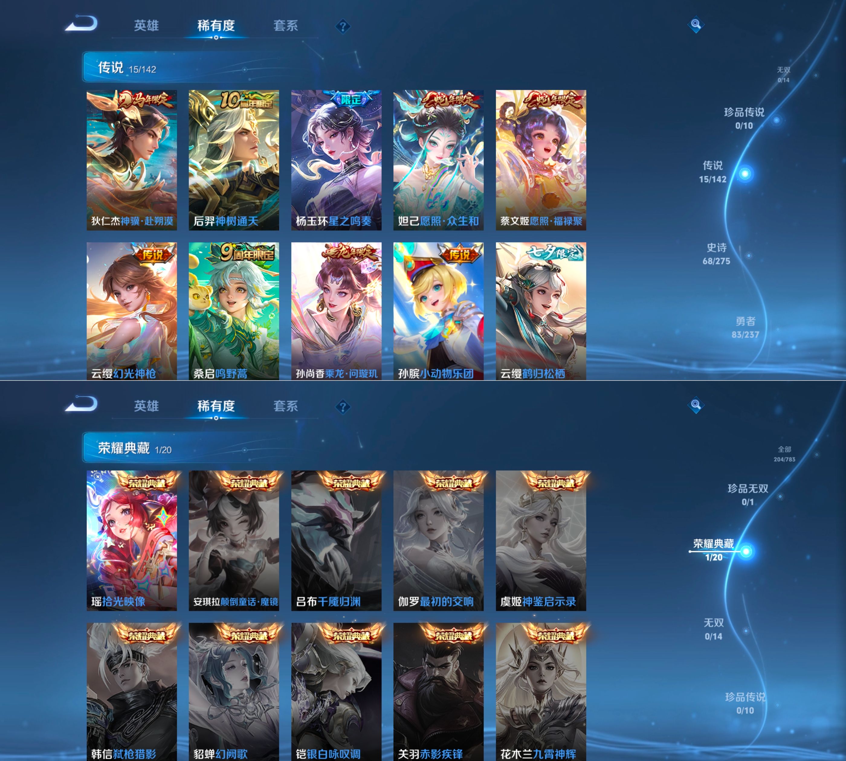 贵族等级:v8皮肤数:204传说品质15 生肖限定8 荣耀典藏1 英雄数:126