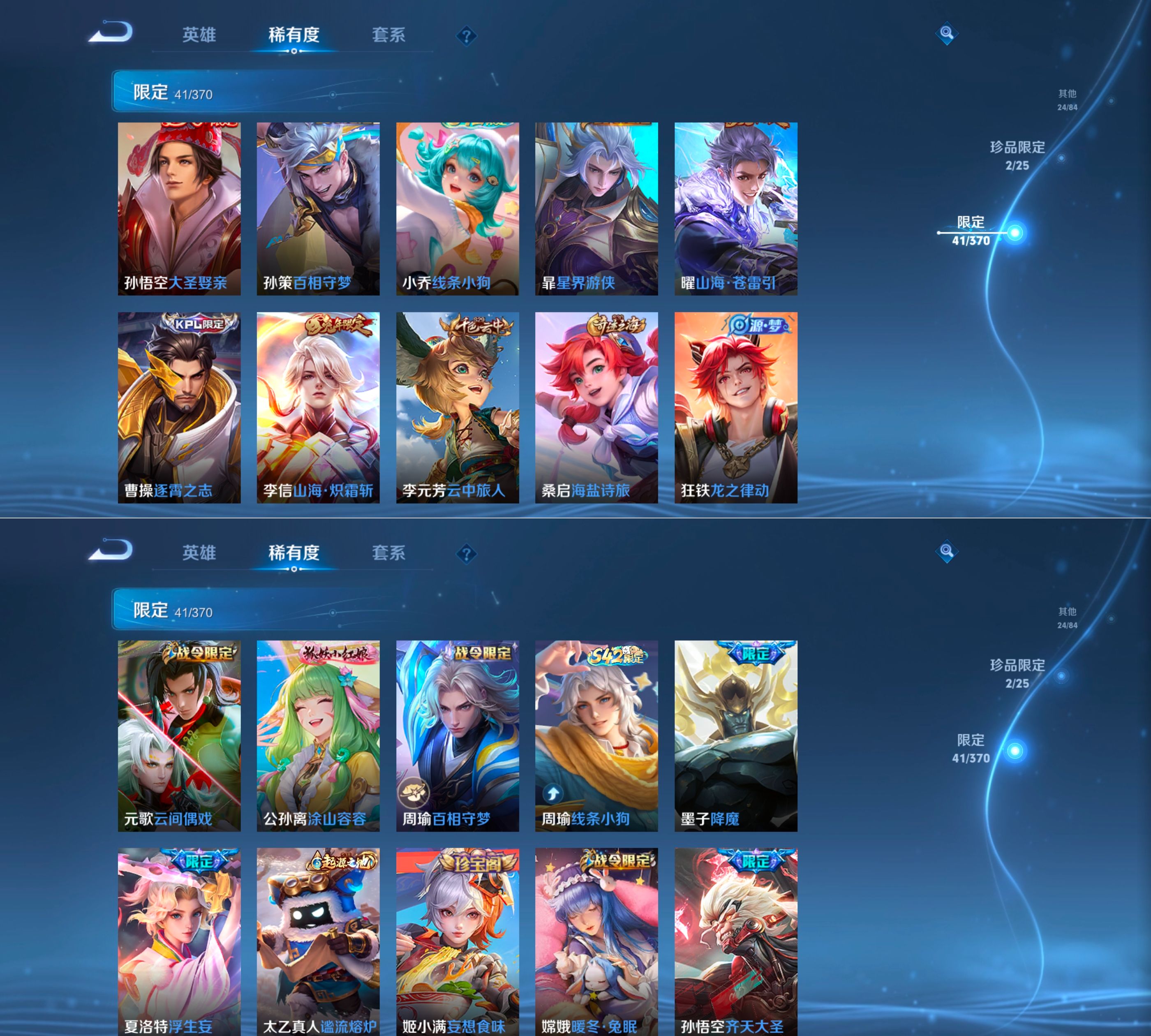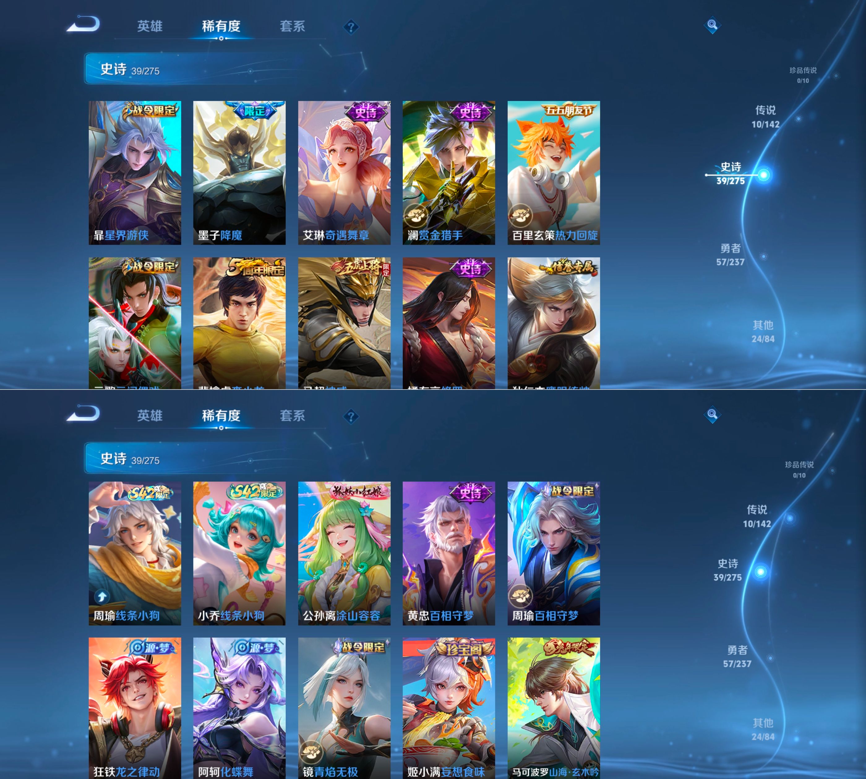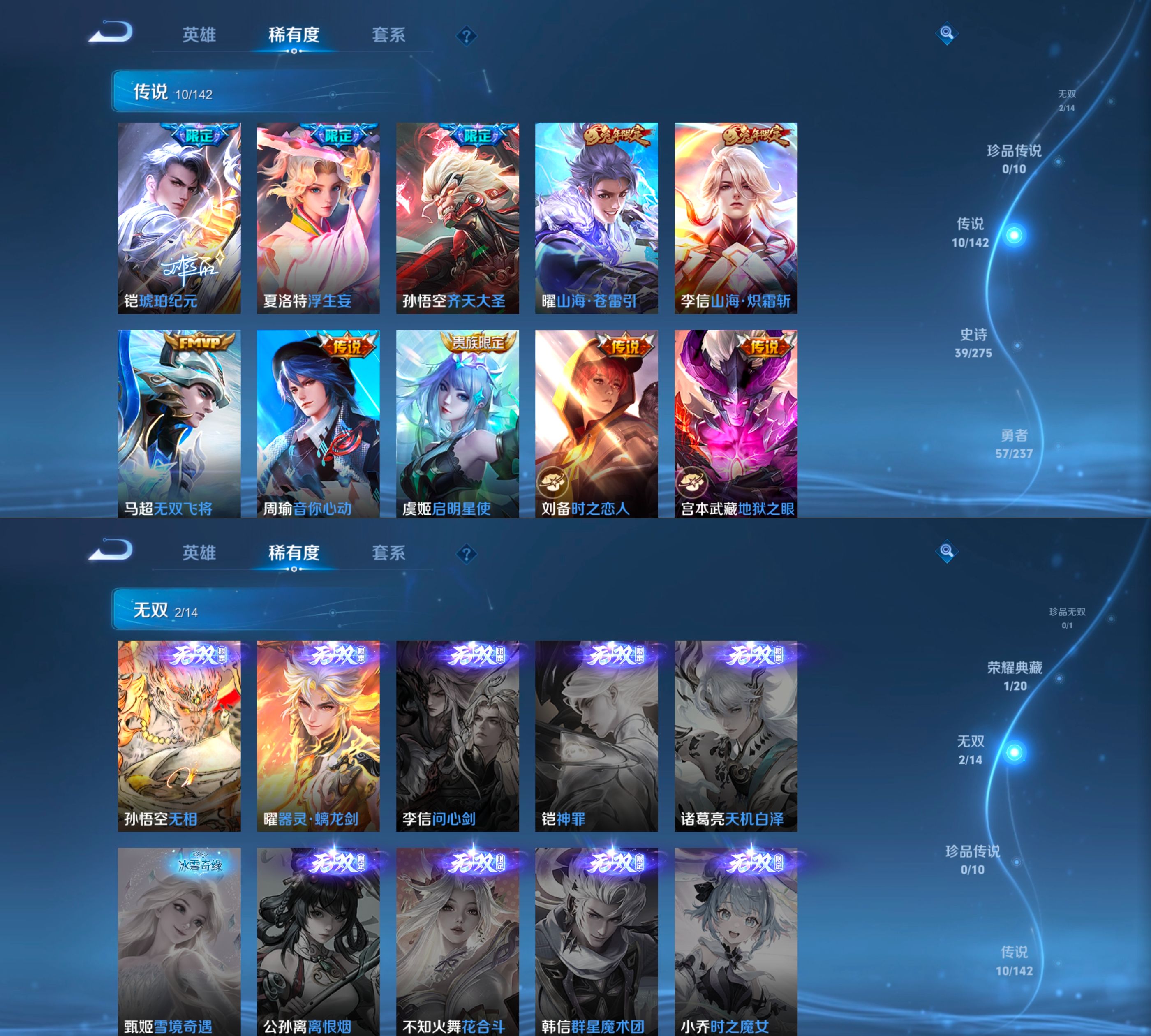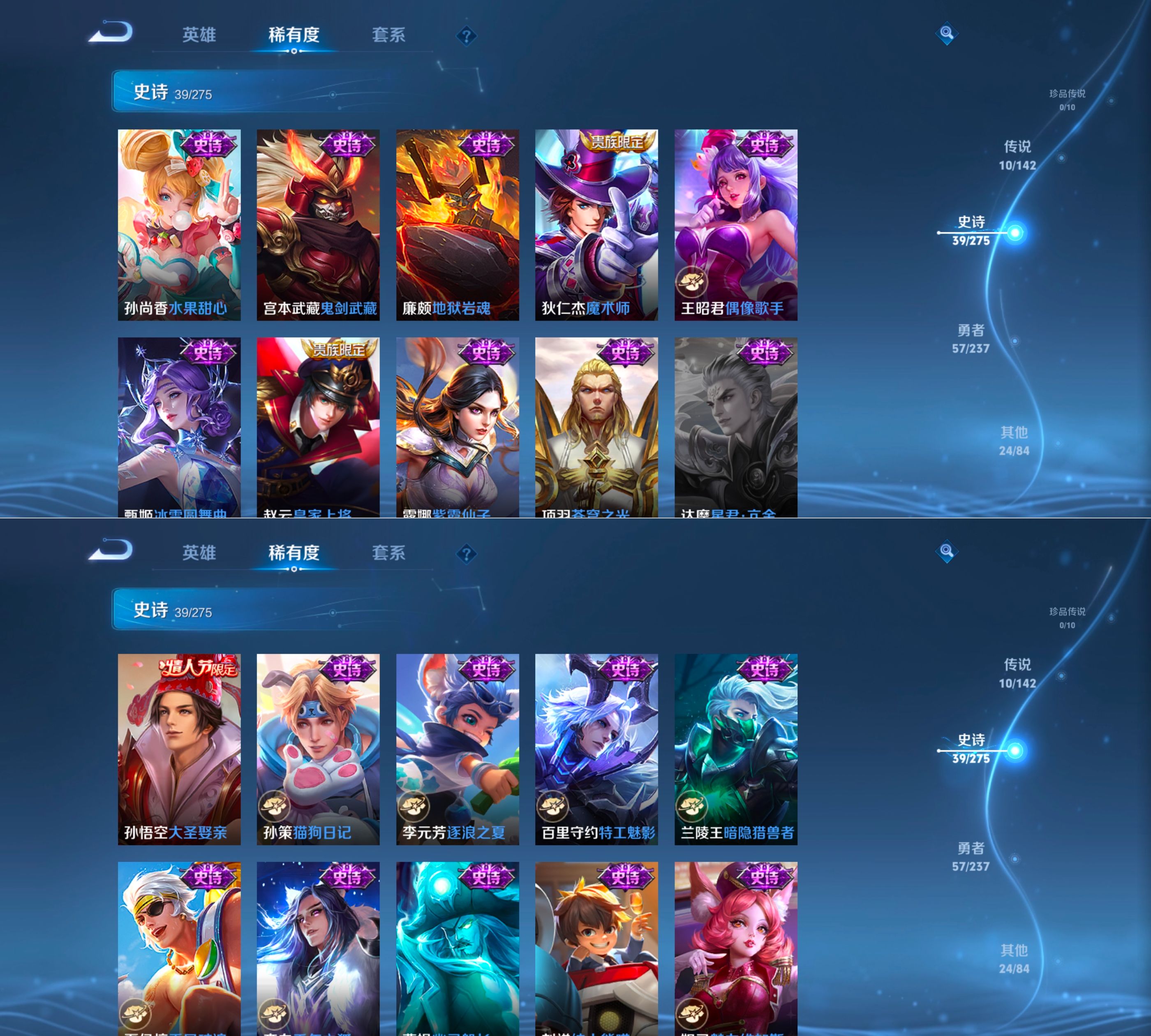 贵族等级:v8皮肤数:133情人节限定1 传说品质10 无双2 生肖限定3 荣耀典藏1 英雄数:124
