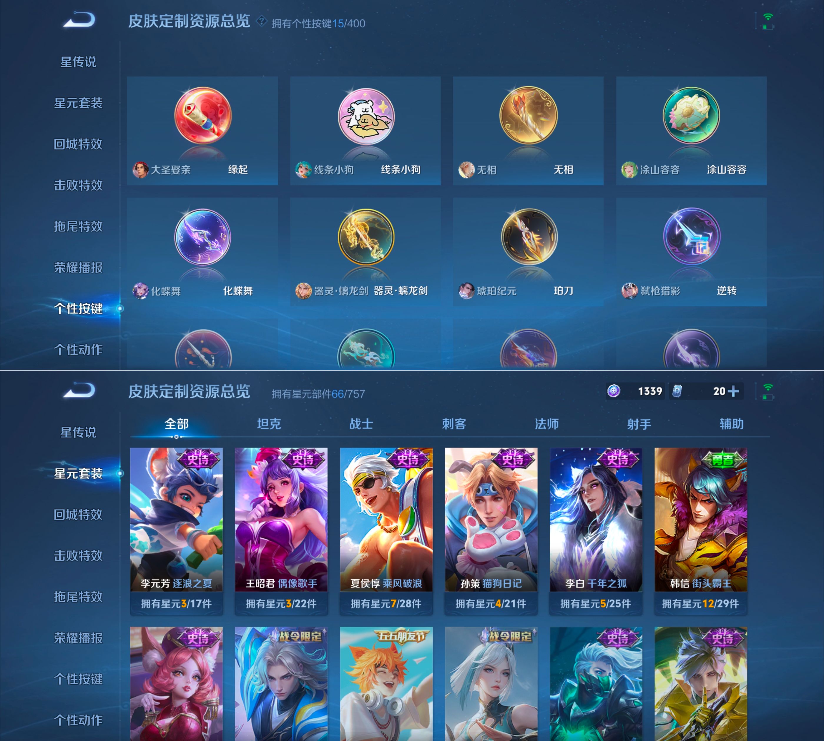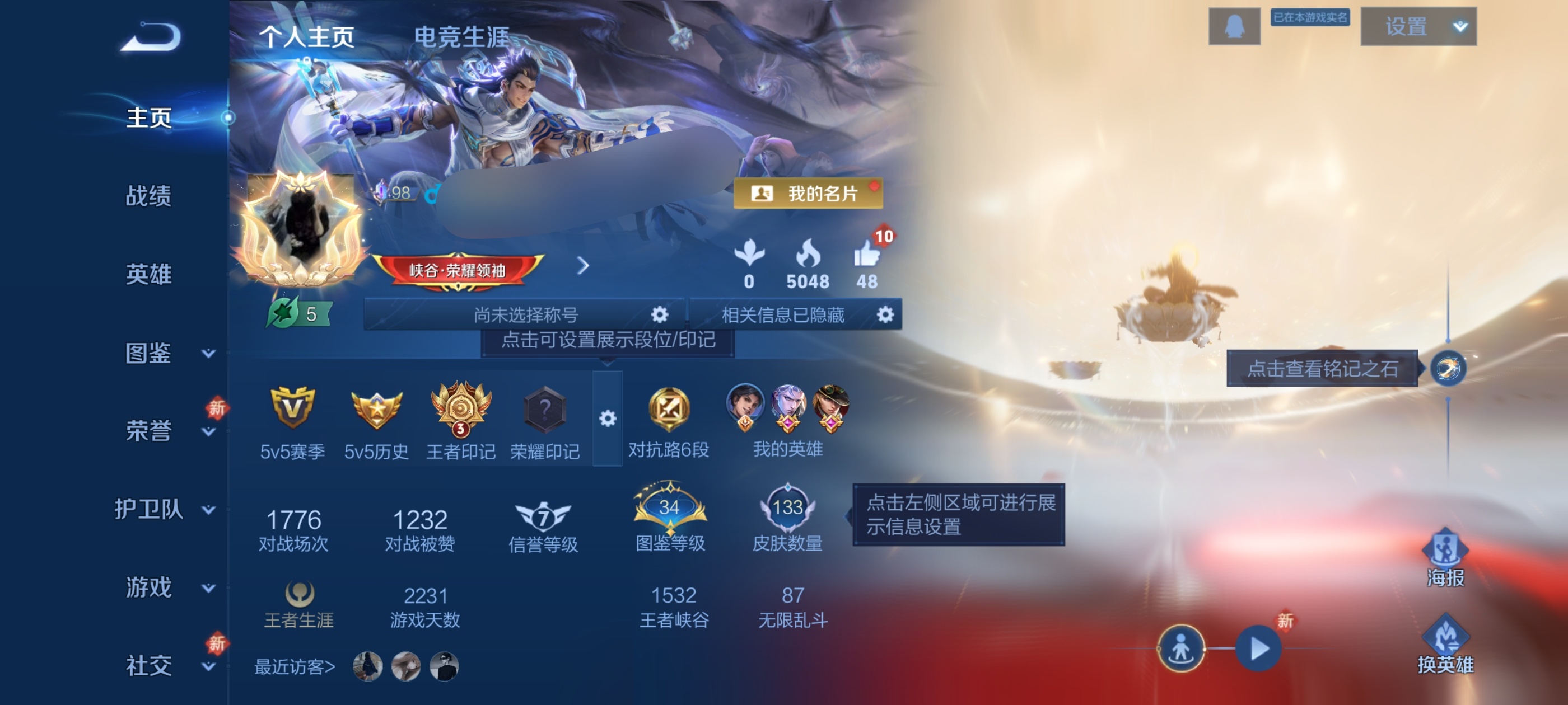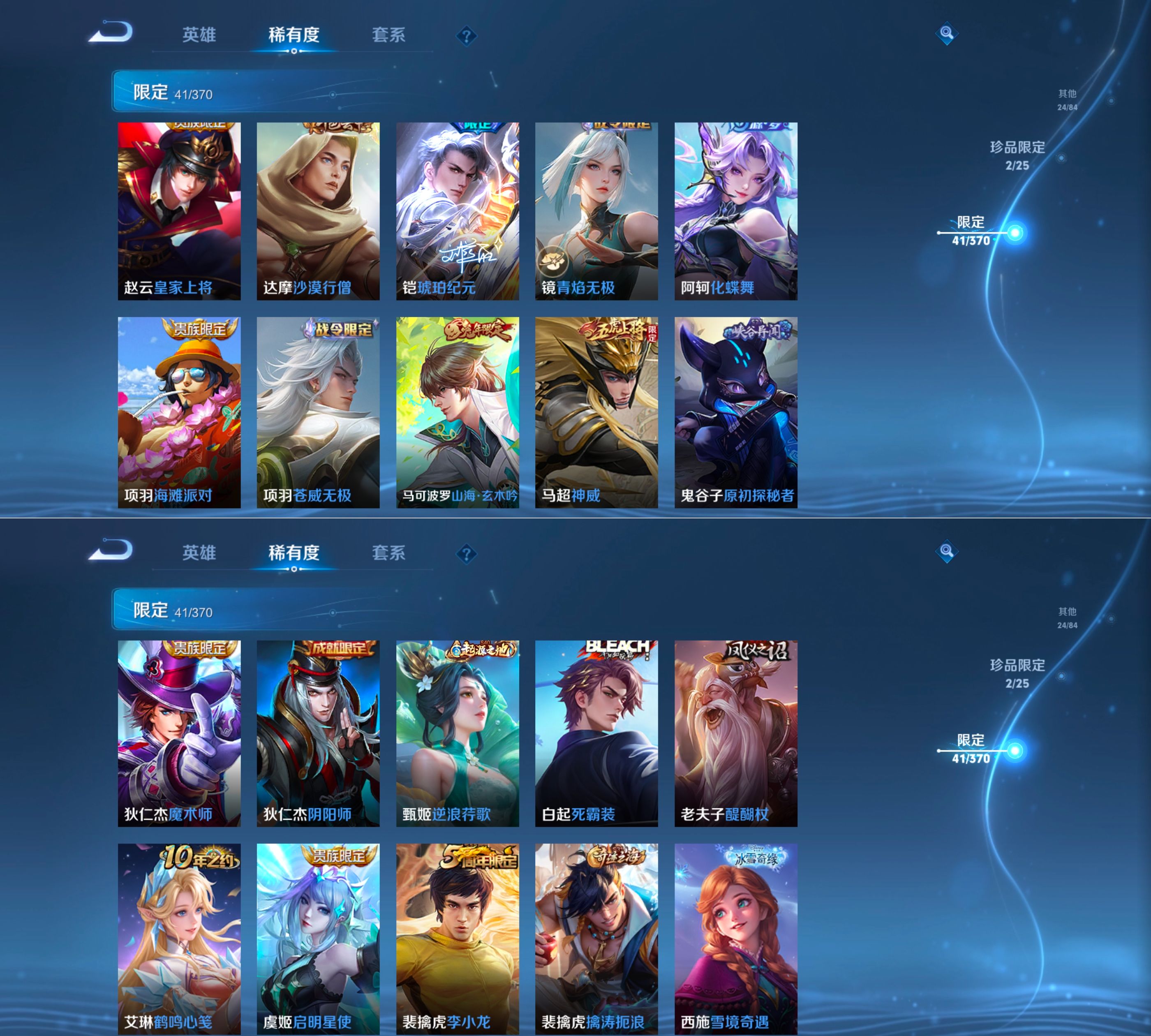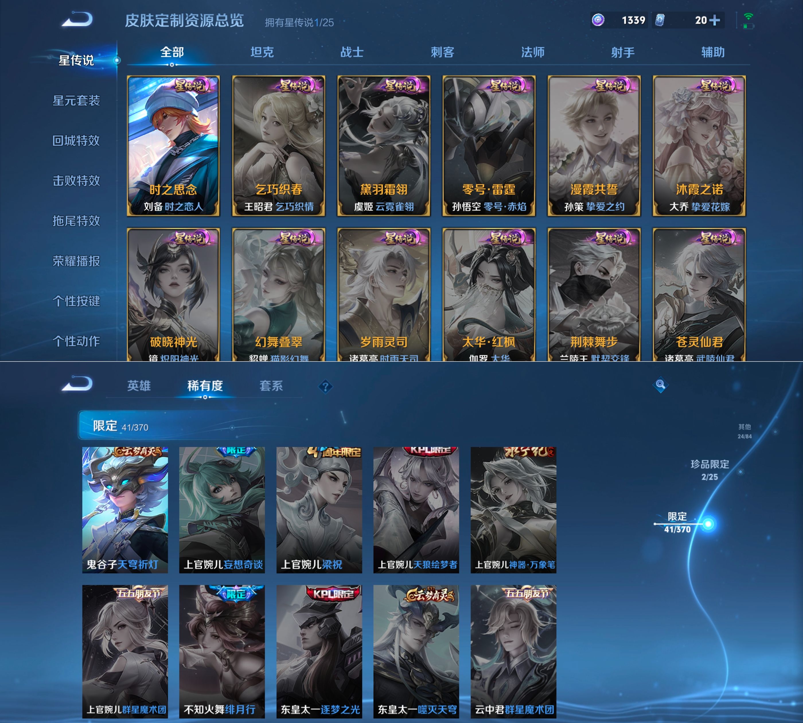 贵族等级:v8皮肤数:133情人节限定1 传说品质10 无双2 生肖限定3 荣耀典藏1 英雄数:124