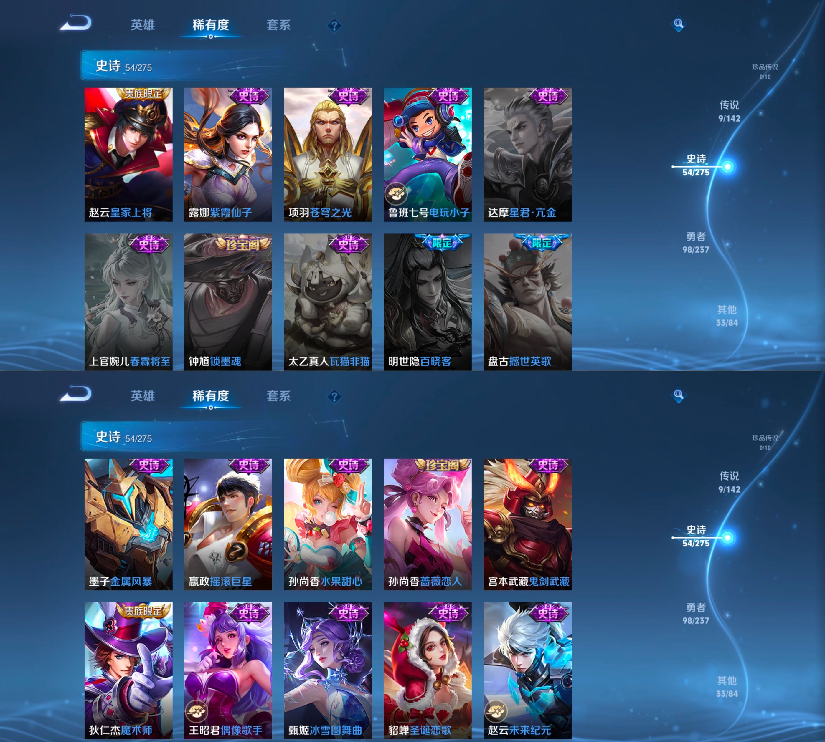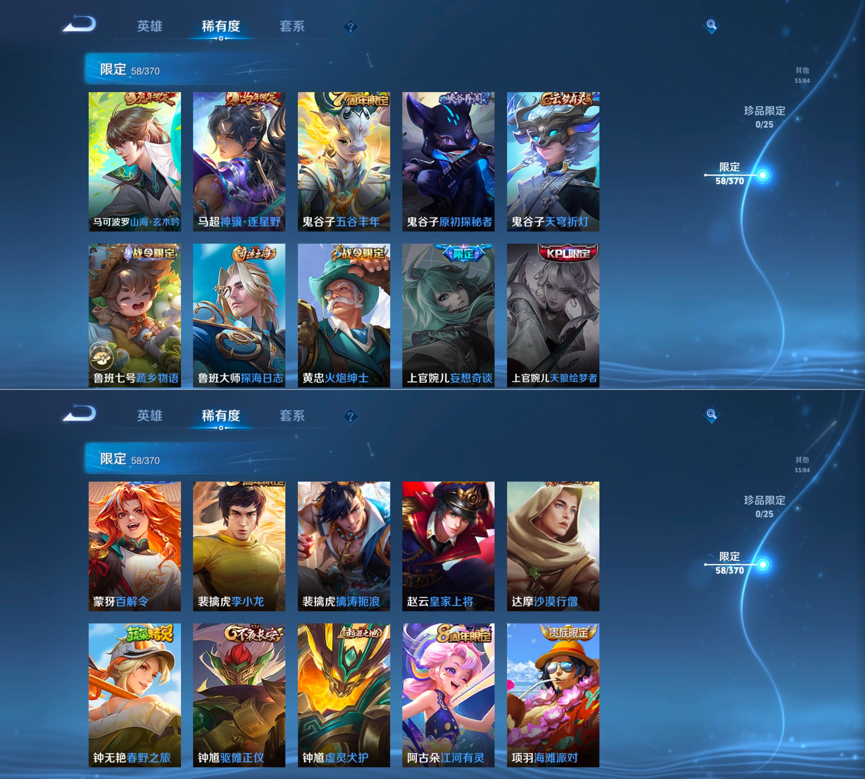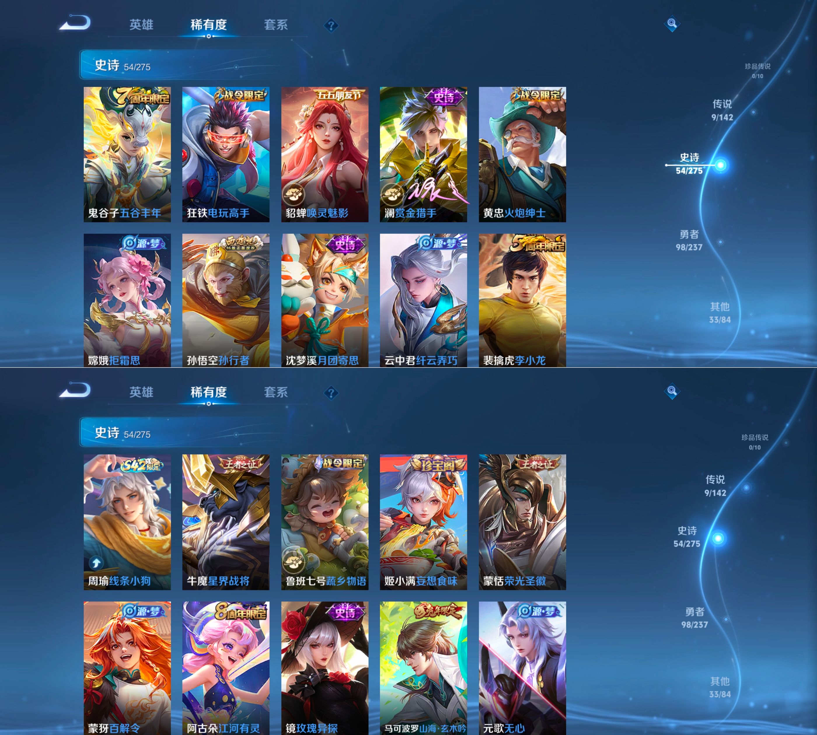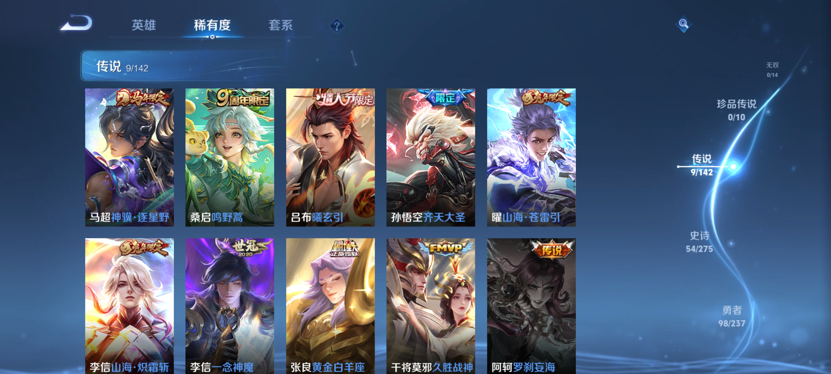 贵族等级:v7皮肤数:194生肖限定5 传说品质9 情人节限定1 英雄数:128