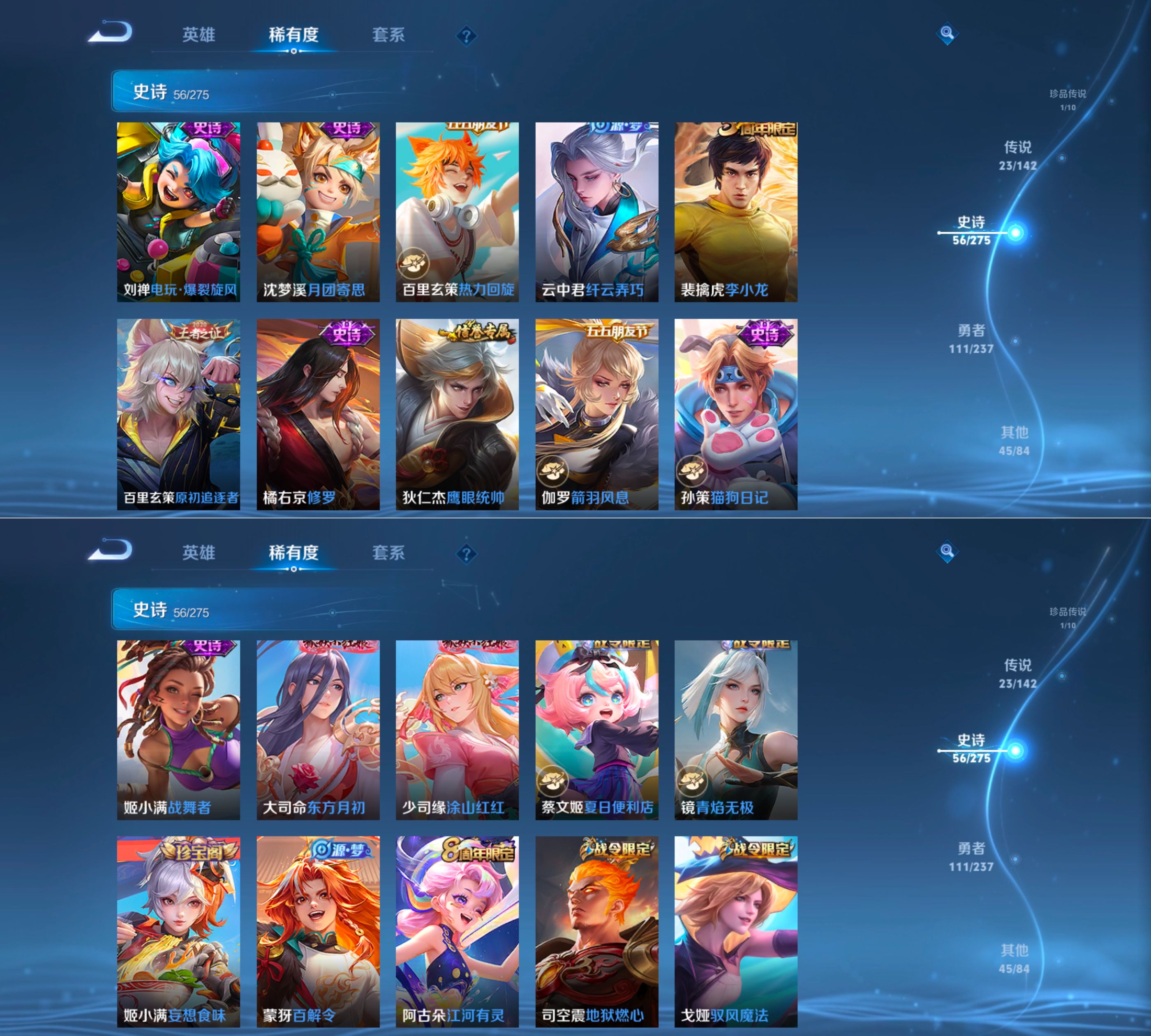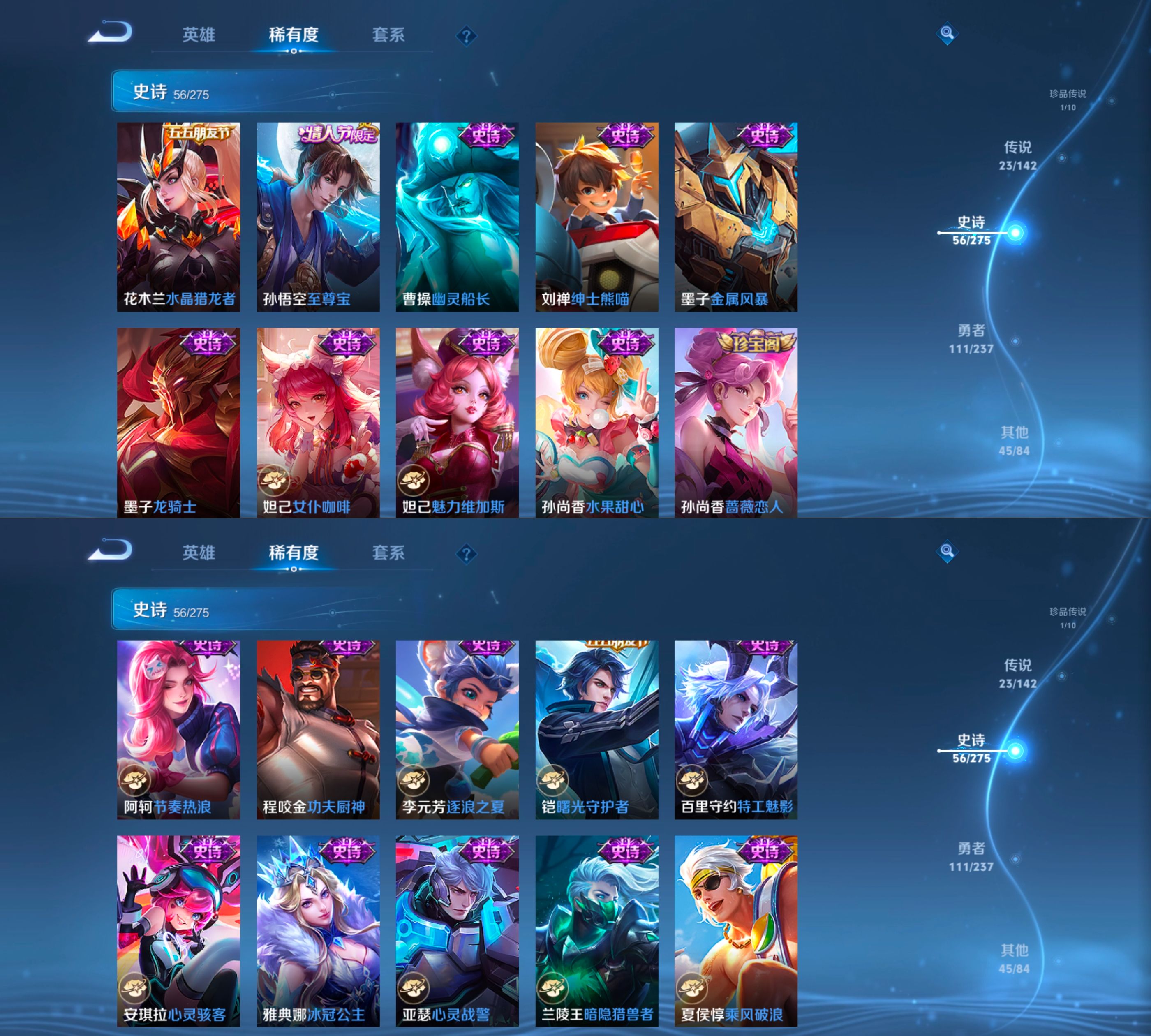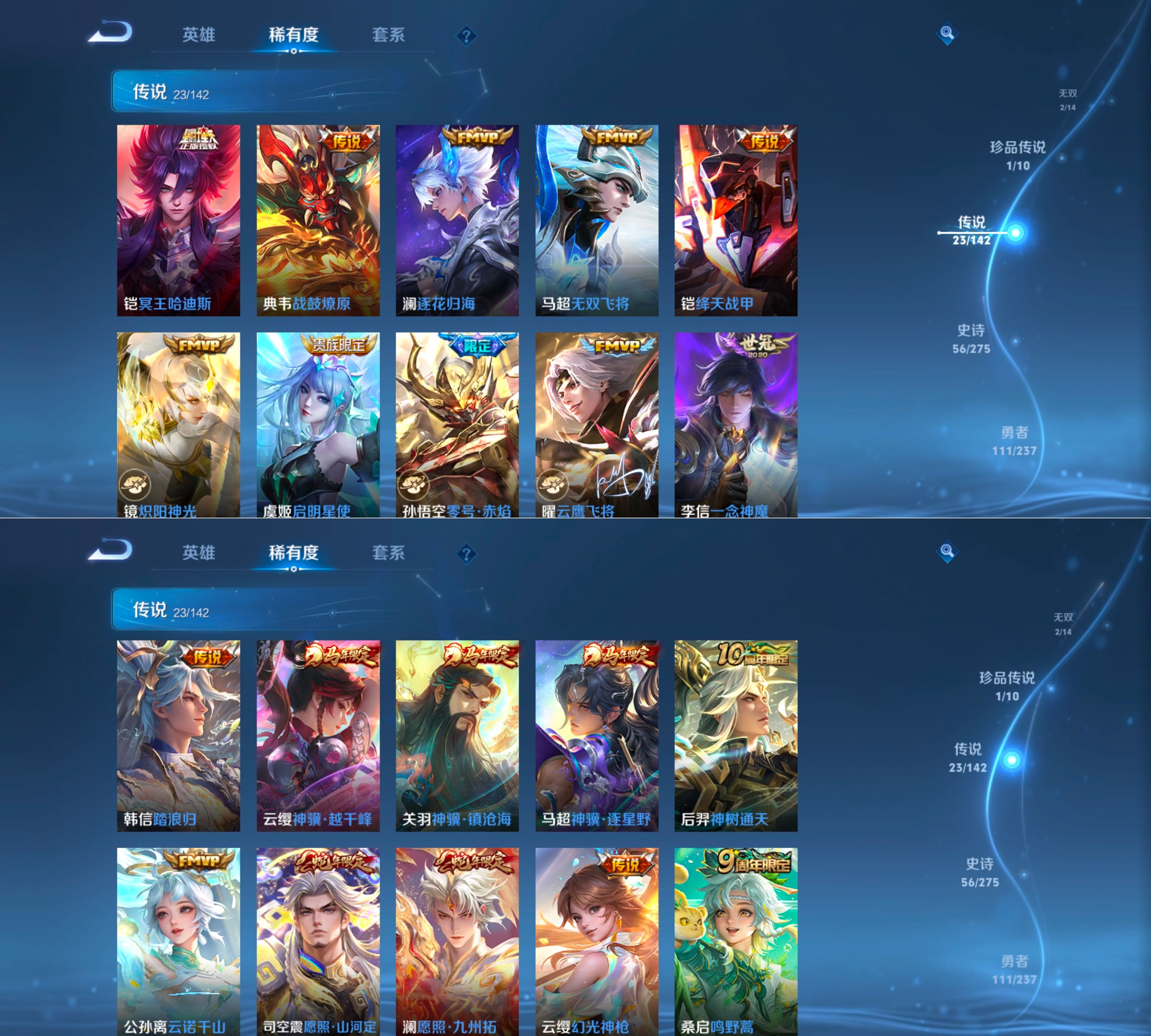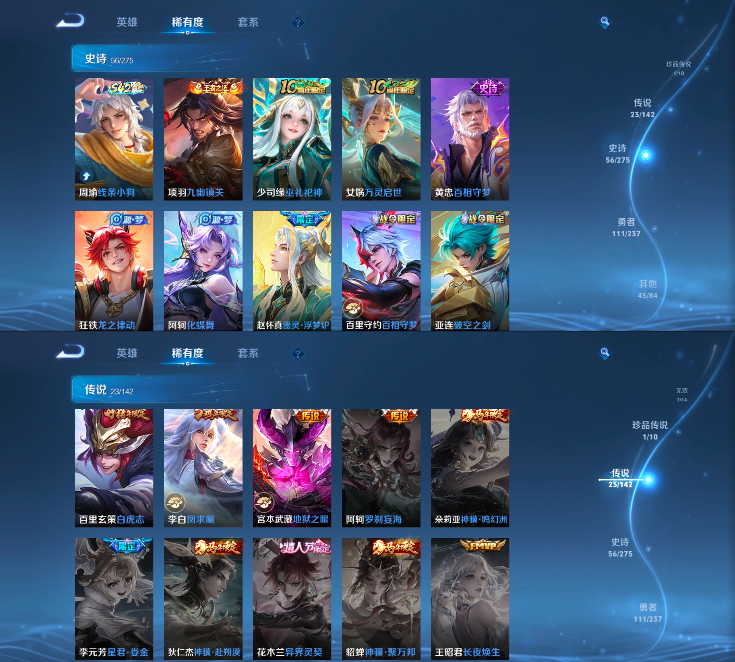 贵族等级:v8皮肤数:241传说品质23 生肖限定7 情人节限定1 无双2 珍品传说1 荣耀典藏1 英雄数:127