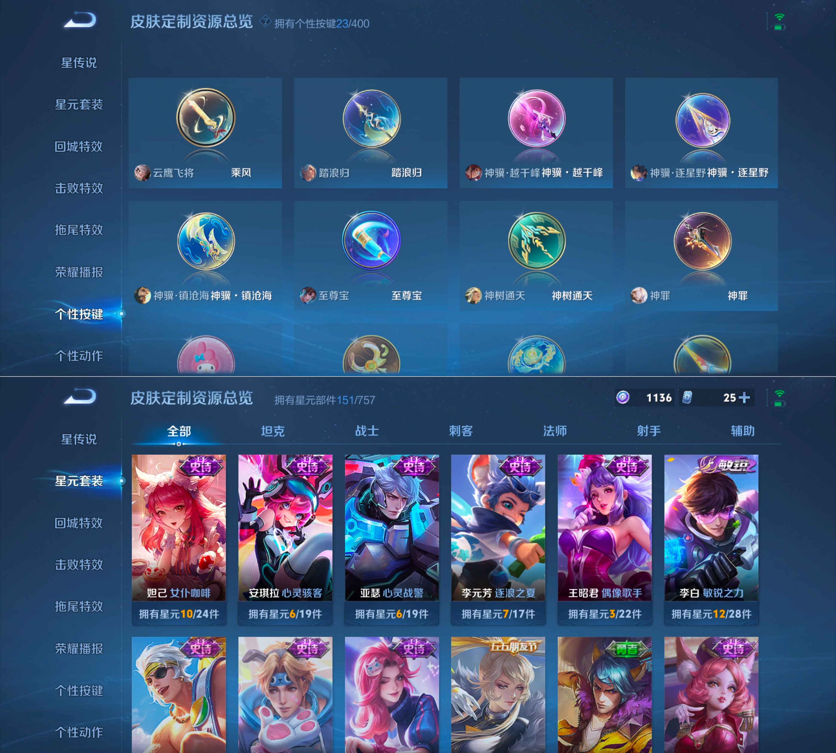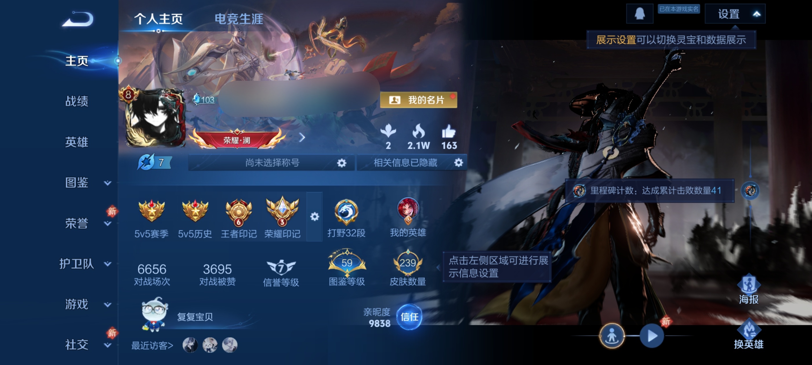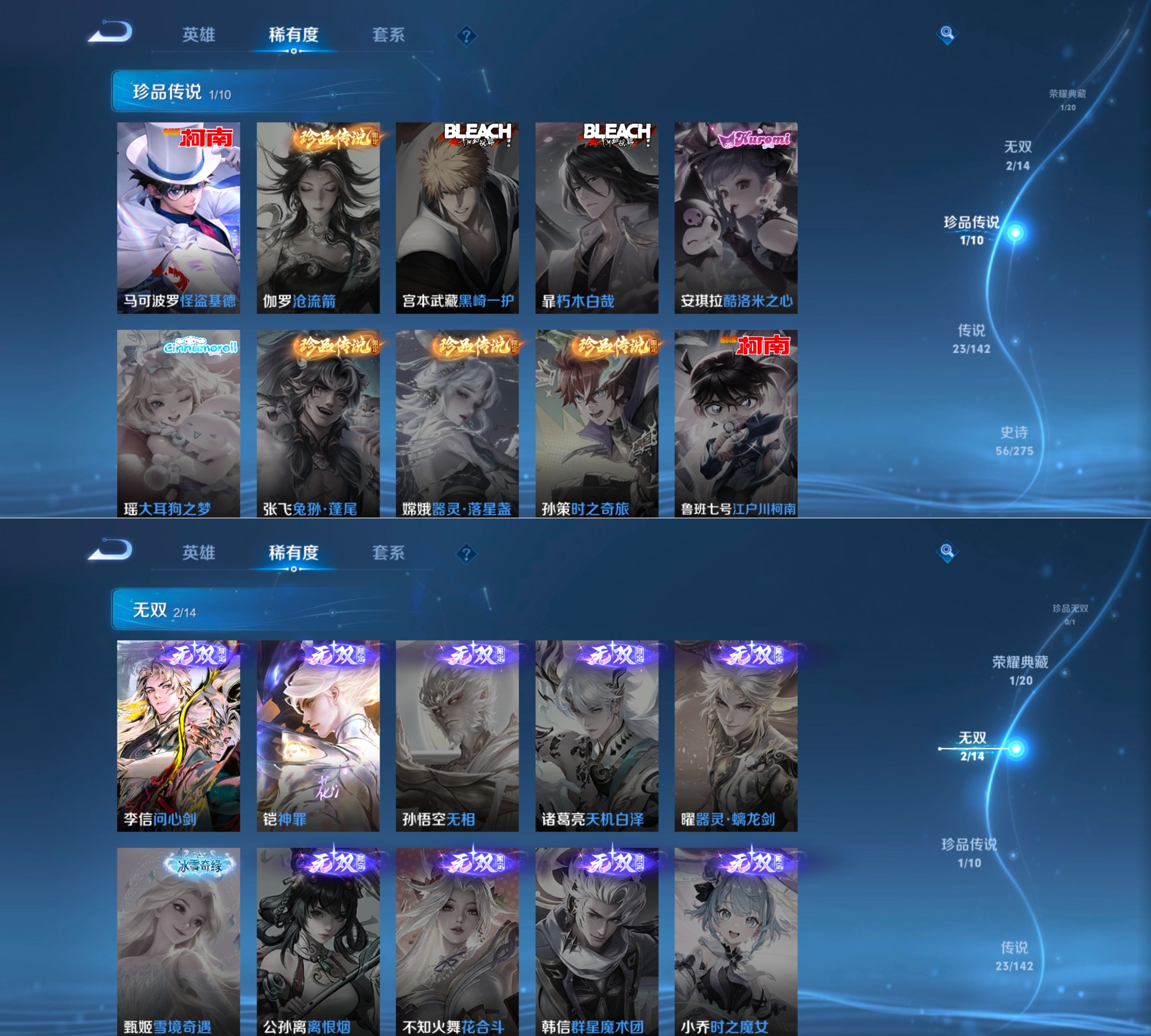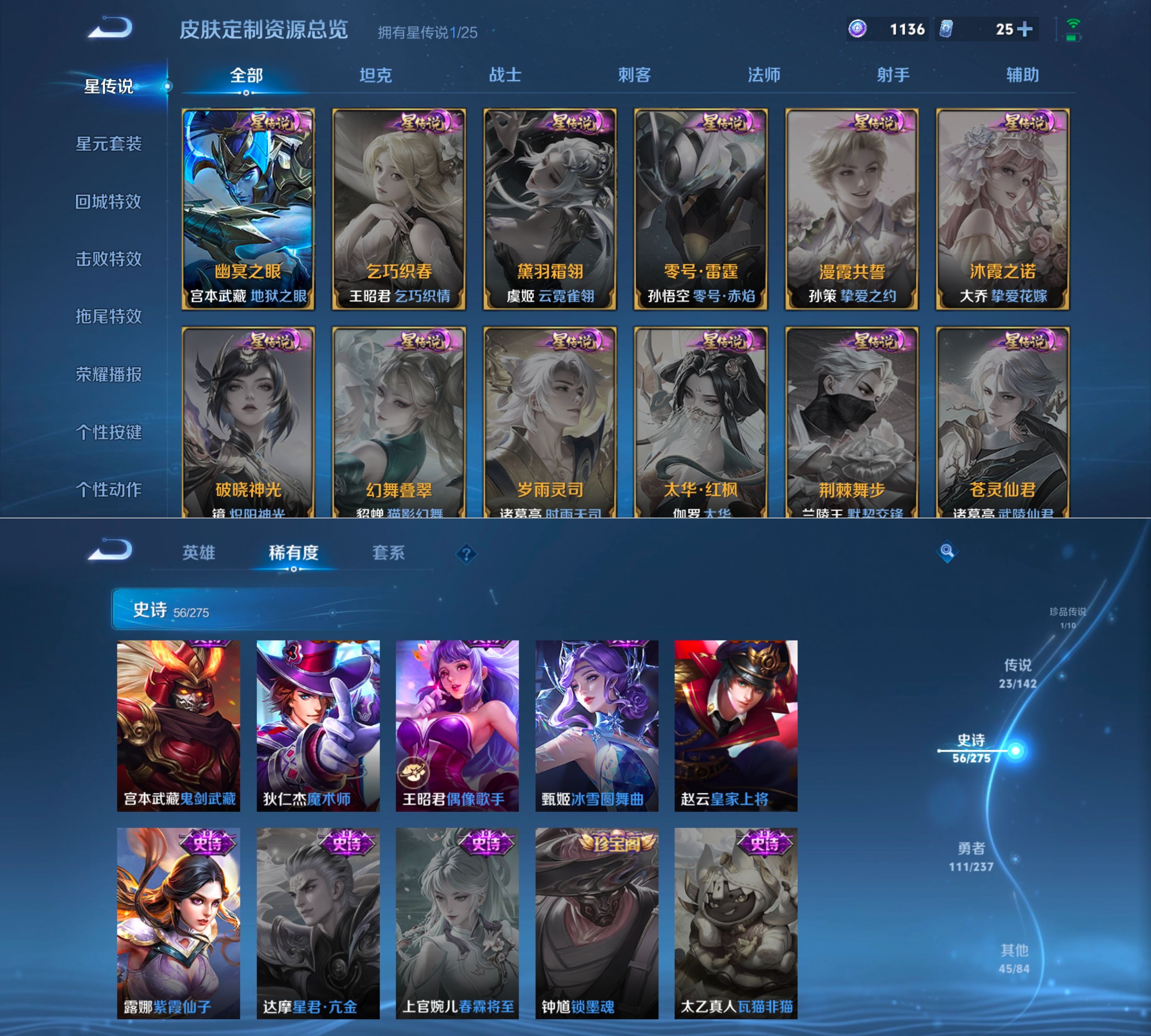 贵族等级:v8皮肤数:241传说品质23 生肖限定7 情人节限定1 无双2 珍品传说1 荣耀典藏1 英雄数:127