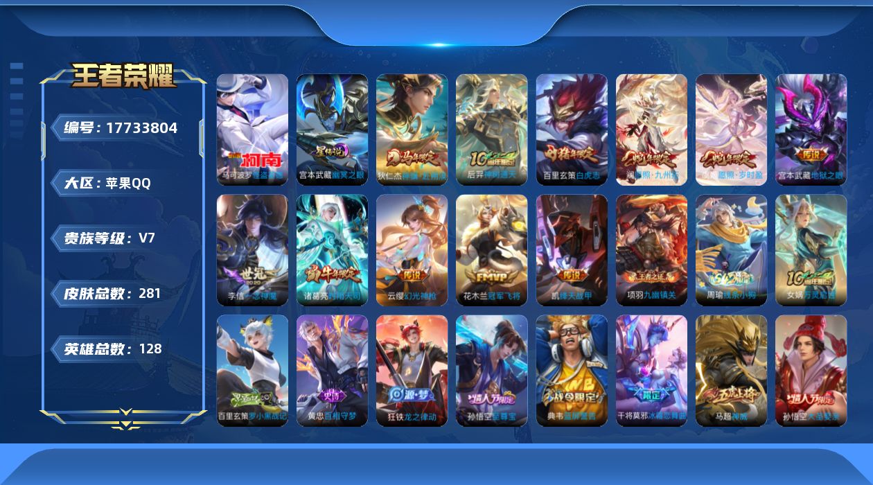 贵族等级:v7皮肤数:281传说品质11 生肖限定6 情人节限定2 珍品传说1 英雄数:128