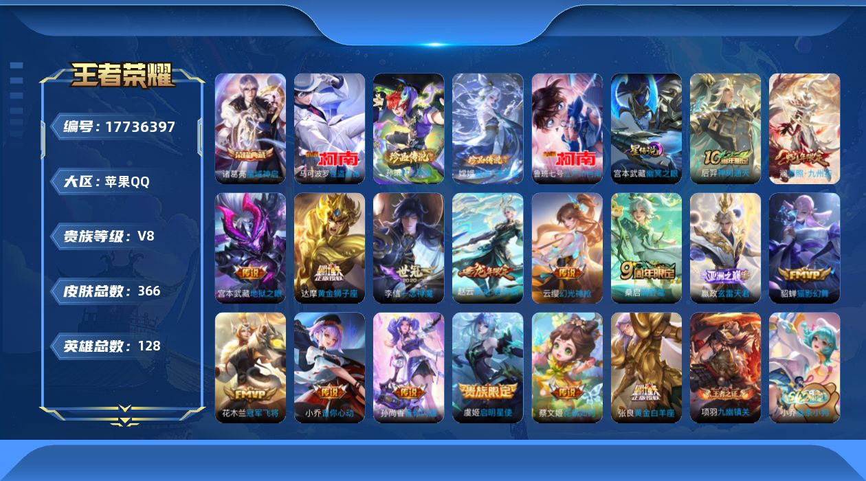 贵族等级:v8皮肤数:371传说品质16 生肖限定5 荣耀典藏1 情人节限定2 珍品传说4 英雄数:128