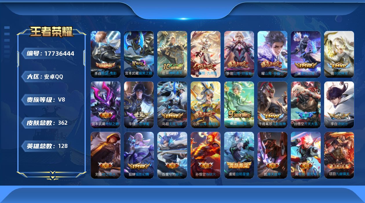 贵族等级:v8皮肤数:362生肖限定9 传说品质21 情人节限定2 荣耀典藏1 英雄数:128