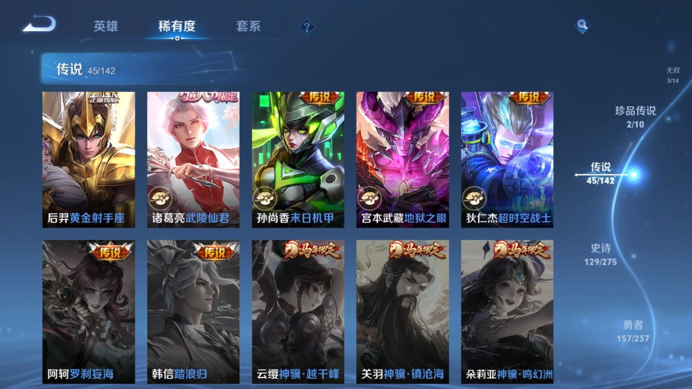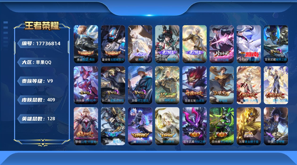 贵族等级:v9皮肤数:409传说品质45 情人节限定5 生肖限定10 珍品传说2 荣耀典藏2 无双3 英雄数:128