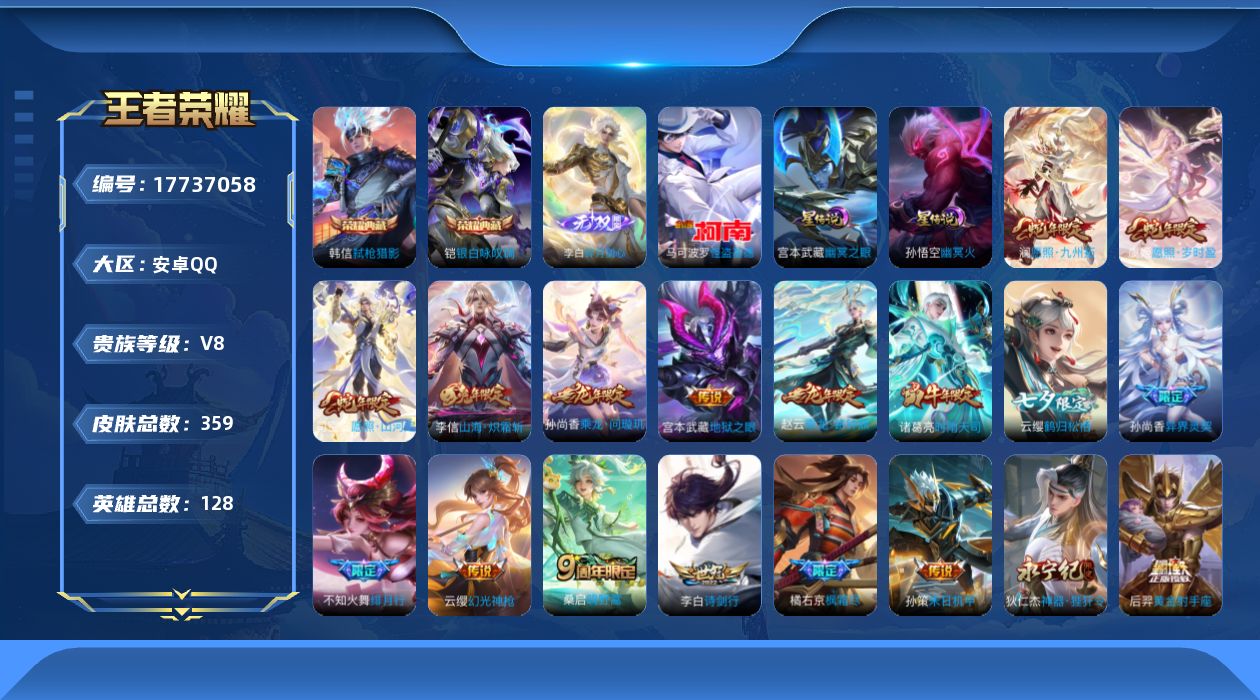 贵族等级:v8皮肤数:359传说品质23 生肖限定9 情人节限定2 珍品传说1 无双1 荣耀典藏2 英雄数:128