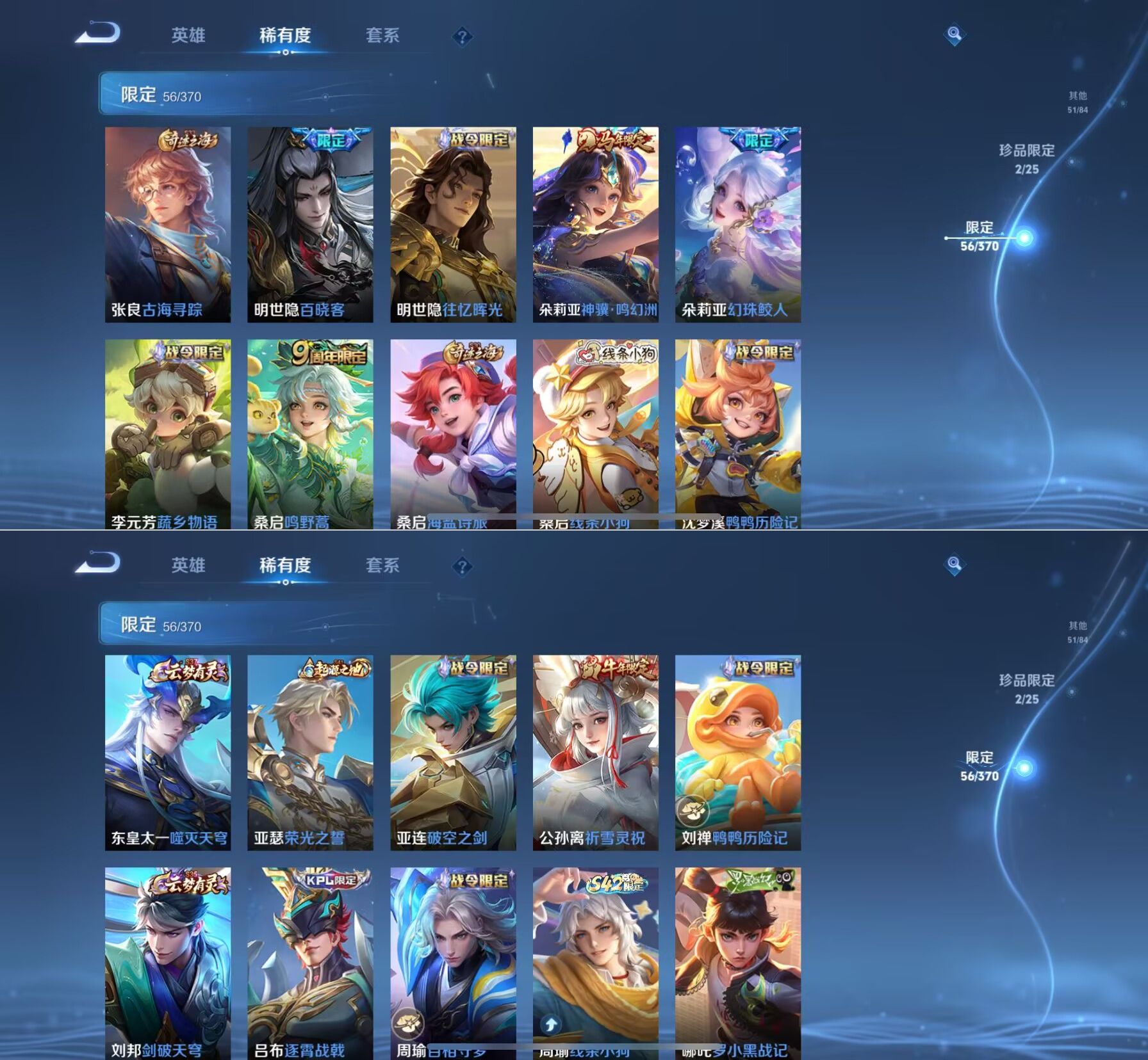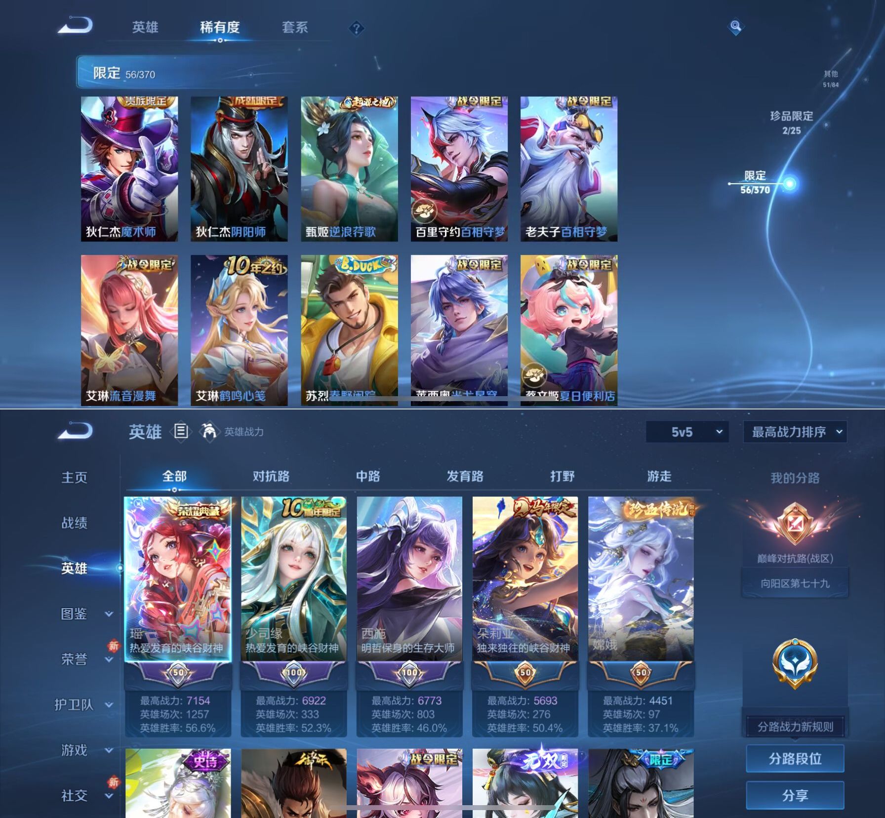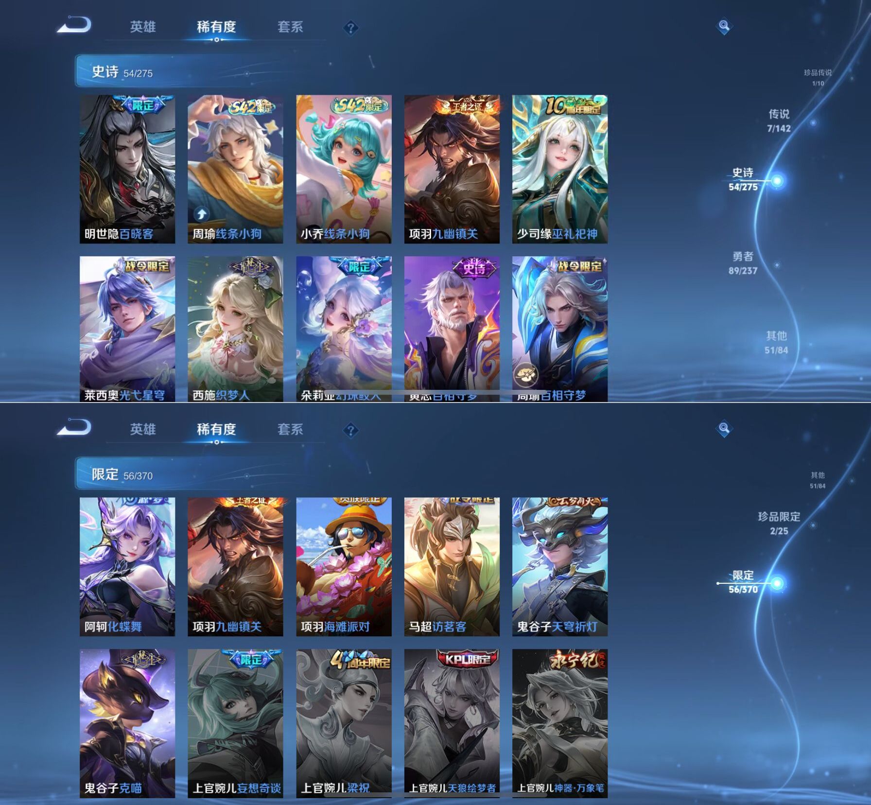 贵族等级:v7皮肤数:205传说品质7 荣耀典藏2 珍品传说1 生肖限定2 无双1 英雄数:127