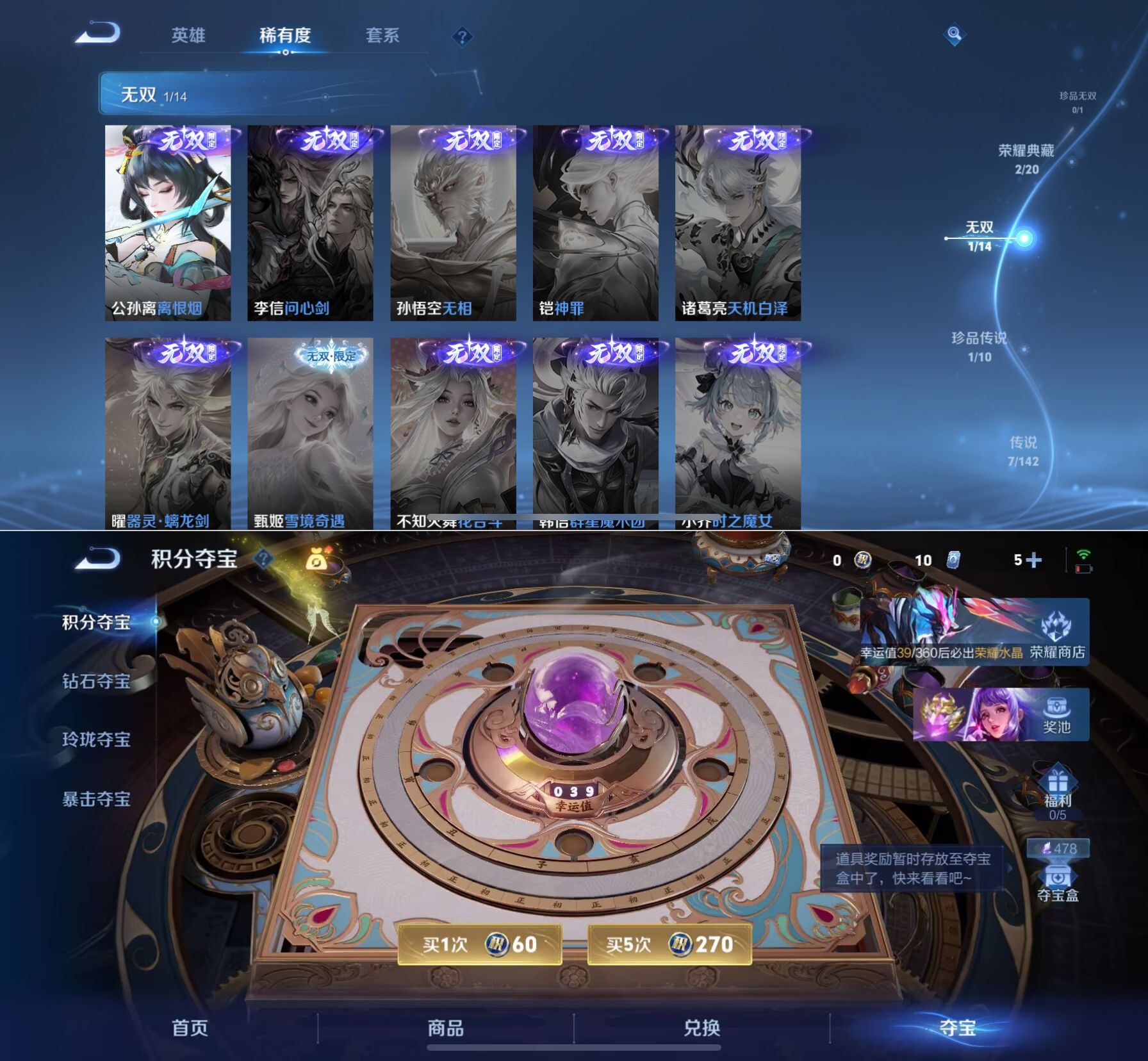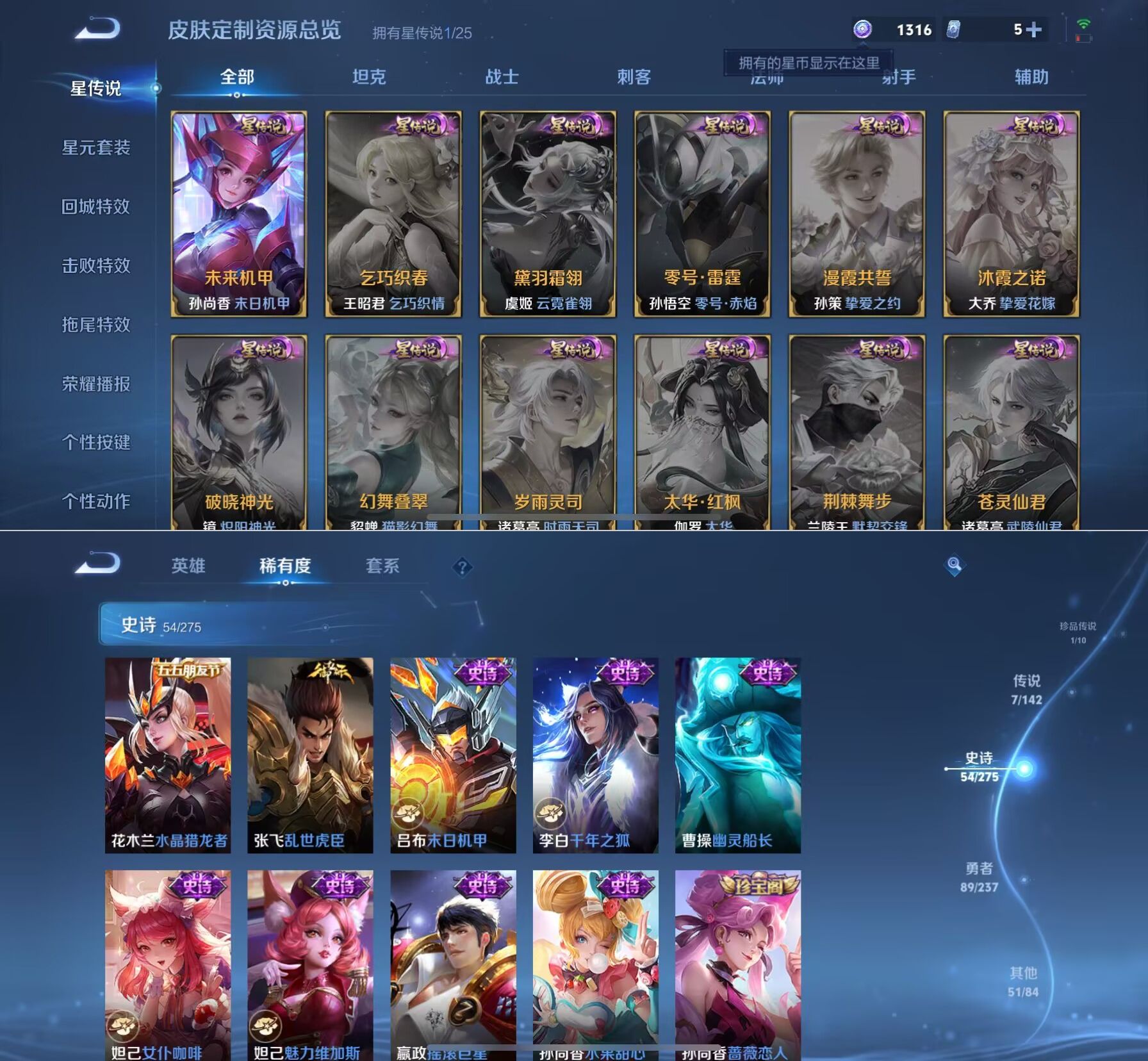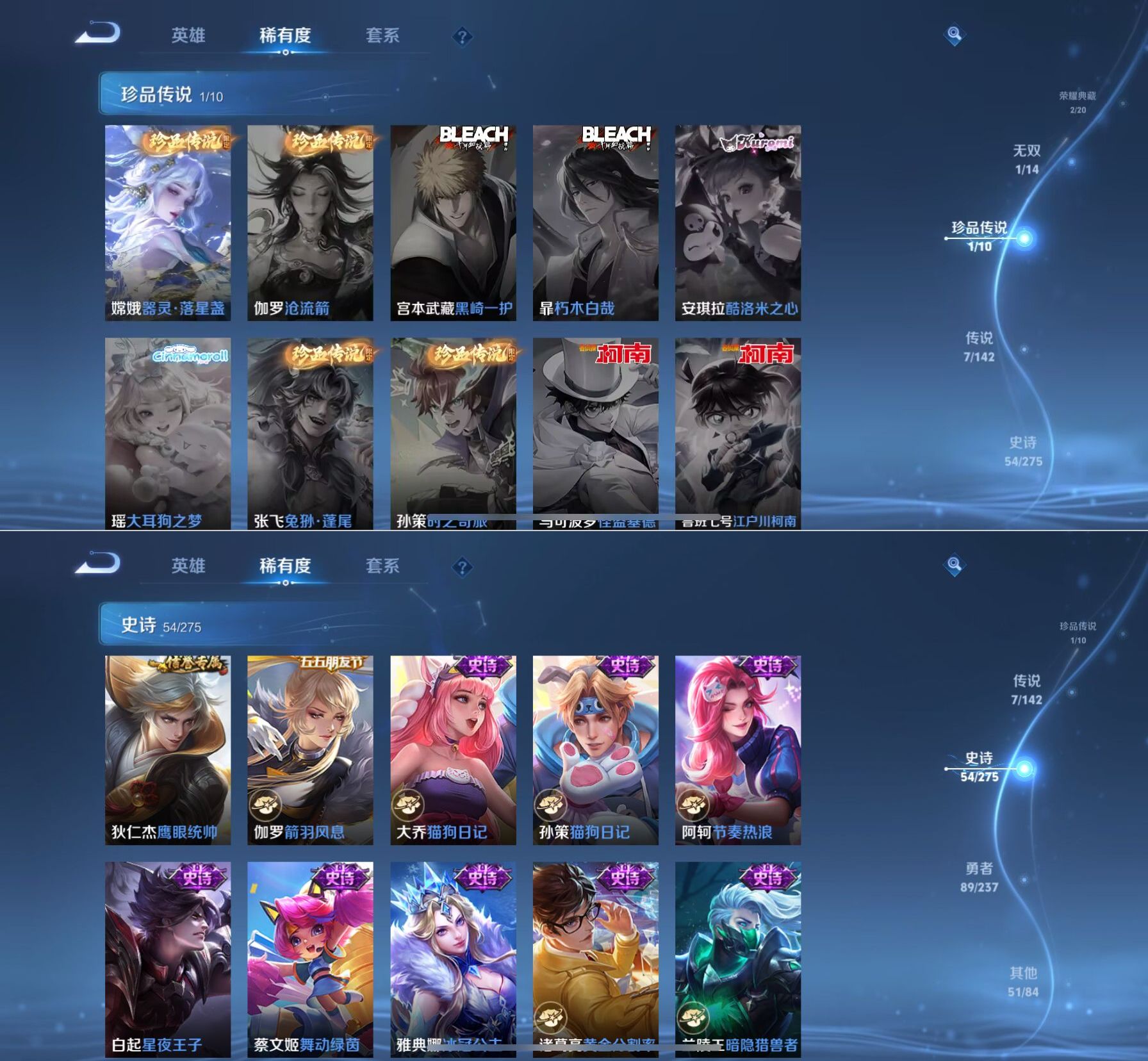 贵族等级:v7皮肤数:205传说品质7 荣耀典藏2 珍品传说1 生肖限定2 无双1 英雄数:127