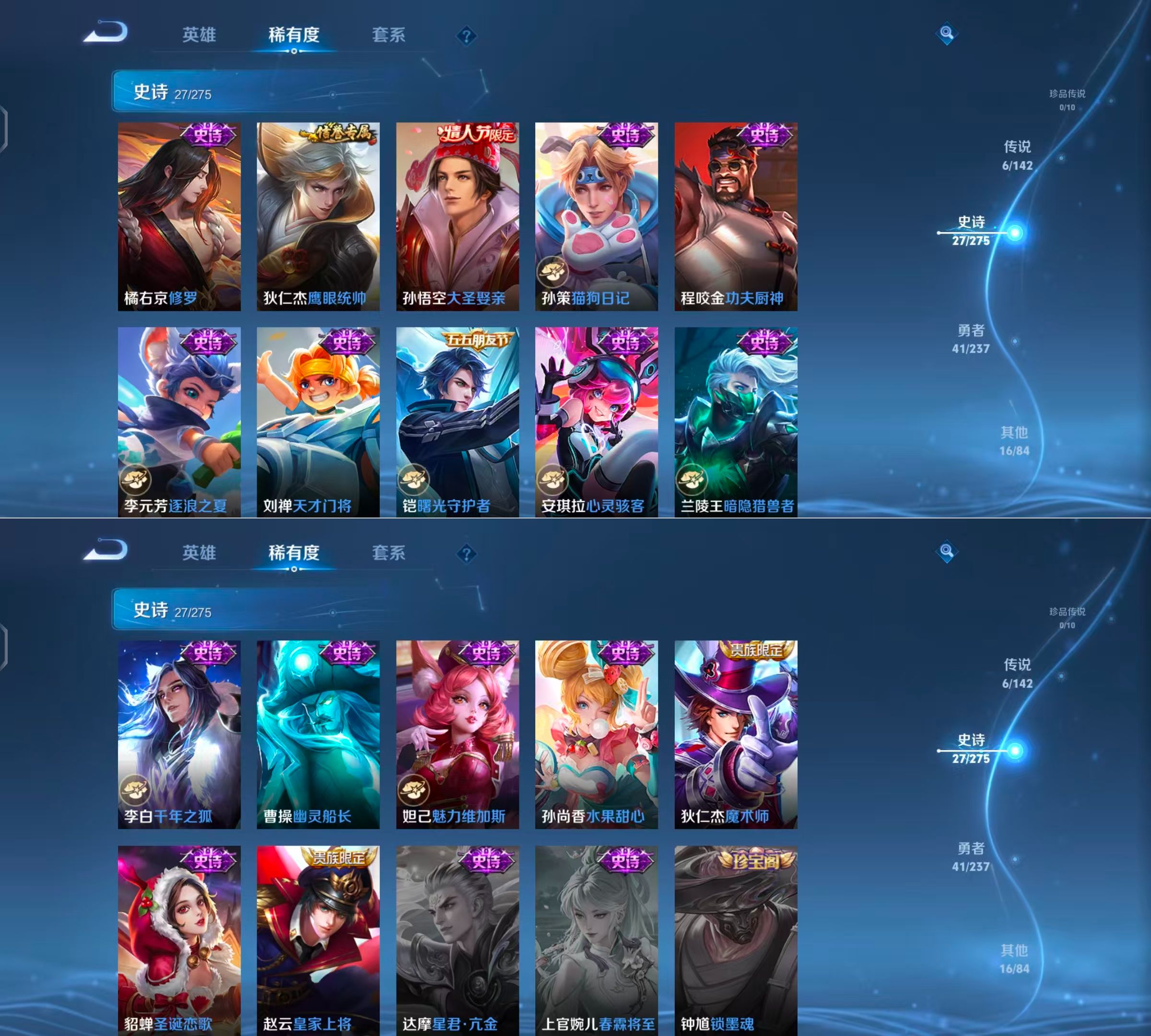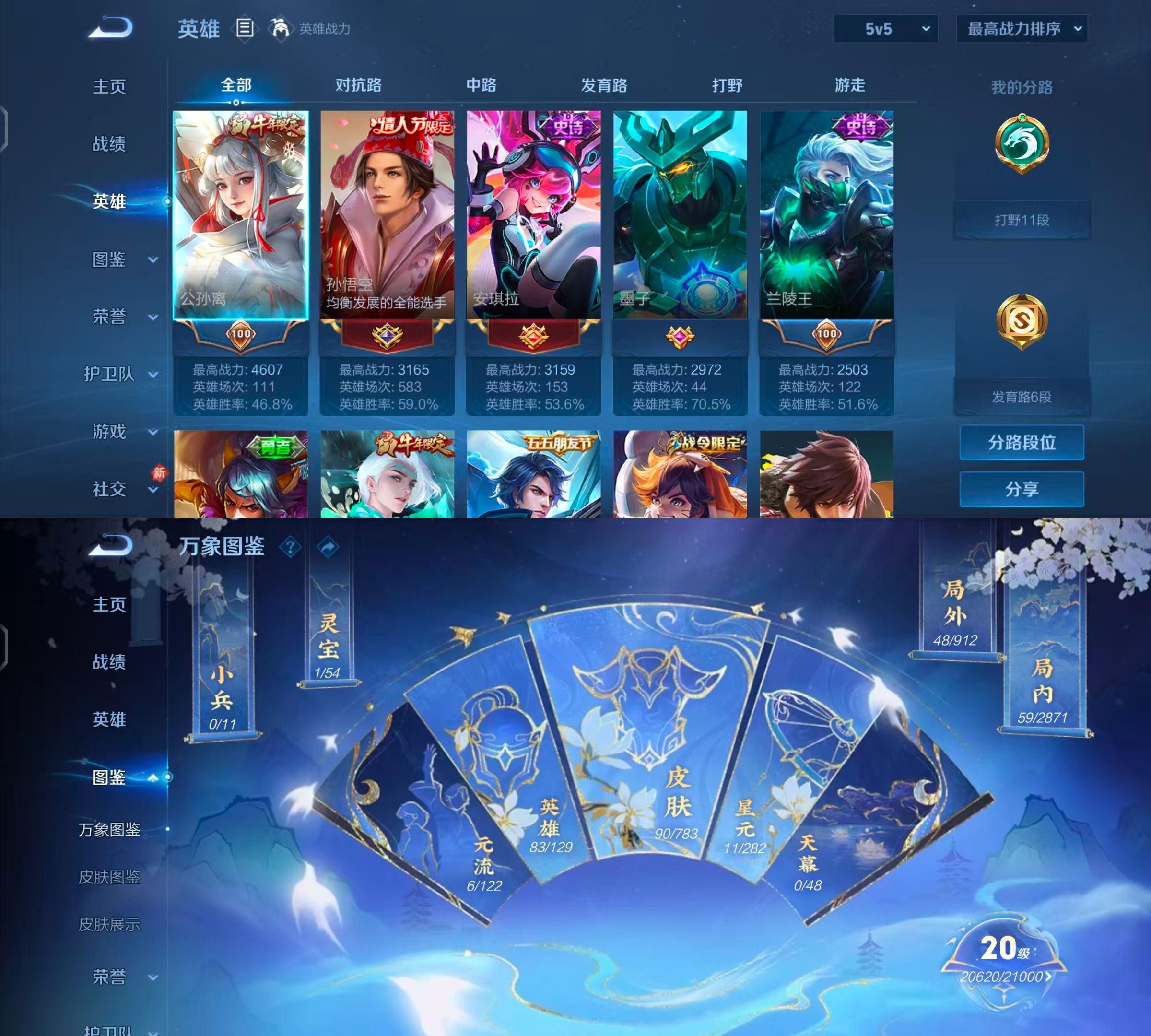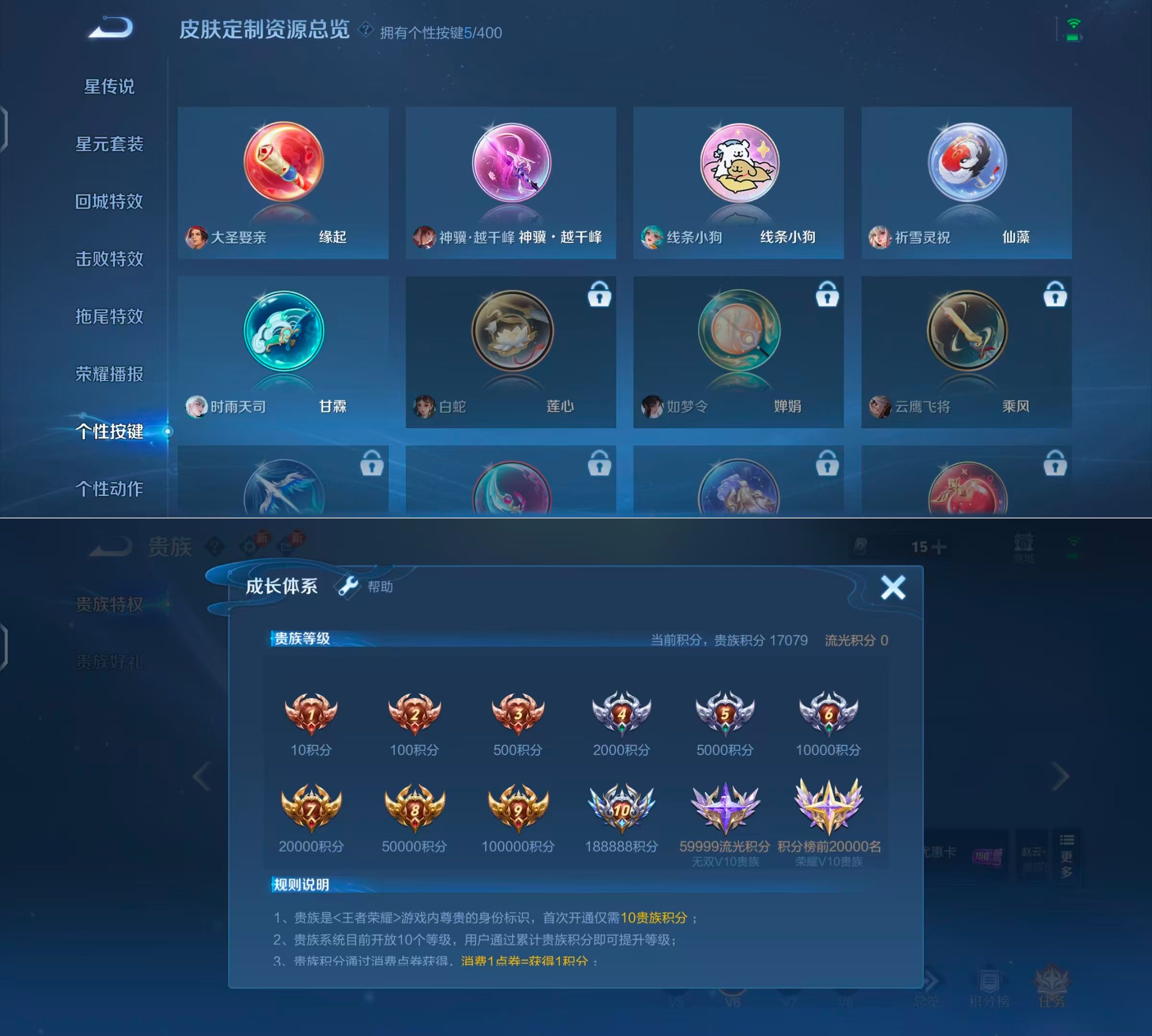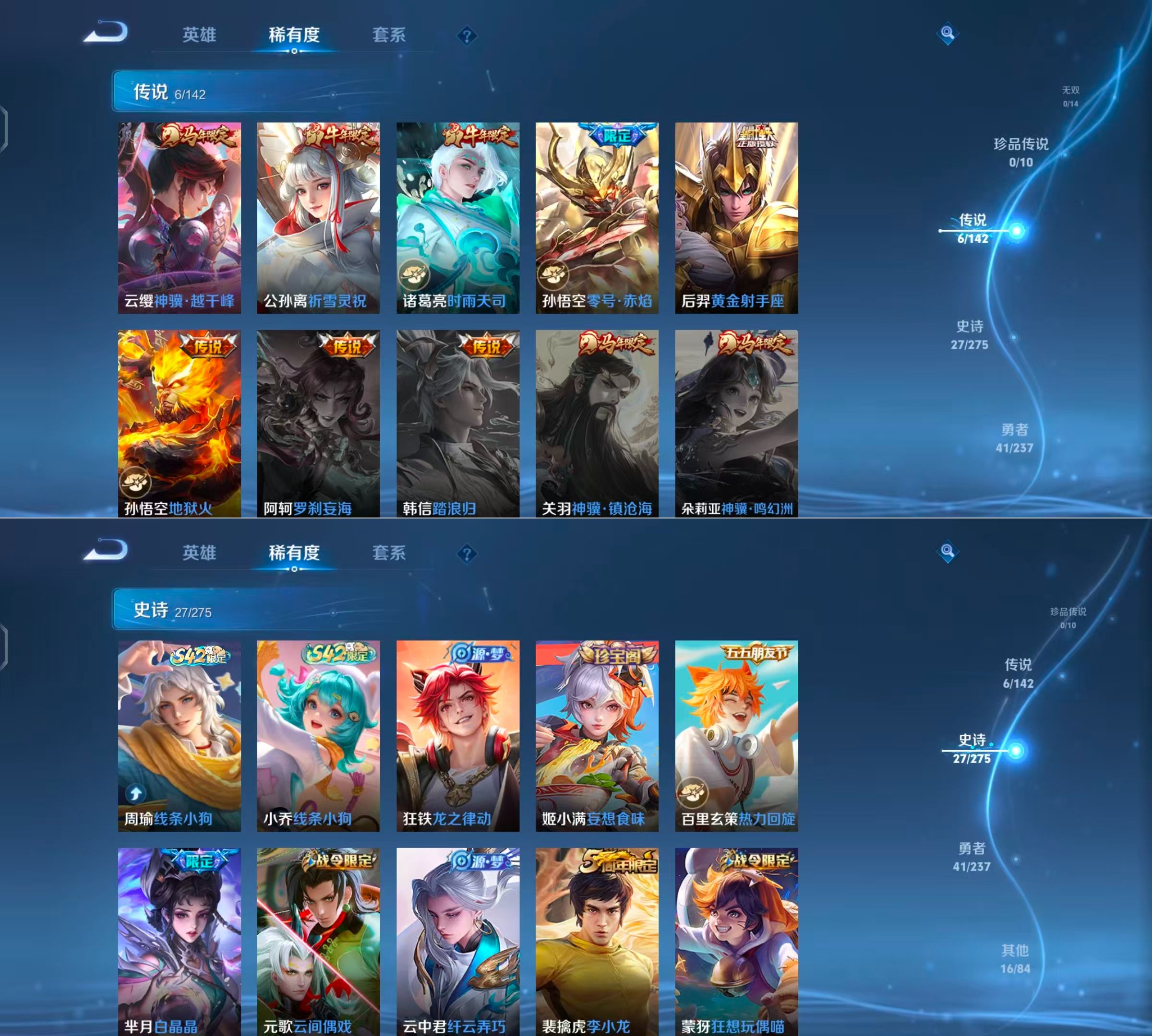 贵族等级:v6皮肤数:90传说品质6 生肖限定3 情人节限定1 英雄数:83