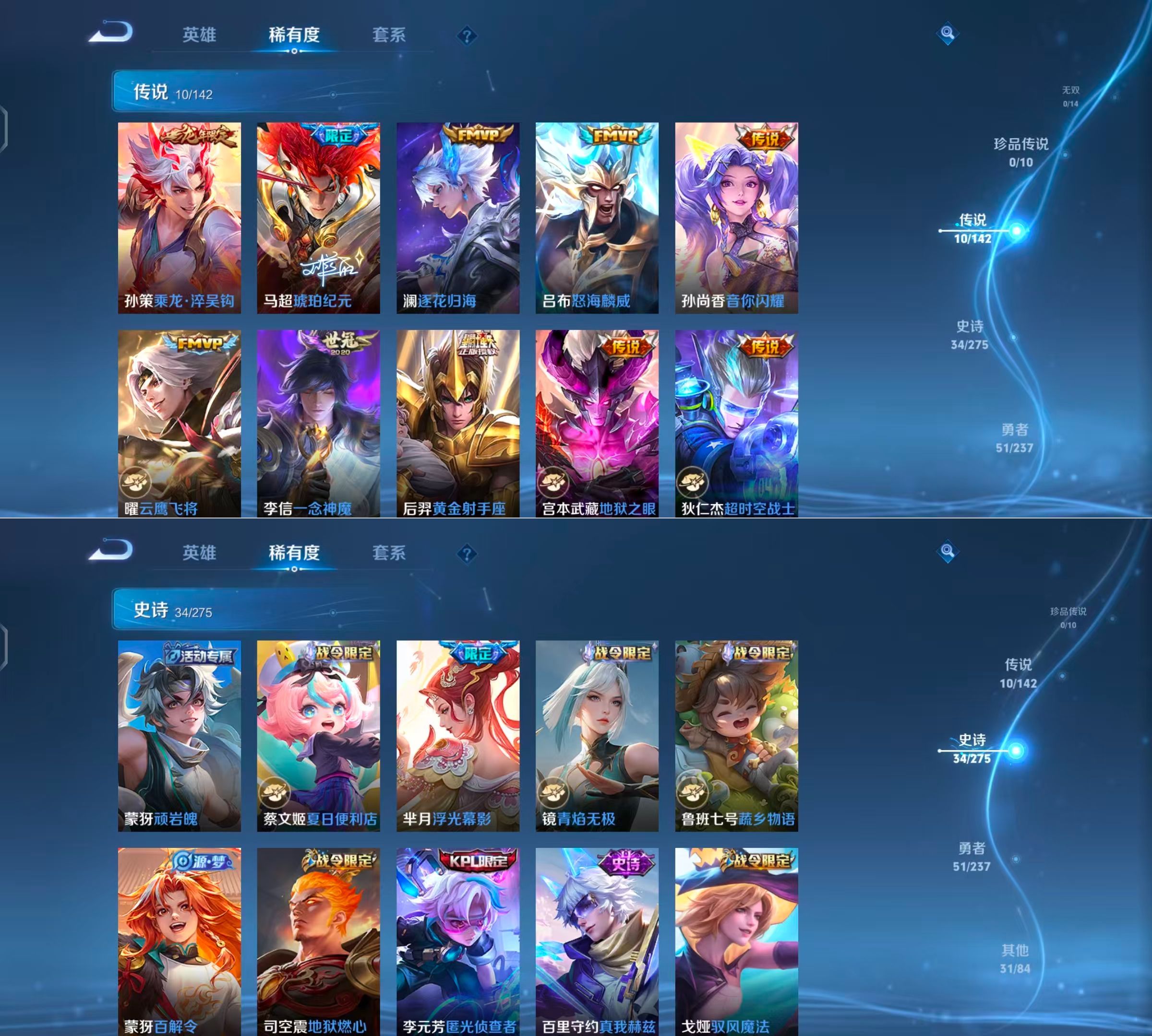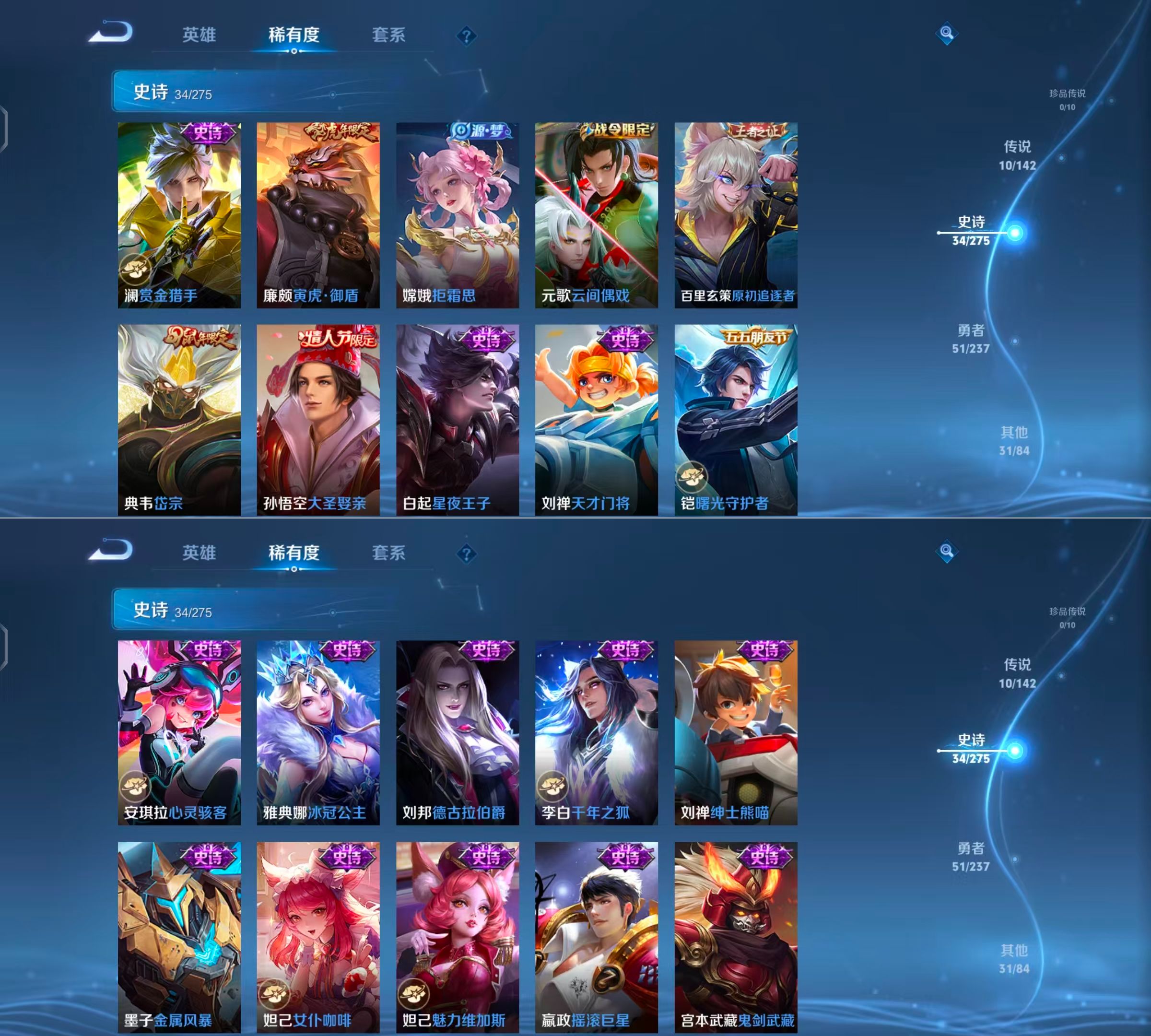 贵族等级:v7皮肤数:126传说品质10 生肖限定3 情人节限定1 英雄数:120