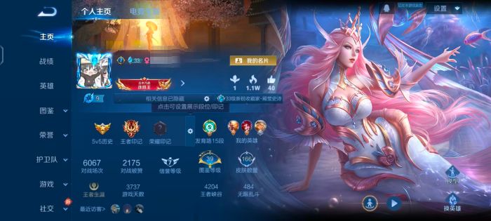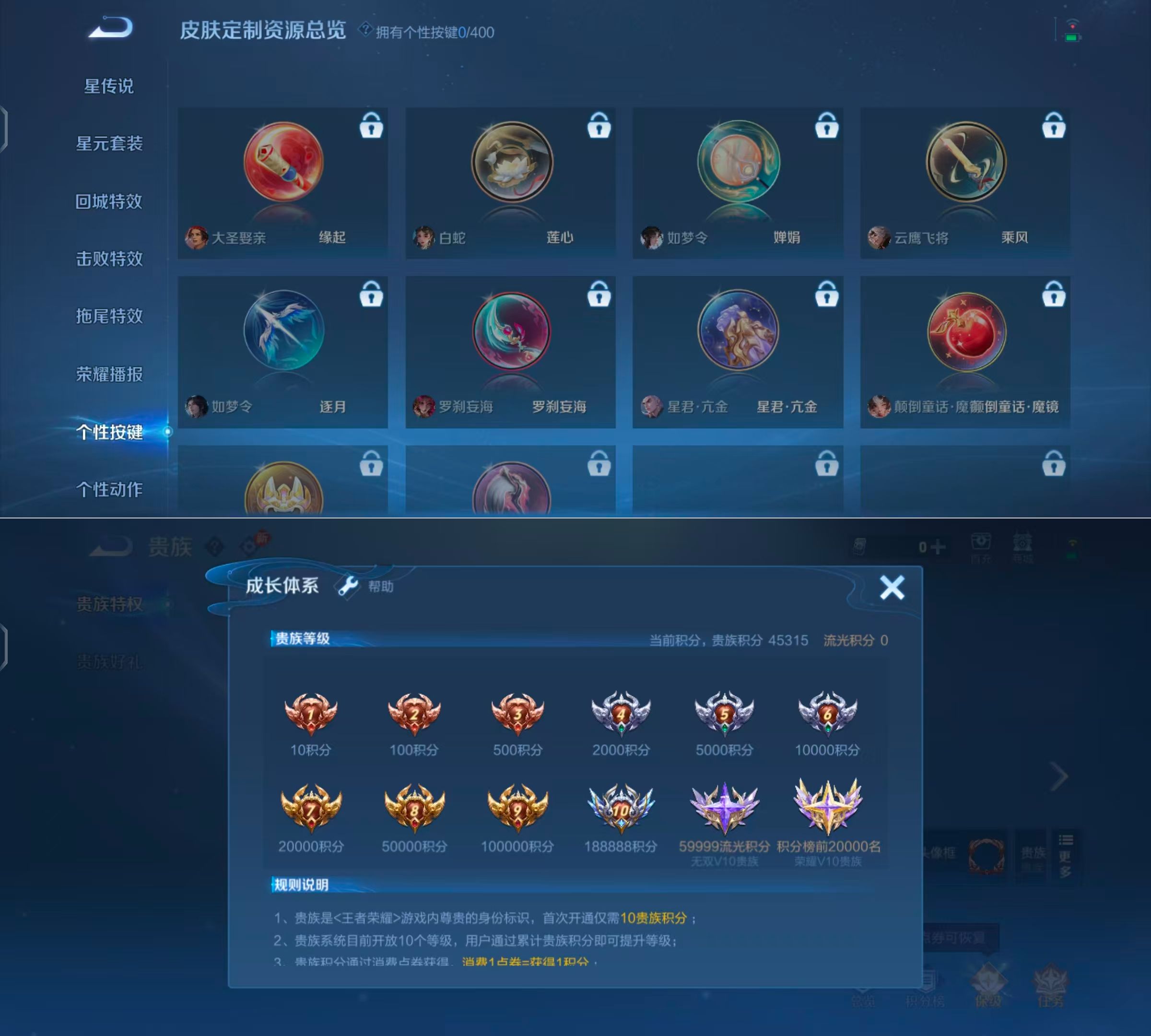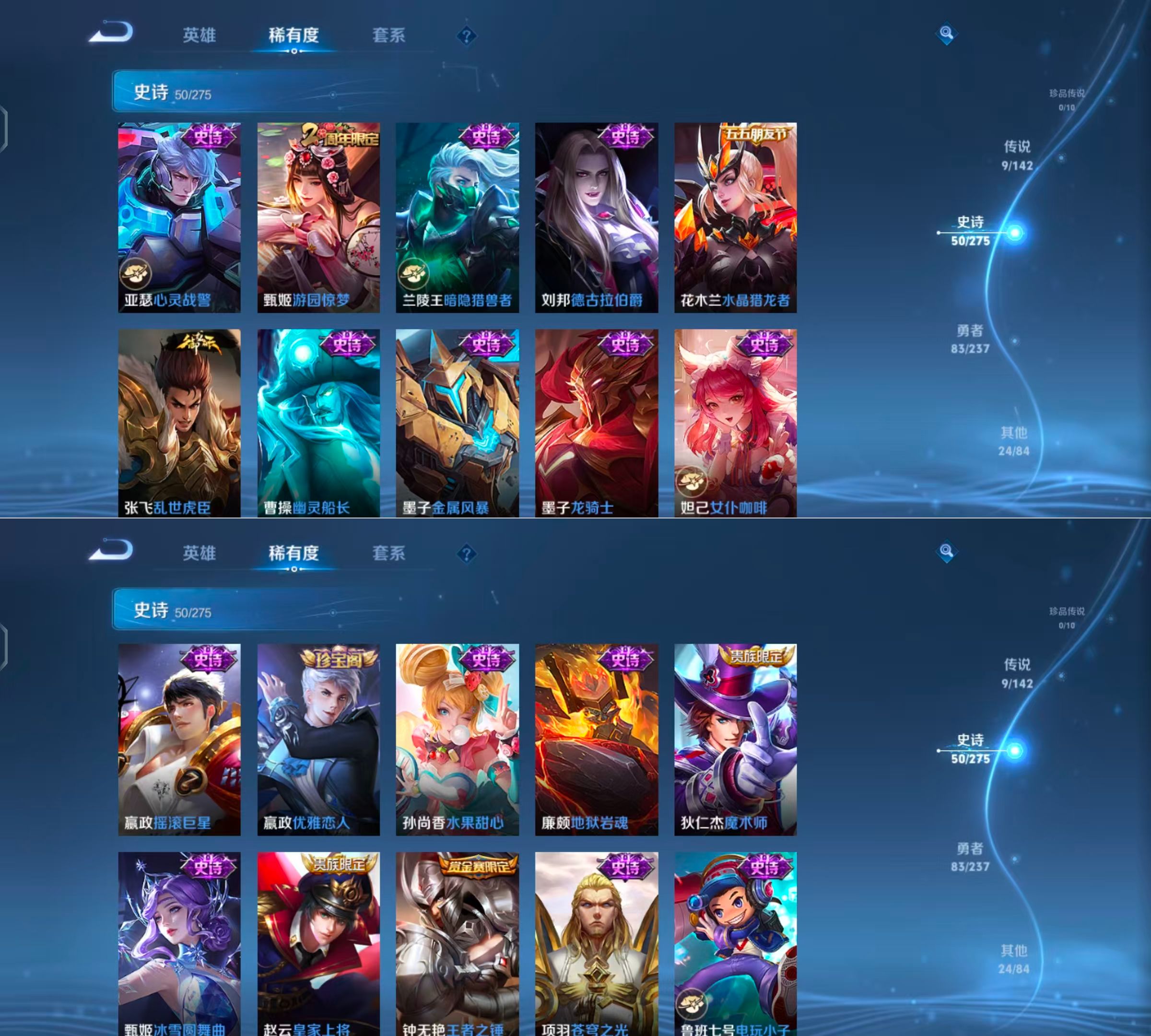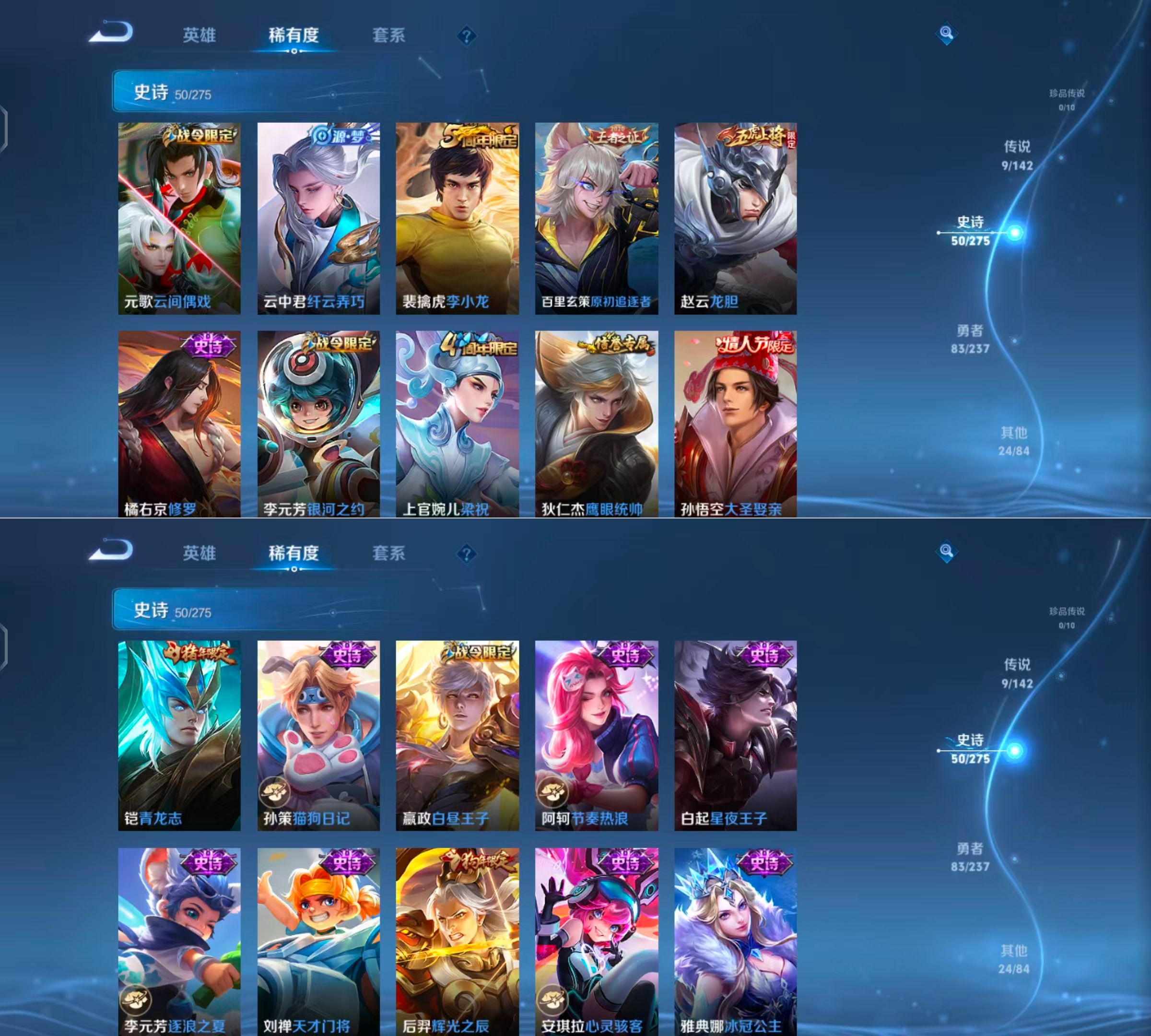 贵族等级:v7皮肤数:166生肖限定6 情人节限定1 传说品质9 英雄数:128