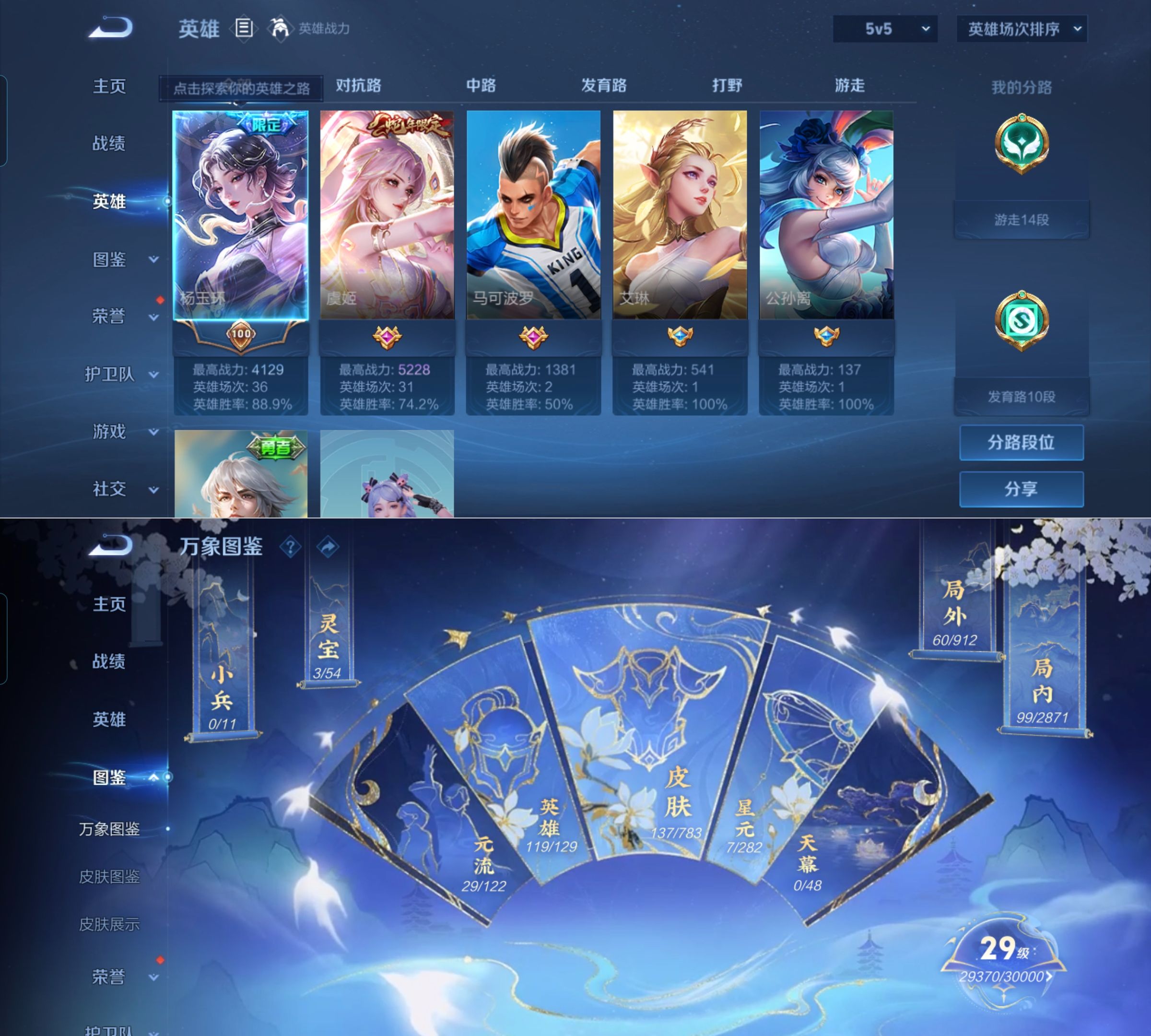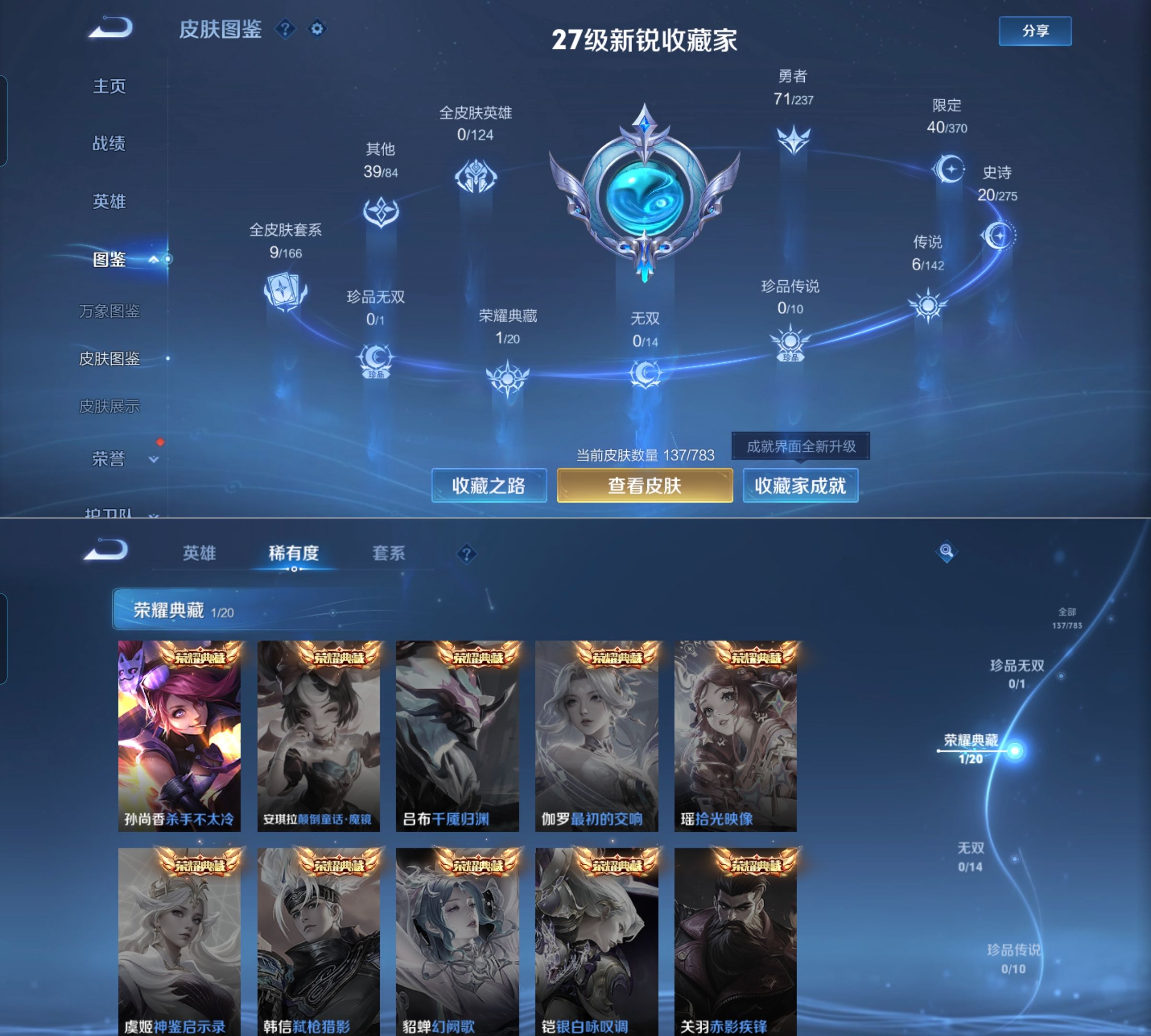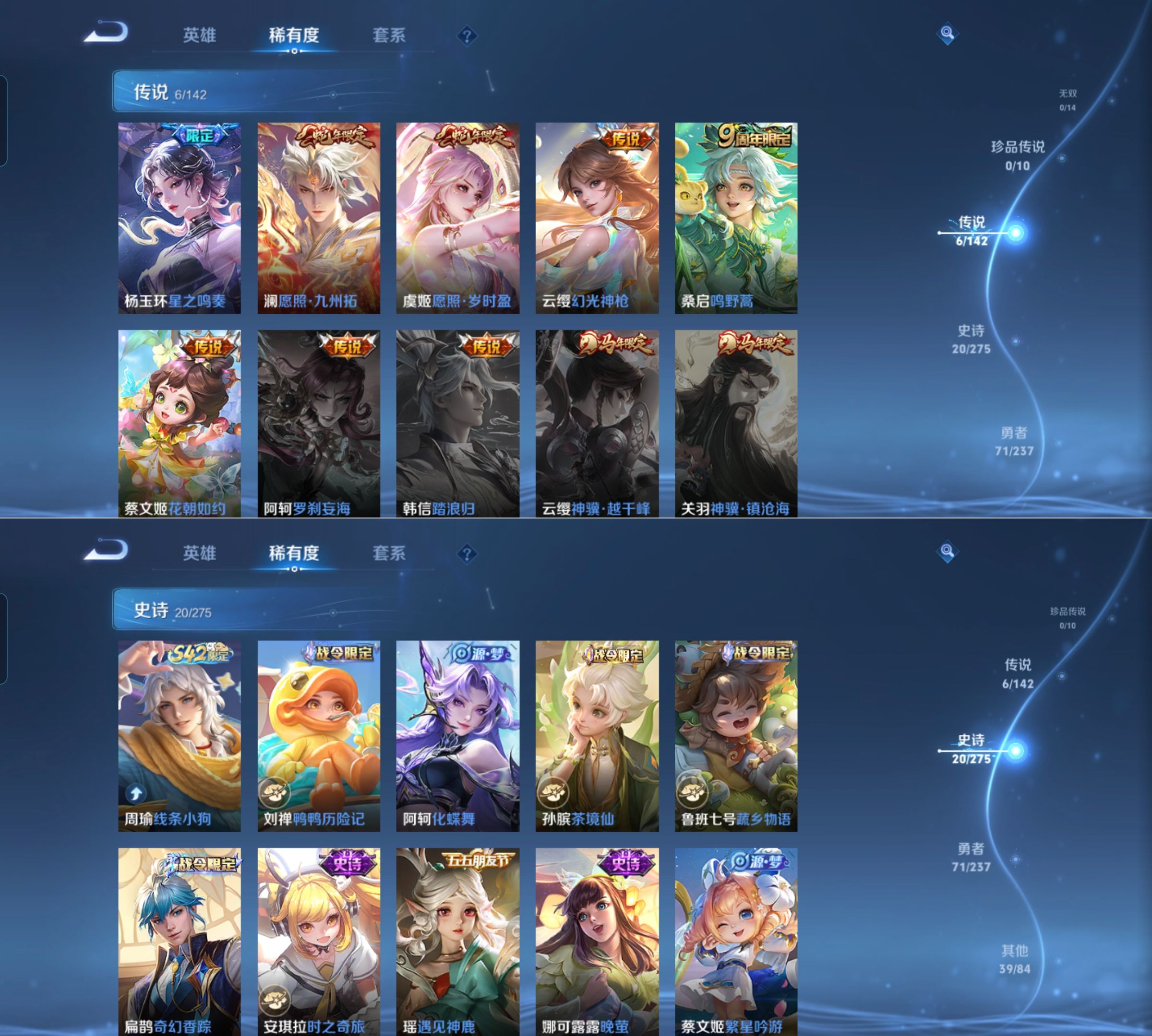 贵族等级:v7皮肤数:139传说品质6 生肖限定2 荣耀典藏1 英雄数:119