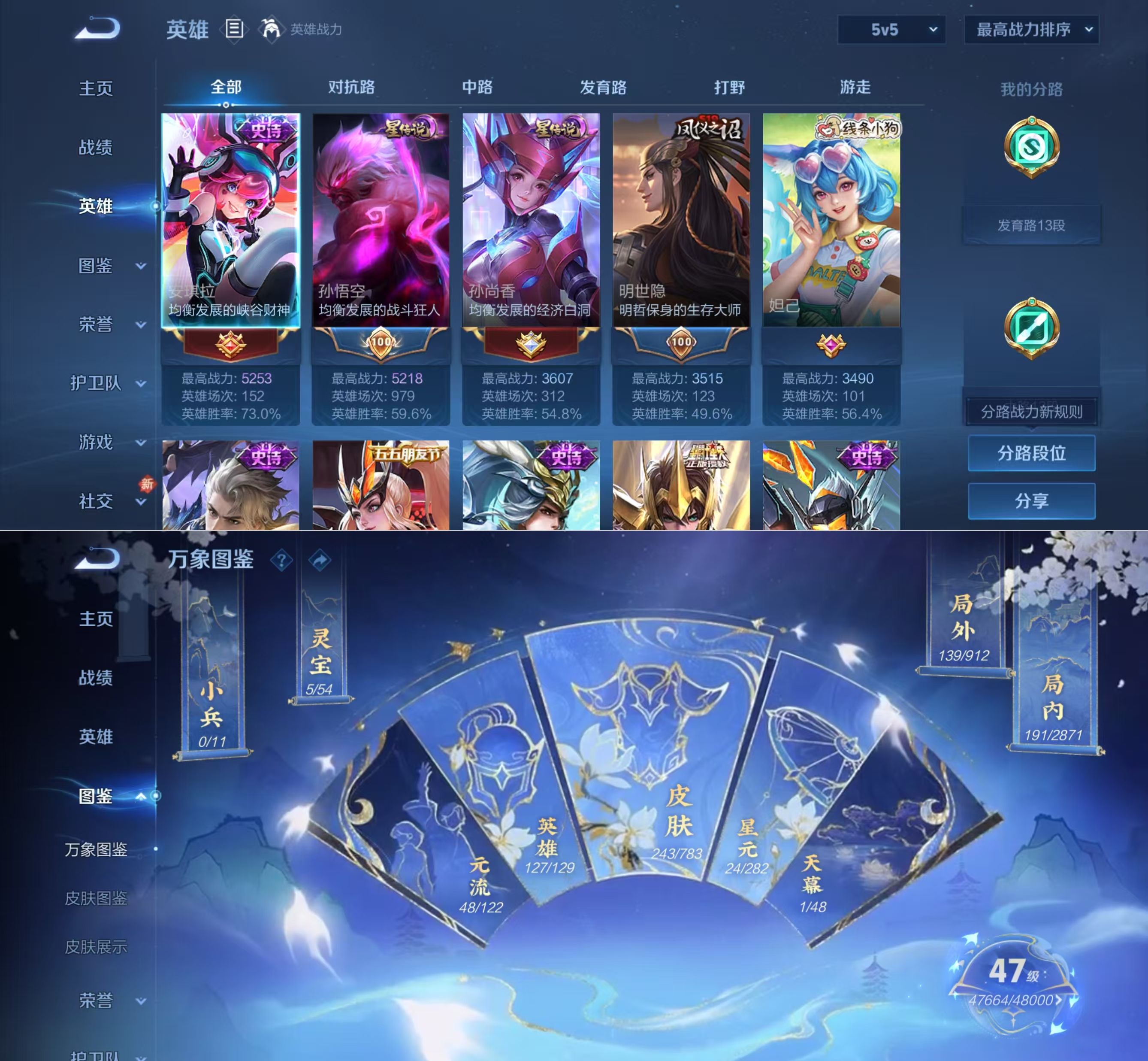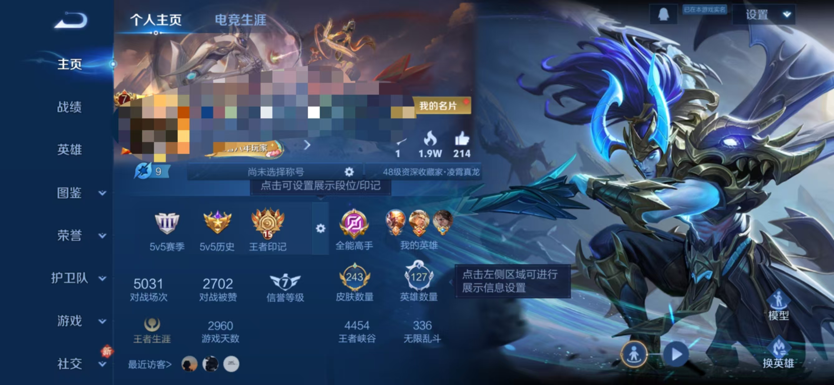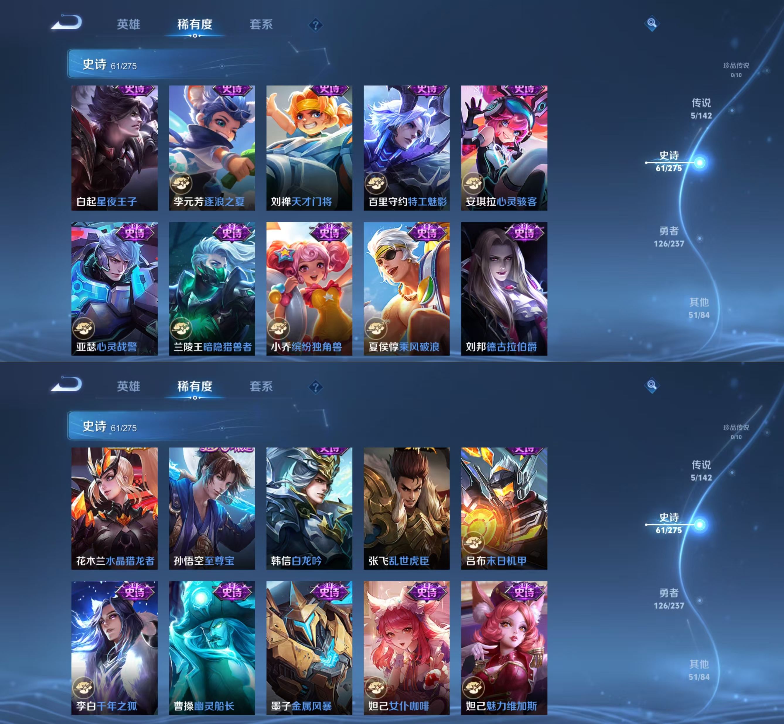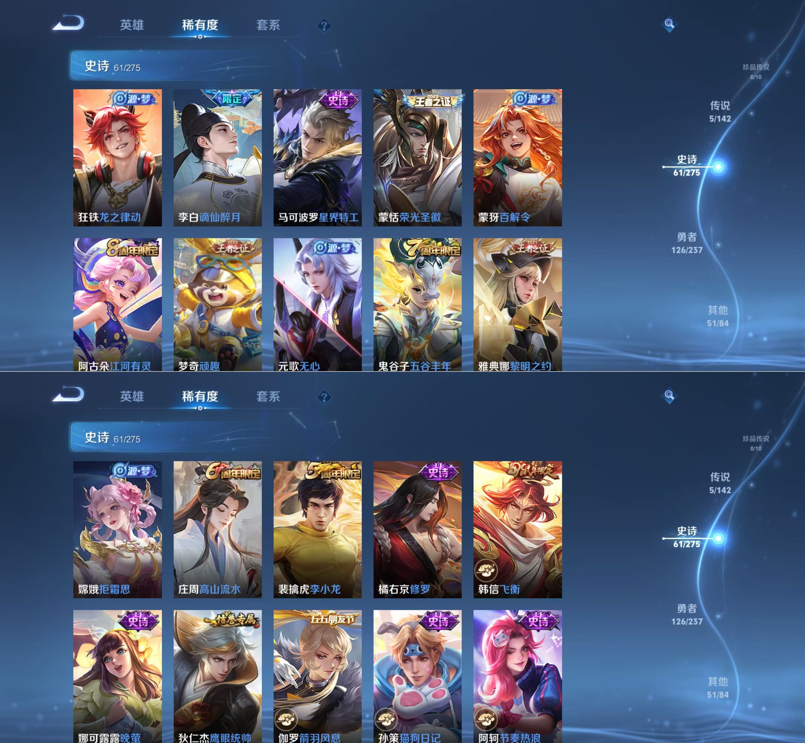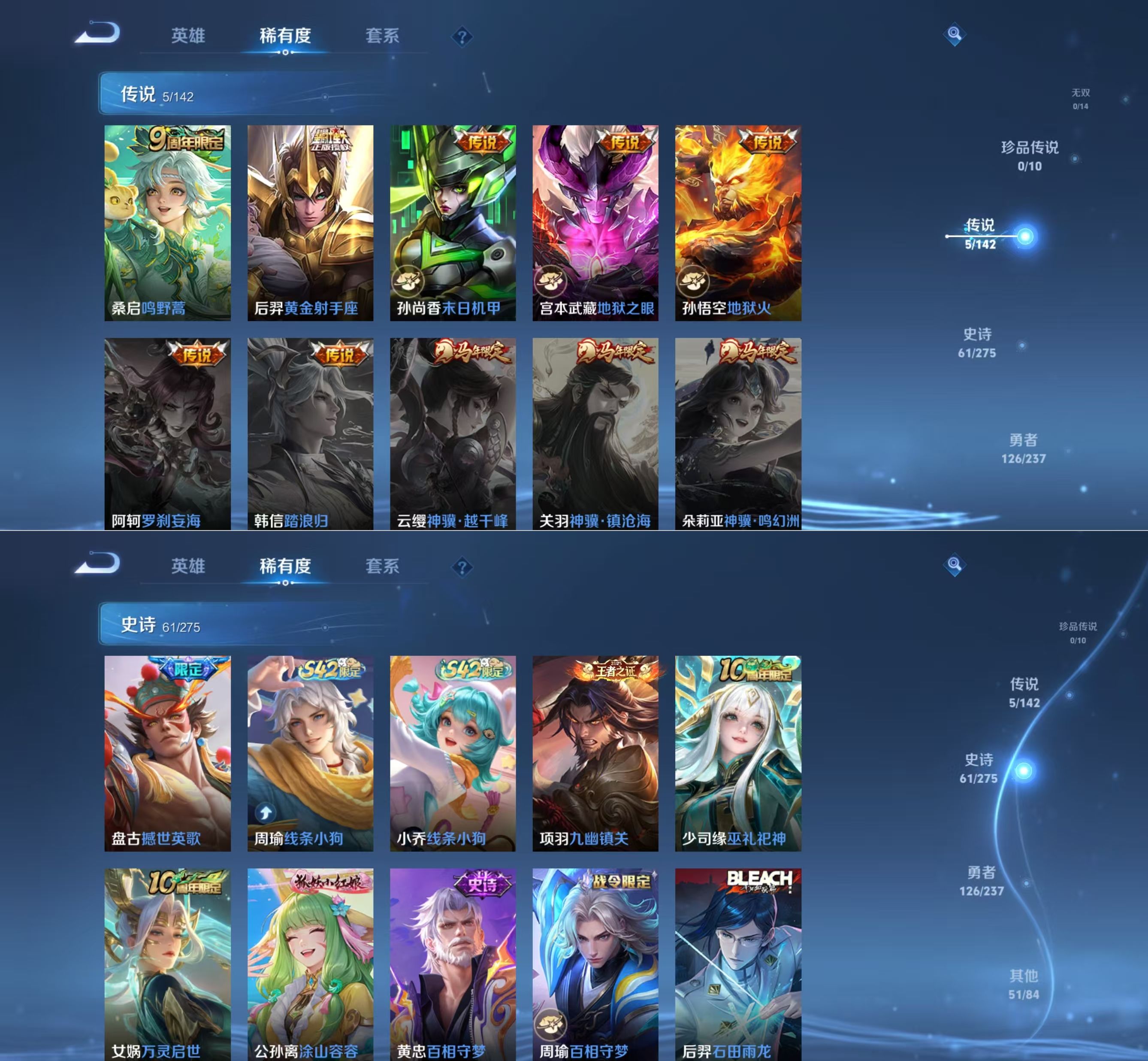 贵族等级:v7皮肤数:243传说品质5 情人节限定1 生肖限定1 英雄数:127