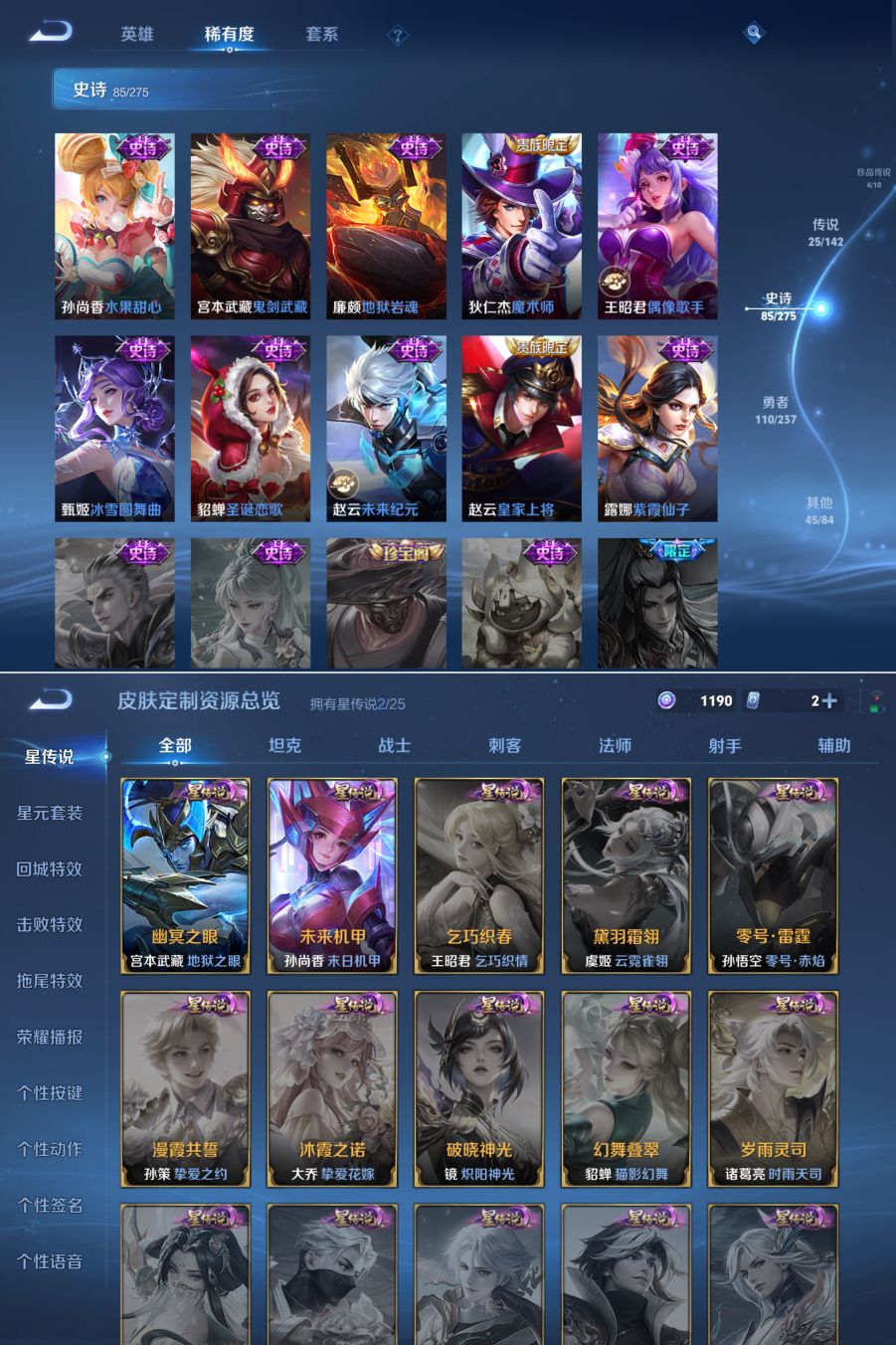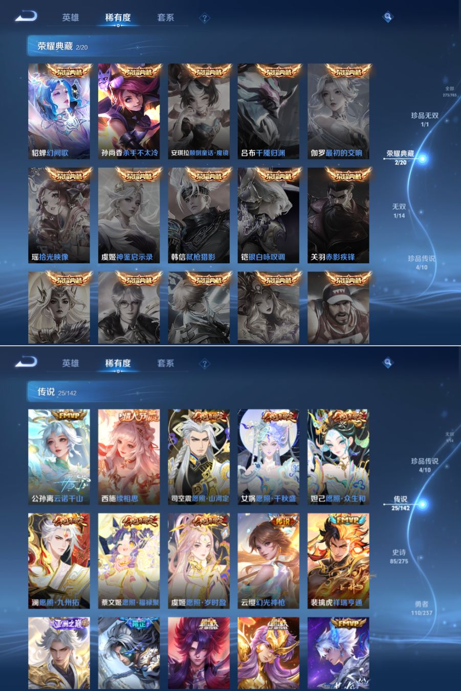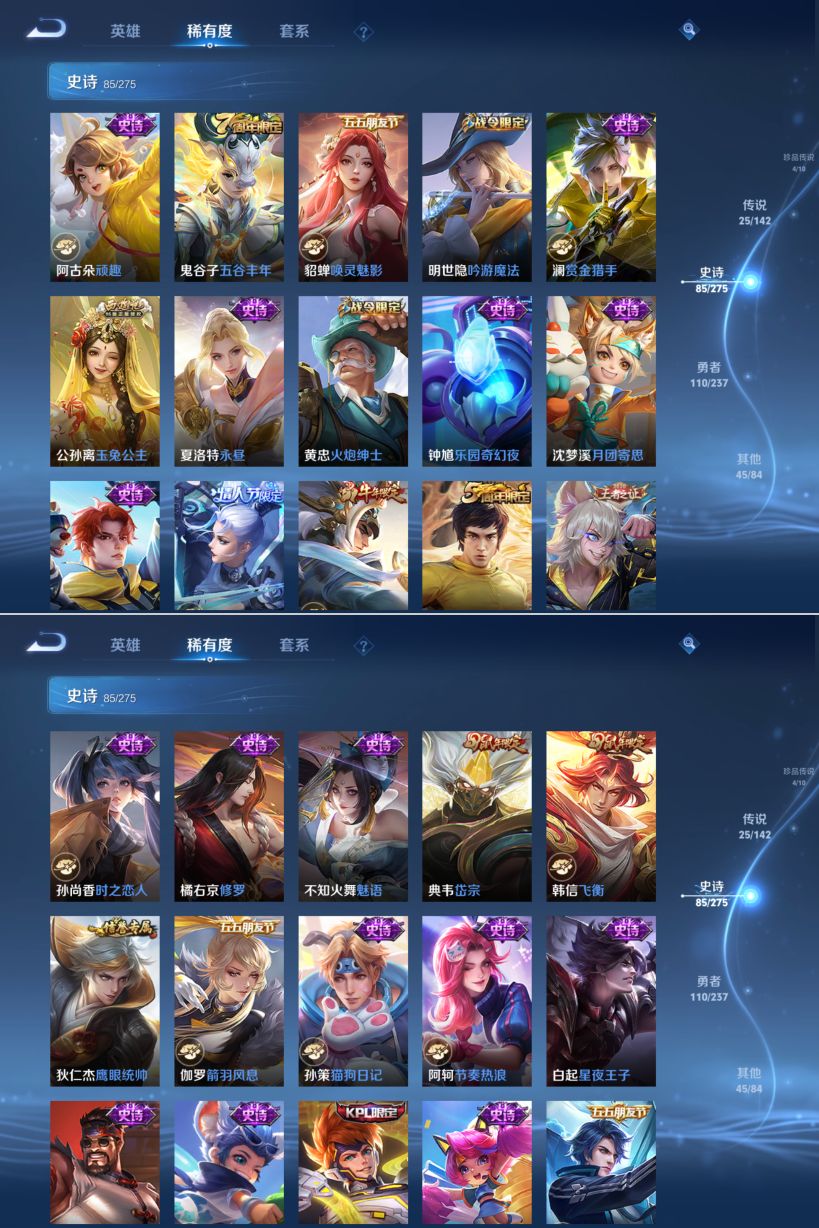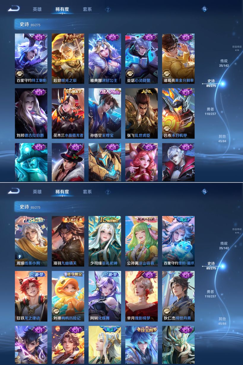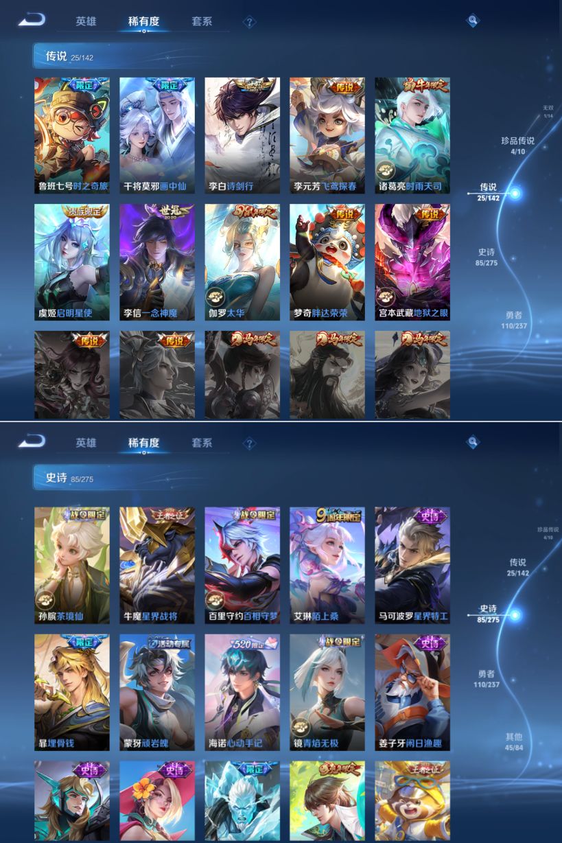 贵族等级:v9皮肤数:273生肖限定13 传说品质25 情人节限定3 荣耀典藏2 珍品无双1 珍品传说4 无双1 英雄数:128